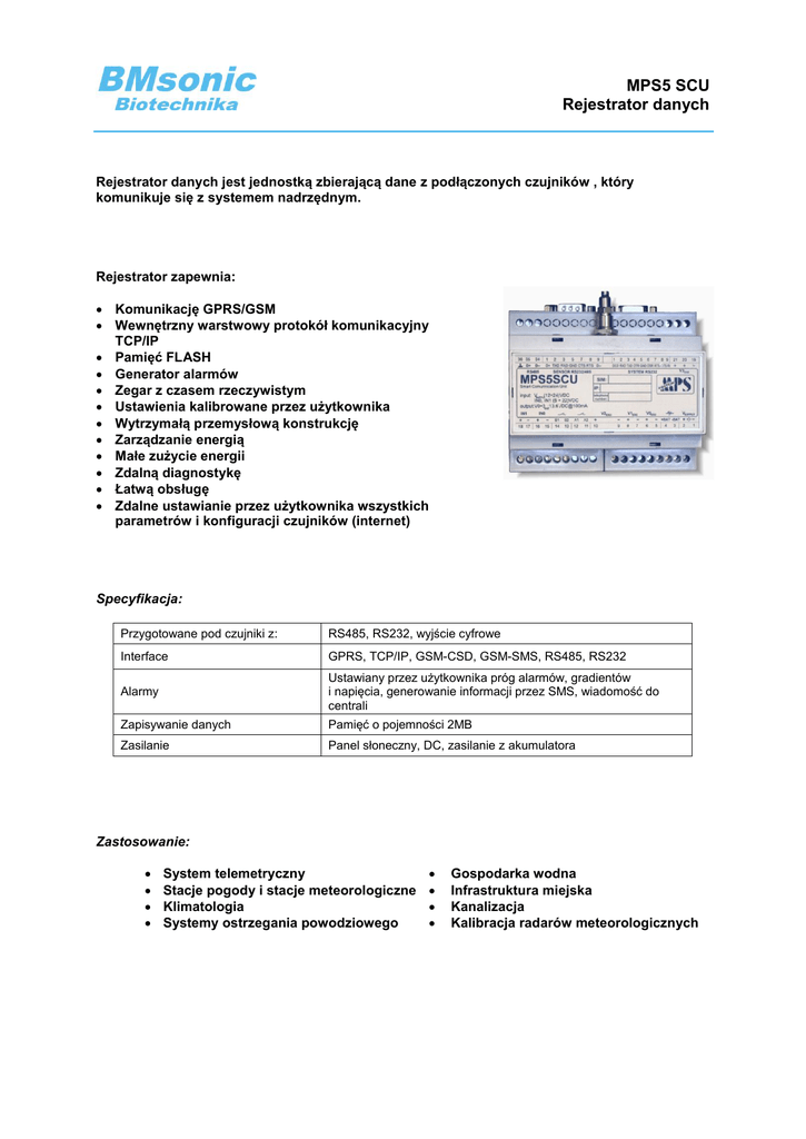 MPS5 SCU Rejestrator danych Rejestrator danych jest jednostką zbierającą dane z podłączonych czujników , który komunikuje się z systemem nadrzędnym. Rejestrator zapewnia: Komunikację GPRS/GSM Wewnętrzny warstwowy protokół komunikacyjny TCP/IP Pamięć FLASH Generator alarmów Zegar z czasem rzeczywistym Ustawienia kalibrowane przez użytkownika Wytrzymałą przemysłową konstrukcję Zarządzanie energią Małe zużycie energii Zdalną diagnostykę Łatwą obsługę Zdalne ustawianie przez użytkownika wszystkich parametrów i konfiguracji czujników (internet) Specyfikacja: Przygotowane pod czujniki z: RS485, RS232, wyjście cyfrowe Interface GPRS, TCP/IP, GSM-CSD, GSM-SMS, RS485, RS232 Alarmy Ustawiany przez użytkownika próg alarmów, gradientów i napięcia, generowanie informacji przez SMS, wiadomość do centrali Zapisywanie danych Pamięć o pojemności 2MB Zasilanie Panel słoneczny, DC, zasilanie z akumulatora Zastosowanie: System telemetryczny Stacje pogody i stacje meteorologiczne Klimatologia Systemy ostrzegania powodziowego Gospodarka wodna Infrastruktura miejska Kanalizacja Kalibracja radarów meteorologicznych - Komunikacja GPRS GSM - Zasilanie oraz interfejs Multislot klasy 10, klasy B Wzmocnione AEC oraz redukcja szumów TCP/IP, SMTP, FTP, HTTP CSD max. 14.4 kbps SMS Zasilanie Zużycie energii Wejście cyfrowe Wyjście włącznika Interface 12÷24 VDC 2mA (stan uśpienia)/ 600ma (maksymalnie) 2x5÷22VDC 4xVCC@max. 100mA RS232 oraz RS485 Rerwis RS232 - Środowisko pracy - Mechanika Wymiary 105x90x58mm Waga ok. 100 g Zakres temperatury w czasie eksploatacji Zakres wilgotności w czasie eksploatacji Zakres temperatur podczas przechowywania Stopień zabezpieczenia -35°C÷+70°C max. 85% -50°C÷+85°C IP30 Okablowanie: Sygnał Zasilanie plus Zasilanie minus Akumulator plus Akumulator minus RS485 plus RS485 minus Wyjście włącznika 0÷3 Wejście cyfrowe 0 Wejście cyfrowe 1 Wyjście kontaktowe 0 Wyjście kontaktowe 1 2x RS232 Antena Symbol Vcc GND +BAT -BAT D+ DVEXC0÷3 IN0 IN1 A12 B12 DE9 ANT Numer 2 1 4 3 35 34 6,8,10,21 15,16 17,18 11,12 13,14 FME Wymiary: BMsonic Biotechnika s.c. tel. +48 22 666 96 80 ul. Krzywa 30 fax. +48 22 751 37 37 05-092 Łomianki mob. +48 662 699 887 www.bmsonic.waw.pl email: [email protected]