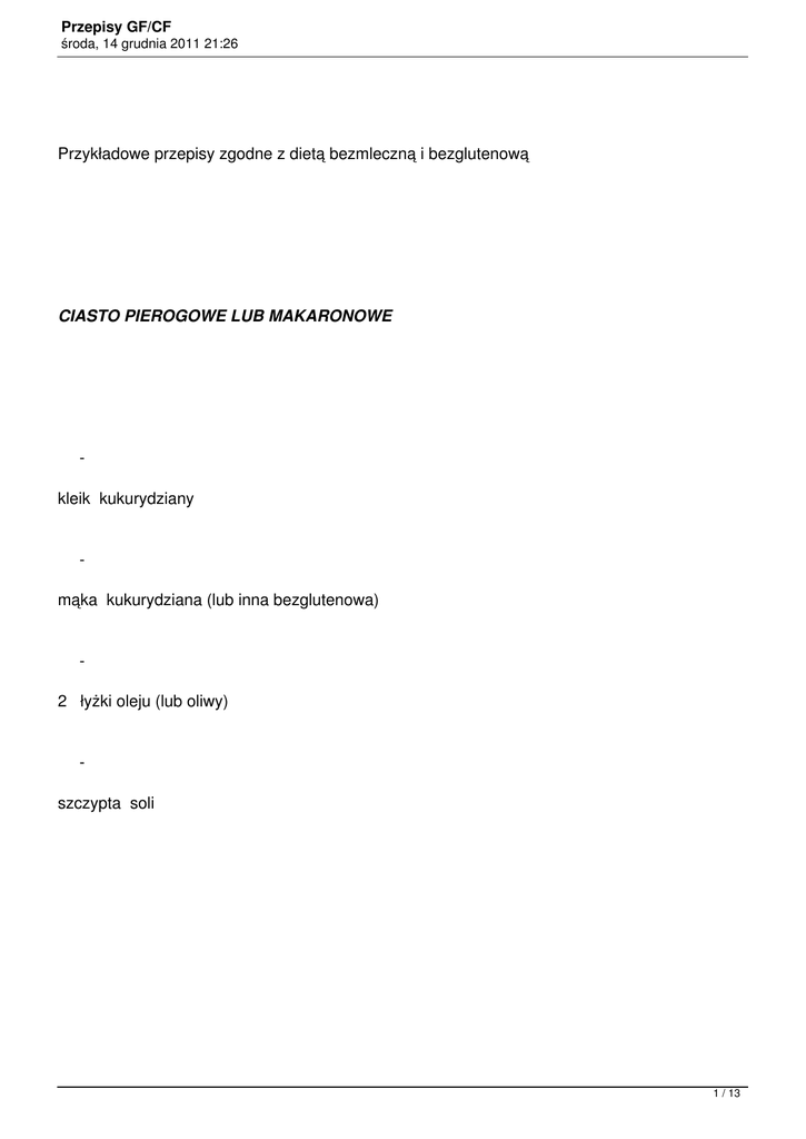 Przepisy GF/CF środa, 14 grudnia 2011 21:26 Przykładowe przepisy zgodne z dietą bezmleczną i bezglutenową CIASTO PIEROGOWE LUB MAKARONOWE kleik kukurydziany mąka kukurydziana (lub inna bezglutenowa) 2 łyżki oleju (lub oliwy) szczypta soli 1 / 13 Przepisy GF/CF środa, 14 grudnia 2011 21:26 Sporządzić 200 ml kleiku kukurydzianego na wodzie wg przepisu na opakowaniu. Do powstałej mieszanki dodać mąkę kukurydzianą bądź bezglutenową 1,5 szklanki. 2 łyżki oleju bądź oliwy + szczypta soli. Zagnieść ciasto, do momentu aż nie będzie się kleiło do blatu, można podsypywać mąką jeśli się klei. GUACAMOLE 1 dojrzałe awokado 1 mały ząbek czosnku, zmiażdżony ¾ łyżeczki świeżo wyciśniętego soku z cytryny mały pomidor posiekana kolendra lub pietruszka 2 łyżeczki nieprażonych pestek dyni 2 / 13 Przepisy GF/CF środa, 14 grudnia 2011 21:26 2 suszone pomidory namoczone w wodzie, pociętej na drobne kawałki 4 marynowane oliwki 1 łyżka posiekanej czerwonej papryki 1 łyżka posiekanej czerwonej cebuli 1 łyżeczka syropu z agawy przyprawa chili, sól, pieprz Zgnieć awokado widelcem na puree i wymieszaj w misce z pozostałymi składnikami. Jeśli użyjesz więcej awokado, możesz zmiksować je w robocie kuchennym. MAJONEZ 3 / 13 Przepisy GF/CF środa, 14 grudnia 2011 21:26 1 szklanka orzechów nerkowca namoczonych w wodzie przez 2 godziny 1/4 szklanki oleju lnianego 1/4 szklanki kalafiora 1/2 szklanki wody 3 łyżki stołowe świeżo wyciśniętego soku z cytryny 1łyżeczka musztardy 1 łyżeczka syropu z agawy 1 łyżeczka octu jabłkowego - 4 / 13 Przepisy GF/CF środa, 14 grudnia 2011 21:26 szczypta soli Kalafior i orzechy nerkowca zmiksuj w blenderze dodając wody aż uzyskasz kremistą konsystencję. Nadal miksując dolewaj stopniowo olej lniany. Dodaj pozostałe składniki i zmiksuj na gładką jednolitą konsystencję. MUS CZEKOLADOWY, CZYLI SPOSÓB NA SZYBKI I PYSZNY DESER 1awokado obrane i odpestkowane 1/4 szklanki wody ½ szklanki kakao 2/3 szklanki syropu z agawy 5 / 13 Przepisy GF/CF środa, 14 grudnia 2011 21:26 Przełóż wszystkie składniki do blendera i zmiksuj na krem. Dodaj trochę więcej wody jeśli jest taka potrzeba. Możesz przyozdobić listkiem mięty. Możesz zamrozić w foremkach od lodów i w ten sposób uzyskać przepyszne batoniki czekoladowe lub wykorzystać jako polewę do ciasta i tortu. SZARLOTKA JAGLANO-RYŻOWA Ciasto ładnie się piecze i nie rozpada przy krojeniu. Ma ładny, delikatny kolorek od kurkumy, wygląda jak zwykła szarlotka. 1/2 szklanki kaszy jaglanej szczypta soli 1/8 łyżeczki kurkumy 1/3 szklanki oleju 6 / 13 Przepisy GF/CF środa, 14 grudnia 2011 21:26 1 1/2 szklanki mąki ryżowej 2 płaskie łyżeczki cynamonu 4-5 jabłek ok. 1/2 – 2/3 szklanki rodzynek Zagotować 1,5 szklanki wody, dodać kaszę z solą i kurkumą, gotować na maleńkim ogniu przez ok. 40 min. Dodać olej, zmiksować na gładką masę. Dodać 1/2 szklanki mąki ryżowej, wystudzić. Dodać pozostałą mąkę, cynamon, wymieszać. Wysmarować blachę olejem. Odłożyć 1/3 ciasta na potem, resztą wylepić dno i boki foremki, wysypać na to rodzynki (powinny cienką warstwą pokryć dno), wyłożyć starte na tarce jabłka, na to zetrzeć resztę ciasta. Piec w średnio nagrzanym piekarniku. 7 / 13 Przepisy GF/CF środa, 14 grudnia 2011 21:26 CIASTECZKA MARCHEWKOWE Z KASZY JAGLANEJ 1/2 szklanki kaszy jaglanej 10 dag wiórków kokosowych 35 dag drobno startej marchwi 1/5 szklanki oleju 1 czubata łyżeczka cynamonu szczypta soli 3 czubate łyżki mąki ryżowej - 8 / 13 Przepisy GF/CF środa, 14 grudnia 2011 21:26 3/4 szklanki rodzynek Gotować kaszę z solą w 1 1/2 szklanki wrzątku na małym ogniu przez 40 min. Dodać olej, zmiksować krótko ręcznym mikserem, wystudzić. Dodać startą marchew, wiórki, cynamon, mąkę, ponownie krótko zmiksować. Dodać rodzynki, wymieszać. Formować placuszki o grubości do 0,5 cm, układać na wysmarowanej olejem blaszce, piec do zrumienienia spodów w średnio nagrzanym piekarniku. KRUCHE CIASTKA szklanka mąki kukurydzianej łyżka ksylitolu, 5 łyżek oliwy z oliwek - 9 / 13 Przepisy GF/CF środa, 14 grudnia 2011 21:26 5 łyżek wody nieco cynamonu Wszystkie składniki wymieszać i zagnieść, jeśli ciasto się nie klei, dodać trochę więcej wody i oliwy. Rozwałkować i wykroić ciasteczka. Piec w nagrzanym pierkarniku (ok. 150 st) przez ok. 15 – 20 min. Gdy wystygną, są trochę twarde, najlepiej poczekać i zajadać się następnego dnia. KULECZKI KOKOSOWE -BEZ PIECZENIA inulina (cukier prebiotyczny) wiórki kokosowe 10 / 13 Przepisy GF/CF środa, 14 grudnia 2011 21:26 3 części wiórek kokosowych (lub zmielonych migdałów, siemienia lnianego, posiekanego słonecznika czy innych bakalii) i 1 część inuliny mieszamy na sucho i dodajemy do tego odrobinę wody mineralnej lub przegotowanej. Z tego uformować kulki o średnicy około 1-2 cm i odstawić na trochę, aby związało. DŻEM BEZ CUKRU jabłko lub gruszka lub banany lub inne owoce (np. brzoskwinie) Pokroić owoce w kawałki i zagotować w małej ilości wody. Od razu zmiksować, napełnić słoiki i odstawić do wystygnięcia. Przechowywać w lodowce 10-14 dni. MLEKO JAGLANE 11 / 13 Przepisy GF/CF środa, 14 grudnia 2011 21:26 2/3 szkl. ugotowanej, ciepłej kaszy jaglanej 1/4 szkl. migdałów zmielonych na puder 1 łyżeczka soli 1 łyżka ksylitolu 1 szkl. wody Wszystkie składniki zmiksować i w trakcie miksowania dodać jeszcze 2 szklanki wody. Można przecedzić przez gęste sito lub gazę. GOFRY BEZGLUTENOWE BEZ JAJEK 12 / 13 Przepisy GF/CF środa, 14 grudnia 2011 21:26 ¾ szklanki mąki z amarantusa ¼ szklanki mąki z tapioki proszek do pieczenia bezglutenowy ksylitol. Wymieszać z wodą, usmażyć 13 / 13