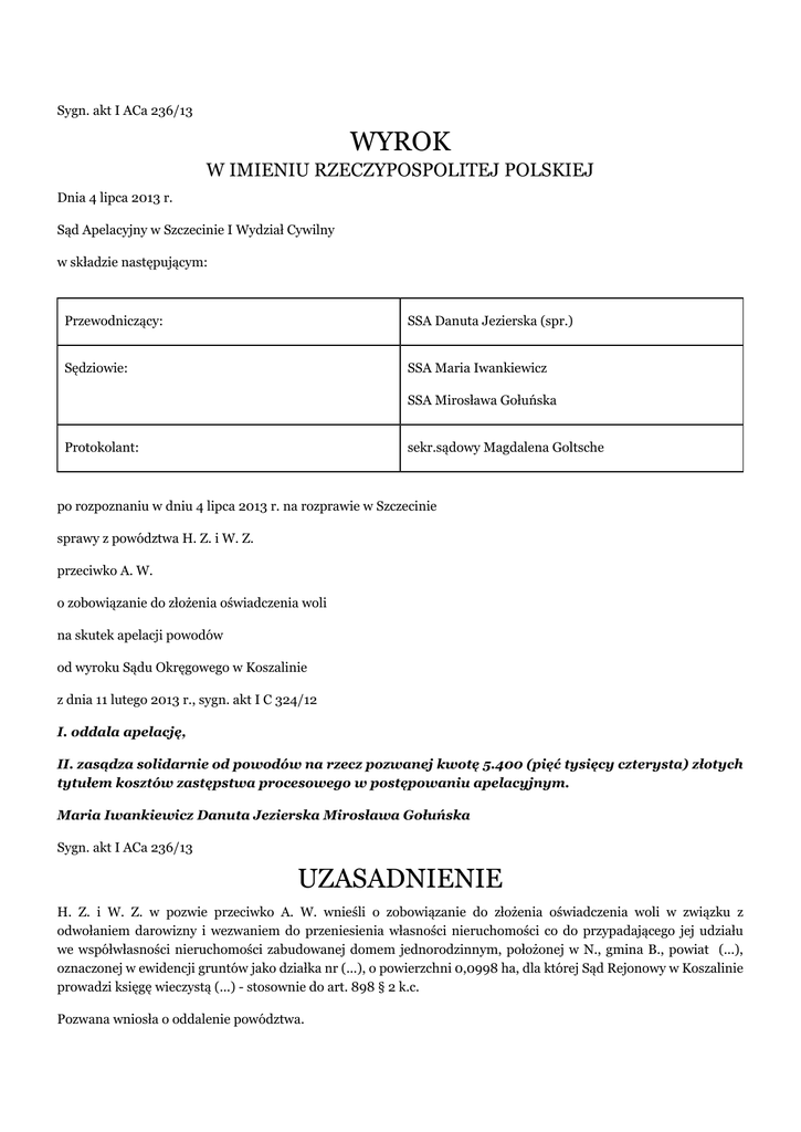 Sygn. akt I ACa 236/13 WYROK W IMIENIU RZECZYPOSPOLITEJ POLSKIEJ Dnia 4 lipca 2013 r. Sąd Apelacyjny w Szczecinie I Wydział Cywilny w składzie następującym: Przewodniczący: SSA Danuta Jezierska (spr.) Sędziowie: SSA Maria Iwankiewicz SSA Mirosława Gołuńska Protokolant: sekr.sądowy Magdalena Goltsche po rozpoznaniu w dniu 4 lipca 2013 r. na rozprawie w Szczecinie sprawy z powództwa H. Z. i W. Z. przeciwko A. W. o zobowiązanie do złożenia oświadczenia woli na skutek apelacji powodów od wyroku Sądu Okręgowego w Koszalinie z dnia 11 lutego 2013 r., sygn. akt I C 324/12 I. oddala apelację, II. zasądza solidarnie od powodów na rzecz pozwanej kwotę 5.400 (pięć tysięcy czterysta) złotych tytułem kosztów zastępstwa procesowego w postępowaniu apelacyjnym. Maria Iwankiewicz Danuta Jezierska Mirosława Gołuńska Sygn. akt I ACa 236/13 UZASADNIENIE H. Z. i W. Z. w pozwie przeciwko A. W. wnieśli o zobowiązanie do złożenia oświadczenia woli w związku z odwołaniem darowizny i wezwaniem do przeniesienia własności nieruchomości co do przypadającego jej udziału we współwłasności nieruchomości zabudowanej domem jednorodzinnym, położonej w N., gmina B., powiat (...), oznaczonej w ewidencji gruntów jako działka nr (...), o powierzchni 0,0998 ha, dla której Sąd Rejonowy w Koszalinie prowadzi księgę wieczystą (...) - stosownie do art. 898 § 2 k.c. Pozwana wniosła o oddalenie powództwa. Wyrokiem z dnia 11 lutego 2013r. Sąd Okręgowy w Koszalinie powództwo oddalił i obciążył pozwanych solidarnie kosztach procesu. Podstawę rozstrzygnięcia stanowiły ustalenia, według których w dniu 15 stycznia 2005r. powodowie darowali pozwanej i jej mężowi, a swojemu synowi, do majątku dorobkowego nieruchomość niezabudowaną położoną w N.. Na działce tej małżonkowie ze środków przekazanych przez powodów wybudowali dom, w którym zamieszkali w 2007r. Stosunki między małżonkami oraz między teściami a pozwaną były poprawne. Pozwana zatrudniona była w firmie rodzinnej prowadzonej przez H. Z.. Małżonkowie A. Z. i M. Z. (1) czasami po pracy uczestniczyli wspólnie w spotkaniach towarzyskich, na których mąż powódki upijał się do nieprzytomności, nawiązywali znajomości, wyjeżdżali na wakacje za granicę. Zdarzało się, że w obecności znajomych krytykowała zachowanie pozwanych. Po urodzeniu przez pozwaną dziecka, w jej małżeństwie zaczęło dochodzić do poważnych konfliktów. Pozwana zaangażowała się w opiekę nad synem, natomiast jej mąż poświęcał czas pracy lub towarzyskim spotkaniom z M. K.. M. Z. (1) nadużywał alkoholu, zdarzało się, że upijał się do nieprzytomności, np. podczas uroczystości rodzinnych, czego świadkami byli także powodowie i inni. członkowie ich rodziny. Dodatkowo jego relacje z M. K. były na tyle zażyłe i częste, że pozwana zarzuciła mu homoseksualizm. Pozwana natomiast zwracała się do teściów o interwencję i wpłynięcie na zachowanie ich syna, który, jej zdaniem, nadużywał alkoholu. Powodowie nie poparli stanowiska synowej w tym względzie. H. Z. często ingerowała w sposób sprawowania przez pozwaną opieki nad synem. W czasie postępowania rozwodowego konflikt pozwanej z mężem przybrał na sile. Powodowie zaangażowali się bardzo aktywnie w ten spór po stronie syna. Pozwana w takiej sytuacji początkowo wyprowadziła się z domu zajmowanego wspólnie z mężem. Kiedy jednak sąd postanowił o ustaleniu miejsca pobytu syna pozwanej i M. Z. (1), na czas postępowania w sprawie o rozwód, przy ojcu, A. W. zdecydowała o powrocie do domu. Małżonkowie często wówczas się kłócili. Świadkiem jednej z kłótni był W. Z.. Pozwana nazwała go wówczas alkoholikiem i twierdziła, że „wżeniła się w rodzinę pedałów". Prawomocnym wyrokiem z dnia 10 marca 2011r. Sąd Okręgowy w Koszalinie rozwiązał przez rozwód małżeństwo M. Z. (1) z A. Z.. Rozwód nastąpił bez orzekania o winie. Powodowie odwołali pismem z dnia 15 marca 2012r. darowiznę wobec syna, który następnie aktem notarialnym z 15 maja 2012r. potwierdził odwołanie darowizny i dokonał zwrotnego przeniesienia swojego udziału we współwłasności nieruchomości. Pismem z dnia 26 czerwca 2012r. powodowie odwołali również darowiznę wobec pozwanej A. W. i wezwali ją do zwrotnego przeniesienia własności nieruchomości będącej przedmiotem darowizny. Po rozwodzie A. W. i M. Z. (1) ich relacje unormowały się. Powodowie po rozwodzie ich syna z pozwaną spotykali się z wnukiem w czasie, kiedy przebywał on pod opieką ojca. Kiedy dzwonili do pozwanej z prośbą o spotkanie z wnukiem, A. W. umożliwiała im spotkanie z wnukiem. Powodowie, na zaproszenie pozwanej, uczestniczyli w uroczystościach w przedszkolu. Na podstawie powyższych ustaleń Sąd Okręgowy uznał powództwo za niezasadne. W jego ocenie zebrany materiał ujawnił nie najlepsze stosunki panujące w rodzinie, jednakże brak jest podstaw do formułowania wniosku o rażącej niewdzięczności pozwanej wobec powodów. Sąd wskazał, że powodowie nie wykazali, aby pozwana doprowadziła do rozpadu małżeństwa z ich synem. Rozwód pozwanej z M. Z. (2) nastąpił bez orzekania o winie, a nie sposób uznać, że decyzja o rozwodzie była przejawem rażącej niewdzięczności wobec powodów. Powodowie nie udowodnili również, że zachowanie pozwanej spowodowało zerwanie kontaktu z nimi przez syna M. Z. (1). Konflikt między nim a rodzicami nadal istnieje, lecz jego źródłem wydają się być nieporozumienia na tle finansowym i prowadzenia działalności gospodarczej. W przekonaniu Sądu niezasadne okazały się także zarzuty polegające na rozpowszechnianiu przez pozwaną niepochlebnych informacji o pozwanych, gdyż dowody albo nie potwierdziły tych okoliczności, albo ocena ujawnionych faktów nie pozwala na ich potraktowanie ich jako przejawu rażącej niewdzięczności. Jeśli pozwana obwiniała powodów winą za roz