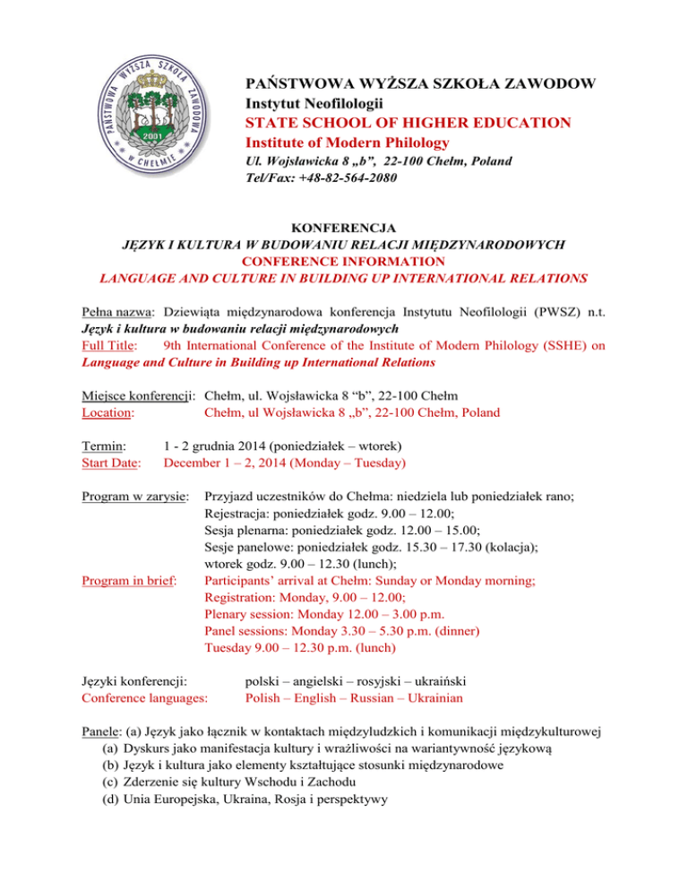 PAŃSTWOWA WYŻSZA SZKOŁA ZAWODOW Instytut Neofilologii STATE SCHOOL OF HIGHER EDUCATION Institute of Modern Philology Ul. Wojsławicka 8 „b”, 22-100 Chełm, Poland Tel/Fax: +48-82-564-2080 KONFERENCJA JĘZYK I KULTURA W BUDOWANIU RELACJI MIĘDZYNARODOWYCH CONFERENCE INFORMATION LANGUAGE AND CULTURE IN BUILDING UP INTERNATIONAL RELATIONS Pełna nazwa: Dziewiąta międzynarodowa konferencja Instytutu Neofilologii (PWSZ) n.t. Język i kultura w budowaniu relacji międzynarodowych Full Title: 9th International Conference of the Institute of Modern Philology (SSHE) on Language and Culture in Building up International Relations Miejsce konferencji: Chełm, ul. Wojsławicka 8 “b”, 22-100 Chełm Location: Chełm, ul Wojsławicka 8 „b”, 22-100 Chełm, Poland Termin: Start Date: 1 - 2 grudnia 2014 (poniedziałek – wtorek) December 1 – 2, 2014 (Monday – Tuesday) Program w zarysie: Program in brief: Przyjazd uczestników do Chełma: niedziela lub poniedziałek rano; Rejestracja: poniedziałek godz. 9.00 – 12.00; Sesja plenarna: poniedziałek godz. 12.00 – 15.00; Sesje panelowe: poniedziałek godz. 15.30 – 17.30 (kolacja); wtorek godz. 9.00 – 12.30 (lunch); Participants’ arrival at Chełm: Sunday or Monday morning; Registration: Monday, 9.00 – 12.00; Plenary session: Monday 12.00 – 3.00 p.m. Panel sessions: Monday 3.30 – 5.30 p.m. (dinner) Tuesday 9.00 – 12.30 p.m. (lunch) Języki konferencji: Conference languages: polski – angielski – rosyjski – ukraiński Polish – English – Russian – Ukrainian Panele: (a) Język jako łącznik w kontaktach międzyludzkich i komunikacji międzykulturowej (a) Dyskurs jako manifestacja kultury i wrażliwości na wariantywność językową (b) Język i kultura jako elementy kształtujące stosunki międzynarodowe (c) Zderzenie się kultury Wschodu i Zachodu (d) Unia Europejska, Ukraina, Rosja i perspektywy Panels: (a) Language as a social bond in intercultural communication and contacts (a) Discourse as a manifestation of culture and sensitivity to language variety (b) Language and culture as elements fostering international relations (c) The clash between the culture of the East and the West (d) The European Union, Ukraine, Russia and Beyond Upowszechnienie wyników konferencji: annał - INTERNATIONAL JOURNAL OF LANGUAGE, CULTURE, AND POLITICS (Język, Kultura, Polityka – studium międzynarodowe) Conference results publication: annual - INTERNATIONAL JOURNAL OF LANGUAGE, CULTURE, AND POLITICS (Język, Kultura, Polityka – studium międzynarodowe) Opłata konferencyjna: 300 zł. lub 75 euro Conference fee: PLN 300 or € 75 Komitet naukowy - Scientific Committee: Prof. Józef Zając – Rektor/Rector Dr Beata Fałda – Prorektor/Vice-Rector Prof. Iryna Biskub Doc. Serghiey Fedoniuk Dr Teresa Giedz-Topolewska Prof. Andrzej Gil Prof. Jan Hudzik Prof. Henryk Kardela Dr Mirosława Kawecka Prof. Jan Kłos Dr Iwona Lasek-Surowiec Prof. Włodzimierz Osadczy Prof. Beata Siwek Doc. Tomasz Zygmunt Komitet organizacyjny - Organizing Committee: Zygmunt Gardziński – Rada Miasta Chełm/City Council Mariusz Adamiec Alicja Cuper Jan Grudziński Dr Yuriy Hayduk Marcin Oskierko Anna Wołoszczuk Dr Agnieszka Zaręba Magdalena Zygmunt Rafał Zygmunt Kontakt: Contact: e-mail: [email protected] PAŃSTWOWA WYŻSZA SZKOŁA ZAWODOW Instytut Neofilologii STATE SCHOOL OF HIGHER EDUCATION Institute of Modern Philology KONFERENCJA JĘZYK I KULTURA W BUDOWANIU RELACJI MIĘDZYNARODOWYCH CONFERENCE INFORMATION LANGUAGE AND CULTURE IN BUILDING UP INTERNATIONAL RELATIONS Kontakt: Contact: e-mail: [email protected] WAŻNE! Zainteresowani udziałem w Konferencji nauczyciele akademiccy proszeni są o kontakt z Komitetem Organizacyjnym za pośrednictwem poczty elektronicznej, co traktowane będzie jako zgłoszenie wstępne. Natychmiast po nawiązaniu kontaktu, wysłany zostanie do osoby zainteresowanej oficjalny formularz zgłoszenia udziału w Konferencji, zawierający numer konta bankowego dla opłaty konferencyjnej oraz adresy hoteli. Ponadto, adres poczty elektronicznej ma służyć do bezpośredniego i natychmiastowego kontaktu z uczestnikiem Konferencji w razie nagłej potrzeby. IMPORTANT! The interested in conference participation academics are kindly requested to get in touch with the Organizing Committee via e-mail, which is to be treated as a preliminary registration. Right after the e-mail contact is established, the preliminary registered person will receive an official registration form, containing the bank account number needed for the conference fee payment and addresses of local hotels. Besides, the e-mail address will serve as a direct and immediate contact with the Conference participant in case of emergency. e-mail: [email protected] Z wyrazami szacunku, Organizatorzy: Katedra Anglistyki i Amerykanistyki, Katedra Slawistyki, Katedra Stosunków Międzynarodowych IN-PWSZ w Chełmie Sincerely, Organizing Departments: English and American Studies, Slavic Studies, International Relations Studies at SSHE in Chełm