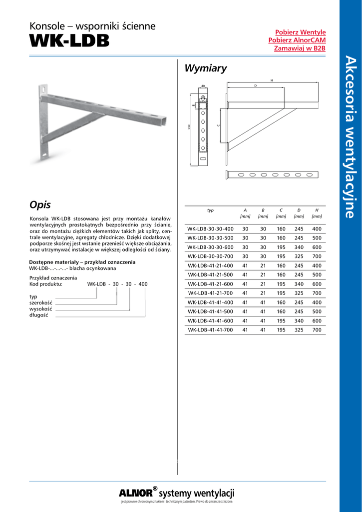 Konsole – wsporniki ścienne Pobierz Wentyle Pobierz AlnorCAM Zamawiaj w B2B WK-LDB H D 40 330 C B A Opis Konsola WK-LDB stosowana jest przy montażu kanałów wentylacyjnych prostokątnych bezpośrednio przy ścianie, oraz do montażu ciężkich elementów takich jak splity, centrale wentylacyjne, agregaty chłodnicze. Dzięki dodatkowej podporze skośnej jest wstanie przenieść większe obciążania, oraz utrzymywać instalacje w większej odległości od ściany. Dostępne materiały – przykład oznaczenia WK-LDB-...-...-...- blacha ocynkowana Przykład oznaczenia Kod produktu: typ szerokość wysokość długość WK-LDB - 30 - 30 - 400 typ A [mm] B [mm] C [mm] D [mm] H [mm] WK-LDB-30-30-400 30 30 160 245 400 WK-LDB-30-30-500 30 30 160 245 500 WK-LDB-30-30-600 30 30 195 340 600 WK-LDB-30-30-700 30 30 195 325 700 WK-LDB-41-21-400 41 21 160 245 400 WK-LDB-41-21-500 41 21 160 245 500 WK-LDB-41-21-600 41 21 195 340 600 WK-LDB-41-21-700 41 21 195 325 700 WK-LDB-41-41-400 41 41 160 245 400 WK-LDB-41-41-500 41 41 160 245 500 WK-LDB-41-41-600 41 41 195 340 600 WK-LDB-41-41-700 41 41 195 325 700 http://www.alnor.com.pl/index/produkty-pl/akcesoria-wentylacyjne/ ALNOR® systemy wentylacji jest prawnie chronionym znakiem i technicznym patentem. Prawo do zmian zastrzeżone. Akcesoria wentylacyjne Wymiary Konsole – wsporniki ścienne Pobierz Wentyle Pobierz AlnorCAM Zamawiaj w B2B Akcesoria wentylacyjne WK-LDB Wymiary Obciążenia dopuszczalne konsoli WK-LDB przy działaniu siły skupionej Kod Rozstaw podpór L [mm] Obciążenia dopuszczalne F [N] WK-LDB-30-30-400 400 1748 WK-LDB-30-30-500 500 971 WK-LDB-30-30-600 600 950 WK-LDB-30-30-700 700 594 Schemat obciążenia F L Obciążenia dopuszczalne konsoli WK-LDB przy działaniu siły ciągłej, liniowej Kod Rozstaw podpór L [mm] Obciążenia dopuszczalne q [N] WK-LDB-30-30-400 400 3495 WK-LDB-30-30-500 500 1942 WK-LDB-30-30-600 600 1899 WK-LDB-30-30-700 700 1324 Schemat obciążenia q L http://www.alnor.com.pl/index/produkty-pl/akcesoria-wentylacyjne/ ALNOR® systemy wentylacji jest prawnie chronionym znakiem i technicznym patentem. Prawo do zmian zastrzeżone.