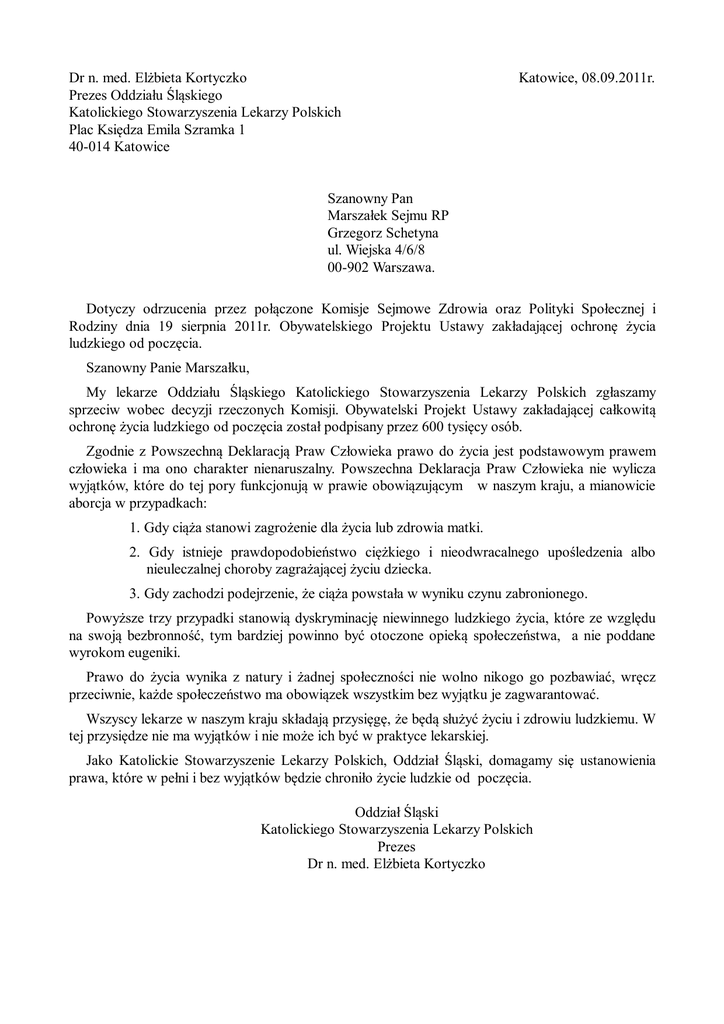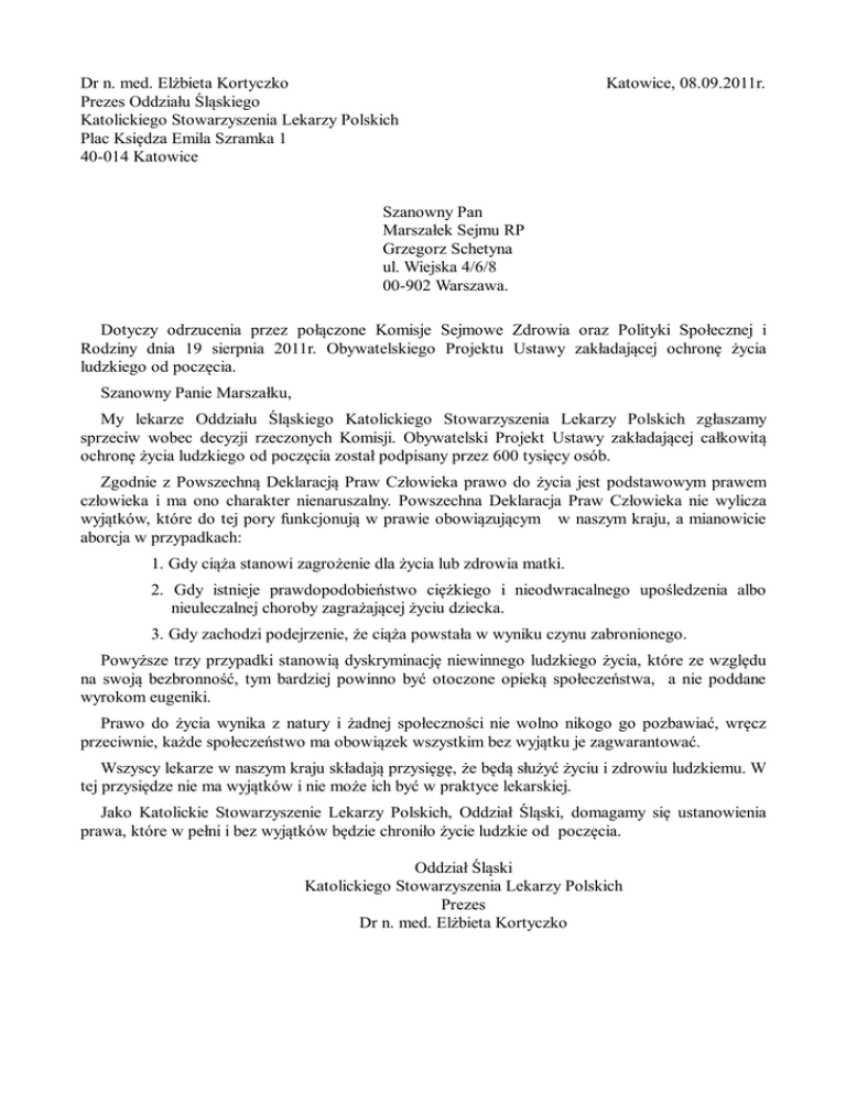 Dr n. med. Elżbieta Kortyczko Prezes Oddziału Śląskiego Katolickiego Stowarzyszenia Lekarzy Polskich Plac Księdza Emila Szramka 1 40-014 Katowice Katowice, 08.09.2011r. Szanowny Pan Marszałek Sejmu RP Grzegorz Schetyna ul. Wiejska 4/6/8 00-902 Warszawa. Dotyczy odrzucenia przez połączone Komisje Sejmowe Zdrowia oraz Polityki Społecznej i Rodziny dnia 19 sierpnia 2011r. Obywatelskiego Projektu Ustawy zakładającej ochronę życia ludzkiego od poczęcia. Szanowny Panie Marszałku, My lekarze Oddziału Śląskiego Katolickiego Stowarzyszenia Lekarzy Polskich zgłaszamy sprzeciw wobec decyzji rzeczonych Komisji. Obywatelski Projekt Ustawy zakładającej całkowitą ochronę życia ludzkiego od poczęcia został podpisany przez 600 tysięcy osób. Zgodnie z Powszechną Deklaracją Praw Człowieka prawo do życia jest podstawowym prawem człowieka i ma ono charakter nienaruszalny. Powszechna Deklaracja Praw Człowieka nie wylicza wyjątków, które do tej pory funkcjonują w prawie obowiązującym w naszym kraju, a mianowicie aborcja w przypadkach: 1. Gdy ciąża stanowi zagrożenie dla życia lub zdrowia matki. 2. Gdy istnieje prawdopodobieństwo ciężkiego i nieodwracalnego upośledzenia albo nieuleczalnej choroby zagrażającej życiu dziecka. 3. Gdy zachodzi podejrzenie, że ciąża powstała w wyniku czynu zabronionego. Powyższe trzy przypadki stanowią dyskryminację niewinnego ludzkiego życia, które ze względu na swoją bezbronność, tym bardziej powinno być otoczone opieką społeczeństwa, a nie poddane wyrokom eugeniki. Prawo do życia wynika z natury i żadnej społeczności nie wolno nikogo go pozbawiać, wręcz przeciwnie, każde społeczeństwo ma obowiązek wszystkim bez wyjątku je zagwarantować. Wszyscy lekarze w naszym kraju składają przysięgę, że będą służyć życiu i zdrowiu ludzkiemu. W tej przysiędze nie ma wyjątków i nie może ich być w praktyce lekarskiej. Jako Katolickie Stowarzyszenie Lekarzy Polskich, Oddział Śląski, domagamy się ustanowienia prawa, które w pełni i bez wyjątków będzie chroniło życie ludzkie od poczęcia. Oddział Śląski Katolickiego Stowarzyszenia Lekarzy Polskich Prezes Dr n. med. Elżbieta Kortyczko