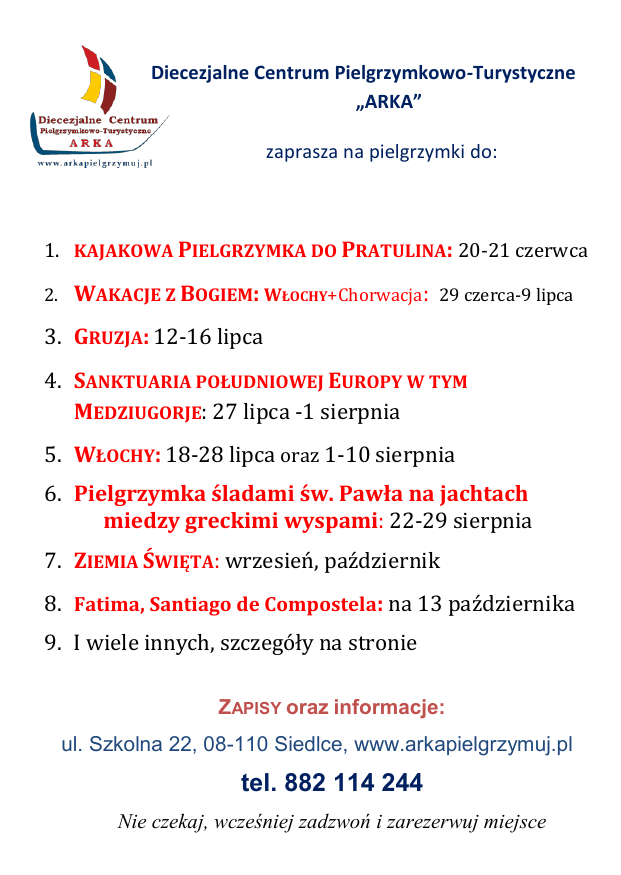Diecezjalne Centrum Pielgrzymkowo-Turystyczne „ARKA” zaprasza na pielgrzymki do: 1. KAJAKOWA PIELGRZYMKA DO PRATULINA: 20-21 czerwca 2. WAKACJE Z BOGIEM: WŁOCHY+Chorwacja: 29 czerca-9 lipca 3. GRUZJA: 12-16 lipca 4. SANKTUARIA POŁUDNIOWEJ EUROPY W TYM MEDZIUGORJE: 27 lipca -1 sierpnia 5. WŁOCHY: 18-28 lipca oraz 1-10 sierpnia 6. Pielgrzymka śladami św. Pawła na jachtach miedzy greckimi wyspami: 22-29 sierpnia 7. ZIEMIA ŚWIĘTA: wrzesień, październik 8. Fatima, Santiago de Compostela: na 13 października 9. I wiele innych, szczegóły na stronie ZAPISY oraz informacje: ul. Szkolna 22, 08-110 Siedlce, www.arkapielgrzymuj.pl tel. 882 114 244 Nie czekaj, wcześniej zadzwoń i zarezerwuj miejsce