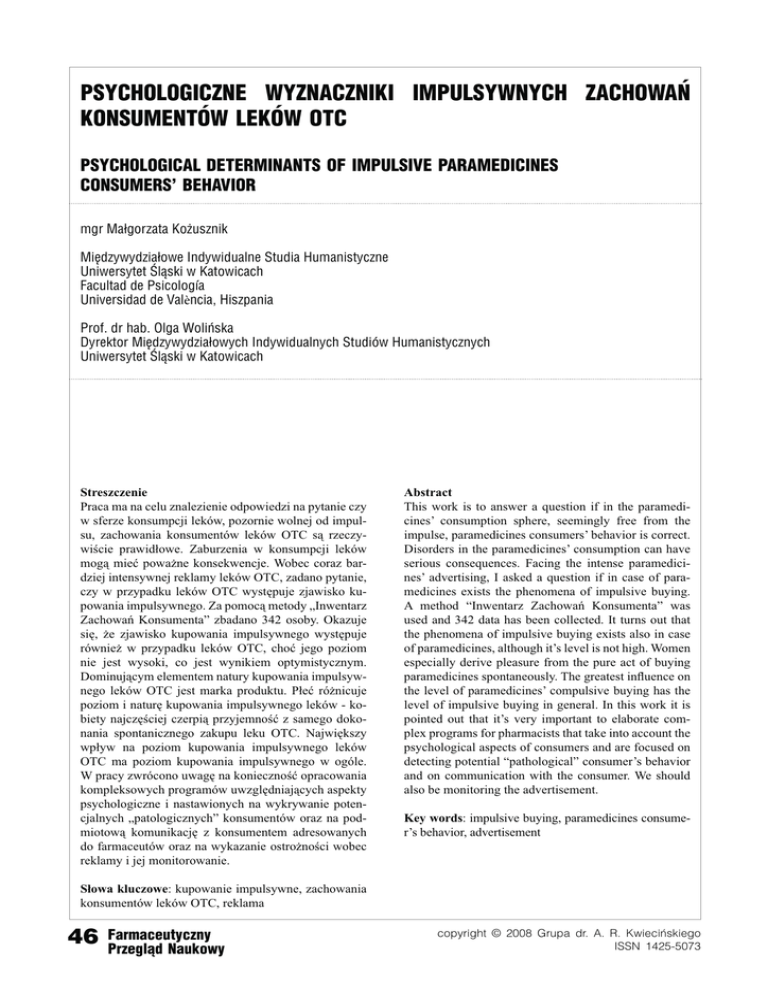 039#(/,/')#:.% 79:.!#:.)+) )-05,397.9#( :!#(/7!ª +/.35-%.4¬7,%+¬7/4# 039#(/,/')#!,$%4%2-).!.43/&)-05,3)6%0!2!-%$)#).%3 #/.35-%23l"%(!6)/2 MGR-AGORZATA+OUSZNIK -IÃDZYWYDZIAOWE)NDYWIDUALNE3TUDIA(UMANISTYCZNE 5NIWERSYTETgLSKIW+ATOWICACH &ACULTADDE0SICOLOGÆA 5NIVERSIDADDE6ALÍNCIA(ISZPANIA 0ROFDRHAB/LGA7OLIÊSKA $YREKTOR-IÃDZYWYDZIAOWYCH)NDYWIDUALNYCH3TUDIÌW(UMANISTYCZNYCH 5NIWERSYTETgLSKIW+ATOWICACH Streszczenie Praca ma na celu znalezienie odpowiedzi na pytanie czy w sferze konsumpcji leków, pozornie wolnej od impulsu, zachowania konsumentów leków OTC są rzeczywiście prawidłowe. Zaburzenia w konsumpcji leków mogą mieć poważne konsekwencje. Wobec coraz bardziej intensywnej reklamy leków OTC, zadano pytanie, czy w przypadku leków OTC występuje zjawisko kupowania impulsywnego. Za pomocą metody „Inwentarz Zachowań Konsumenta” zbadano 342 osoby. Okazuje się, że zjawisko kupowania impulsywnego występuje również w przypadku leków OTC, choć jego poziom nie jest wysoki, co jest wynikiem optymistycznym. Dominującym elementem natury kupowania impulsywnego leków OTC jest marka produktu. Płeć różnicuje poziom i naturę kupowania impulsywnego leków - kobiety najczęściej czerpią przyjemność z samego dokonania spontanicznego zakupu leku OTC. Największy wpływ na poziom kupowania impulsywnego leków OTC ma poziom kupowania impulsywnego w ogóle. W pracy zwrócono uwagę na konieczność opracowania kompleksowych programów uwzględniających aspekty psychologiczne i nastawionych na wykrywanie potencjalnych „patologicznych” konsumentów oraz na podmiotową komunikację z konsumentem adresowanych do farmaceutów oraz na wykazanie ostrożności wobec reklamy i jej monitorowanie. Abstract This work is to answer a question if in the paramedicines’ consumption sphere, seemingly free from the impulse, paramedicines consumers’ behavior is correct. Disorders in the paramedicines’ consumption can have serious consequences. Facing the intense paramedicines’ advertising, I asked a question if in case of paramedicines exists the phenomena of impulsive buying. A method “Inwentarz Zachowań Konsumenta” was used and 342 data has been collected. It turns out that the phenomena of impulsive buying exists also in case of paramedicines, although it’s level is not high. Women especially derive pleasure from the pure act of buying paramedicines spontaneously. The greatest influence on the level of paramedicines’ compulsive buying has the level of impulsive buying in general. In this work it is pointed out that it’s very important to elaborate complex programs for pharmacists that take into account the psychological aspects of consumers and are focused on detecting potential “pathological” consumer’s behavior and on communication with the consumer. We should also be monitoring the advertisement. Key words: impulsive buying, paramedicines consumer’s behavior, advertisement Słowa kluczowe: kupowanie impulsywne, zachowania konsumentów leków OTC, reklama &ARMACEUTYCZNY 0RZEGLD.AUKOWY COPYRIGHT'RUPADR!2+WIECIÊSKIEGO )33. ^¤°°U ' "Õ Nowoczesne społeczeństwo i związane z nim wolność, prawo do dobrobytu oraz rozwój ekonomiczny mają swoją cenę – coraz częściej obserwujemy zachowania impulsywne i nieprzemyślane. Wyniki badań pokazują, że aż 67% decyzji zakupowych podejmowanych jest w sklepie. Celem niniejszej pracy jest znalezienie odpowiedzi na pytanie o to, czy w pozornie zdroworozsądkowej, wolnej od impulsu sferze konsumpcji leków rzeczywiście zachowania konsumenckie są prawidłowe i wolne od patologii. Dotychczas sądzono, że wszechmocny wpływ reklamy na zachowania konsumenta to marketingowy stereotyp (Mruk, 2006). Pojawiają się jednak sygnały, że lek, stając się przedmiotem reklamy, przestaje zaspokajać wyłącznie pierwotne potrzeby wynikające z jego funkcjonalnych właściwości. W ostatnich latach pojawiły się aromatyczne napoje, gumy do żucia łagodzące objawy przeziębienia i w ociekające słodyczą witaminy skierowane do najmłodszych konsumentów (Lianne, 2007). Zaburzenia w kupowaniu leków mogą mieć niebezpieczne konsekwencje. Kupowanie impulsywne to takie zachowania, gdy osoba nie planowała danego zakupu, a podjęła go pod wpływem nagłej chęci (czy nawet przymusu). Zachowania te lepiej opisać według schematu bodziec – reakcja niż jako proces wyboru. Impuls może być wywołany spostrzeżeniem danego produktu, ale może też pojawić się bez konkretnego spostrzeżenia (Tyszka, Falkowski, 2001). Skrajna postać – kupowanie kompulsywne (nałogowe) to utrata kontroli nad zachowaniem, kontynuowanie kupowania mimo niepożądanych konsekwencji i próba poradzenia sobie z problemami związanymi z własną tożsamością i złym nastrojem. (Dittmar, 2005). Wobec wzrastającego spożycia leków OTC, reklamy leków i czynników sprzyjających zagrożeniu konsumpcji leków uważam, że warto zadać pytania o zachowanie konsumentów leków. Jak dotąd brakuje odpowiedzi na podstawowe pytania: Czy w zachowaniach konsumentów leków pojawia się zjawisko impulsywnego kupowania leków OTC? Czy zachowania impulsywne w odniesieniu do zakupów leków OTC przybierają poziom ekstremalny i stają się kompulsją? Istotny wydaje się również problem, od jakich czynników zależeć może nasilenie zachowań impulsywnych w odniesieniu do leków (np. płci, wieku, wykształcenia)? Czy impulsywność w kupowaniu leków jest związana z ogólną impulsywnością w kupowaniu? Które ze zmiennych najlepiej wyjaśniają impulsywne kupowanie leków OTC? ") Do badania natury impulsywności w kupowaniu leków OTC zastosowano klasyfikację zakupów pod wpływem impulsu za Luna-Arocasem (1998) na: a) „Czystą” impulsywność w kupowaniu – rozumianą jako przyjemność czerpaną z kupowania produktów wcześniej nie zaplanowanych, b) Kompulsywność w kupowaniu – brak kontroli w zakupach, sposób rozwiązywania wła