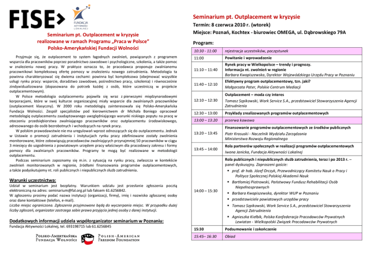 Seminarium pt. Outplacement w kryzysie Seminarium pt. Outplacement w kryzysie realizowane w ramach Programu „Praca w Polsce” Polsko-Amerykaoskiej Fundacji Wolności Przyjmuje się, że outplacement to system łagodnych zwolnieo, powiązanych z programem wsparcia dla pracowników poprzez poradnictwo zawodowe i psychologiczne, szkolenia, a także pomoc w znalezieniu nowej pracy. W praktyce oznacza to, że pracodawca proponuje zwalnianemu pracownikowi kompleksową ofertę pomocy w znalezieniu nowego zatrudnienia. Metodologia ta powinna charakteryzowad się dwiema cechami: powinna byd kompleksowa (obejmowad wszystkie usługi rynku pracy: wsparcie, doradztwo zawodowe, pośrednictwo pracy, szkolenia) i równocześnie zindywidualizowana (dopasowana do potrzeb każdej z osób, które uczestniczą w projekcie outplacementowym). W Polsce metodologia outplacementu pojawiła się wraz z pierwszymi międzynarodowymi korporacjami, które w swej kulturze organizacyjnej miały wsparcie dla zwalnianych pracowników (outplacement klasyczny). W 2000 roku metodologią zainteresowała się Polsko-Amerykaoska Fundacja Wolności. Zespół specjalistów pod kierownictwem dr Michała Boniego opracował metodologię outplacementu zaadaptowanego uwzględniającego warunki niskiego popytu na pracę w otoczeniu przedsiębiorstwa zwalniającego pracowników oraz outplacementu środowiskowego, adresowanego do osób bezrobotnych i wchodzących na rynek pracy. W polskim prawodawstwie nie ma uregulowao wprost odnoszących się do outplacementu. Jednak w Ustawie o promocji zatrudnienia i instytucjach rynku pracy zdefiniowane zostały zwolnienia monitorowane, które zobowiązują pracodawców zwalniających przynajmniej 50 pracowników w ciągu 3 miesięcy do uzgodnienia z powiatowym urzędem pracy właściwym dla pracodawcy zakresu i formy pomocy dla zwalnianych pracowników. Programy te mogą byd realizowane w metodologii outplacementu. Podczas seminarium zapoznamy się m.in. z sytuacją na rynku pracy, zwłaszcza w kontekście zwolnieo monitorowanych w regionie, źródłami finansowania programów outplacementowych, a także podyskutujemy nt. roli publicznych i niepublicznych służb zatrudnienia. Termin: 8 czerwca 2010 r. (wtorek) Miejsce: Poznao, Kochtex - biurowiec OMEGA, ul. Dąbrowskiego 79A Program: 10:30 - 11:00 rejestracja uczestników, poczęstunek 11:00 Powitanie i wprowadzenie 11:10 – 11:40 Rynek pracy w Wielkopolsce – trendy i prognozy. Informacja nt. zwolnieo w regionie Barbara Kwapiszewska, Dyrektor Wojewódzkiego Urzędu Pracy w Poznaniu 11:40 – 12:10 Efektywny program outplacementowy, tzn. jaki? Małgorzata Pater, Polskie Centrum Mediacji 12:10 – 12:30 Outplacement – moda czy interes Tomasz Szpikowski, Work Service S.A., przedstawiciel Stowarzyszenia Agencji Zatrudnienia 12:30 – 13:00 Przykłady zrealizowanych programów outplacementowych 13:00 – 13:20 przerwa kawowa 13:20 – 13:45 Finansowanie programów outplacementowych ze środków publicznych Piotr Krasuski - Naczelnik Wydziału Zarządzania Ministerstwa Rozwoju Regionalnego 13:45 – 14:00 Rola partnerów społecznych w realizacji programów outplacementowych Iwona Janicka, Fundacja Aktywności Lokalnej Warunki uczestnictwa: Udział w seminarium jest bezpłatny. Warunkiem udziału jest przesłanie zgłoszenia pocztą elektroniczną na adres: [email protected] lub faksem 61.6256842. W zgłoszeniu prosimy podad nazwa instytucji (organizacji, firmy), imię i nazwisko zgłaszanej osoby oraz dane kontaktowe (telefon, e-mail). Liczba miejsc ograniczona. Zgłoszenia przyjmowane będą do wyczerpania miejsc. W przypadku dużej liczby zgłoszeo, organizator zastrzega sobie prawo przyjęcia jednej osoby z danej instytucji. 14:00 – 15:30 Agnieszka Kiełbik, Polska Konfederacja Pracodawców Prywatnych Lewiatan - Wielkopolski Związek Pracodawców Prywatnych Dodatkowych informacji udziela współorganizator seminarium w Poznaniu: Fundacja Aktywności Lokalnej, tel. 693198715 lub 61.6256845 Rola publicznych i niepublicznych służb zatrudnienia, teraz i po 2013 r. – panel dyskusyjny. Zaproszeni goście: prof. dr hab. Józef Orczyk, Przewodniczący Komitetu Nauk o Pracy i Polityce Społecznej Polskiej Akademii Nauk Bartłomiej Piotrowski, Paostwowy Fundusz Rehabilitacji Osób Niepełnosprawnych Barbara Kwapiszewska, dyrektor WUP w Poznaniu przedstawiciele powiatowych urzędów pracy Tomasz Szpikowski, Work Service S.A., przedstawiciel Stowarzyszenia Agencji Zatrudnienia 15:30 Podsumowanie i zakooczenie 15:45– 16:30 Obiad