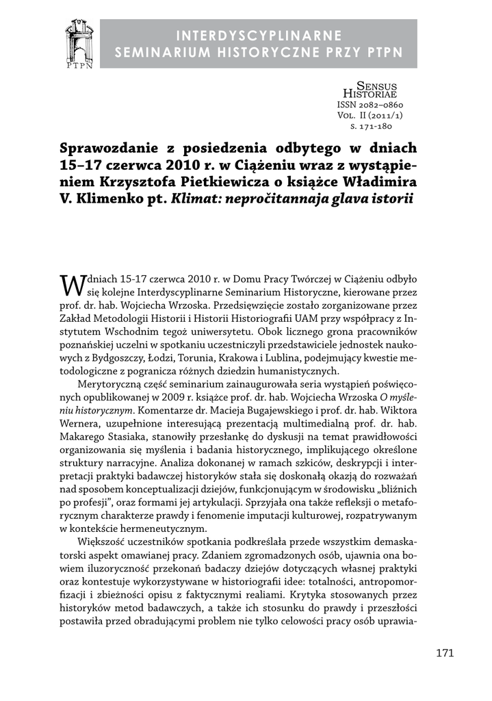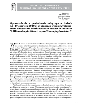 INTERDYSCYPLINARNE SEM INAR I U M H I S TO R Y C Z N E P RZ Y P T P N SENSUS HISTORIAE ISSN – Vol. II (/) s. - Sprawozdanie z posiedzenia odbytego w dniach 15–17 czerwca 2010 r. w Ciążeniu wraz z wystąpieniem Krzysztofa Pietkiewicza o książce Władimira V. Klimenko pt. Klimat: nepročitannaja glava istorii W dniach 15-17 czerwca 2010 r. w Domu Pracy Twórczej w Ciążeniu odbyło się kolejne Interdyscyplinarne Seminarium Historyczne, kierowane przez prof. dr. hab. Wojciecha Wrzoska. Przedsięwzięcie zostało zorganizowane przez Zakład Metodologii Historii i Historii Historiografii UAM przy współpracy z Instytutem Wschodnim tegoż uniwersytetu. Obok licznego grona pracowników poznańskiej uczelni w spotkaniu uczestniczyli przedstawiciele jednostek naukowych z Bydgoszczy, Łodzi, Torunia, Krakowa i Lublina, podejmujący kwestie metodologiczne z pogranicza różnych dziedzin humanistycznych. Merytoryczną część seminarium zainaugurowała seria wystąpień poświęconych opublikowanej w 2009 r. książce prof. dr. hab. Wojciecha Wrzoska O myśleniu historycznym. Komentarze dr. Macieja Bugajewskiego i prof. dr. hab. Wiktora Wernera, uzupełnione interesującą prezentacją multimedialną prof. dr. hab. Makarego Stasiaka, stanowiły przesłankę do dyskusji na temat prawidłowości organizowania się myślenia i badania historycznego, implikującego określone struktury narracyjne. Analiza dokonanej w ramach szkiców, deskrypcji i interpretacji praktyki badawczej historyków stała się doskonałą okazją do rozważań nad sposobem konceptualizacji dziejów, funkcjonującym w środowisku „bliźnich po profesji”, oraz formami jej artykulacji. Sprzyjała ona także refleksji o metaforycznym charakterze prawdy i fenomenie imputacji kulturowej, rozpatrywanym w kontekście hermeneutycznym. Większość uczestników spotkania podkreślała przede wszystkim demaskatorski aspekt omawianej pracy. Zdaniem zgromadzonych osób, ujawnia ona bowiem iluzoryczność przekonań badaczy dziejów dotyczących własnej praktyki oraz kontestuje wykorzystywane w historiografii idee: totalności, antropomorfizacji i zbieżności opisu z faktycznymi realiami. Krytyka stosowanych przez historyków metod badawczych, a także ich stosunku do prawdy i przeszłości postawiła przed obradującymi problem nie tylko celowości pracy osób uprawia- 171 Interdyscyplinarne seminarium historyczne przy PTPN jących tę dziedzinę naukową, ale także czyniących z niej obiekt własnych rozważań. Przyczyniło się to do dyskusji nad kwestią pozytywnego aspektu koncepcji proponowanej w książce O myśleniu historycznym. Z aprobatą odnotowano fakt, że wykładnia pryncypiów historiograficznych autorstwa prof. Wojciecha Wrzoska przekracza kanony metodologii klasycznej, stając się przyczynkiem do przezwyciężenia dotychczasowego modelu myślenia i badania historycznego oraz wypracowania jego nowego wariantu. Próbę wzbogacenia „nauki o przeszłości” o nowe komponenty podjęła również badaczka z Uniwersytetu im. Marii Curie-Skłodowskiej dr Anna Zalewska, która zaprezentowała słuchaczom seminarium innowacyjny projekt archeologii „drugiego stopnia”. W centrum jej zainteresowania znalazła się koncepcja tzw. drugiej rzeczywistości, będąca pewnego rodzaju konstrukcją kognitywną, opartą na świecie artefaktów oraz istniejących strukturach społecznych i służącą do rekonstrukcji procesu kształtowania się, narosłych wokół obiektu, „imaginacji wyobrażeniowych kolektywu”. Postrzeganie przez dr Zalewską rzeczy w perspektywie hermeneutyki materialnej powoduje, że podążanie za „namacalnymi” śladami przeszłości faktycznie okazuje się „tropieniem” zjawiska formowania się zbiorowej tożsamości wraz z całokształtem przekonań, stygmatów i znaczeń deponowanych w materialnej pamięci przedmiotu. Zgodnie z tym założeniem, domenę archeologii „drugiego obiegu” stanowią dociekania dotyczące recepcji społecznej danego przedmiotu, obecności i znaczenia materii w dziedzictwie kulturowym, a także przyczyn przypisywania jej konkretnych sensów oraz określonego usytuowania we współczesnym dyskursie naukowym. Konkludując, zadaniem archeologii „drugiego stopnia” jest poszerzenie własnej refleksji na temat teraźniejszości poprzez uświadomienie sobie procesu powstawania oraz utrwalania się znaczeniowej struktury przedmiotu w kontekście historycznym i społecznym. Wystąpienie dr Anny Zalewskiej spotkało się ze słowami uznania ze strony uczestników obrad, którzy dostrzegali szanse związane z realizacją podobnego projektu, ale wskazywali jednocześnie na zagrożenia, które ze sobą niesie. Sugerowano możliwość zakwestionowania przez archeologów proponowanych metod performatywnych, mogących budzić podejrzenia o pseudonaukowość danej koncepcji, posądzenia o zbędną komercjonalizację wyników badań i generowanie archeologii w wersji folkowej czy popularnej. Również postulowana chęć uczynienia z niej dyscypliny „inspirującej” historię, zdaniem wypowiadających się osób, wiąże się z ryzykiem braku akceptacji ze strony „kolegów po profesji”, przejawiających raczej tendencje emancypacyjne, niż dążących do tworzenia aliansów w ramach „nauk o przeszłości”. Z ogromnym zainteresowaniem przyjęty został również referat dyrektora Instytutu Wschodniego UAM, prof. dr. hab. Krzysztofa Pietkiewicza, poświęcony zjawisku determinizmu klimatycznego w koncepcji Władimira Klimenki. Nakreślenie przez prelegenta tematyki poszczególnych rozdziałów pracy rosyj- 172 Interdyscyplinarne seminarium historyczne przy PTPN skiego naukowca Klimat. Nieproczitannaja gława istorii, dopełnione rzetelną analizą prezentowanej treści, pozwoliło audytorium zaznajomić się z problematyką oddziaływań geosfery na ludzkie losy od czasów prehistorycznych po współczesność. Uwzględnione w wystąpieniu korelacje pomiędzy 