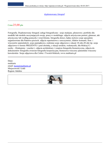 Dane pochodzą ze strony: http://aparatyxxwieku.pl/. Wygenerowano dnia: 04-03-2017. dyplomowany fotograf Cena:25,00 pln Fotografia. Dyplomowany fotograf, usługi fotograficzne: sesje studyjne, plenerowe. portfolio dla modelki lub modela zaczynających swoją pracę w modelingu. zdjęcia artystyczne portret, glamour, akt artystyczny lub według pomysłu i wizji klienta. fotografia dzieci, ładne stylowe sesje specjalnie organizowane dla Państwa pociech. zdjęcia reportażowe z uroczystości, ślubów komunii, firm i wieczorów panieńskich. sesje pamiątkowe, rodzinne sesje zdjęciowe z okazji 18-stki,30 stki itp. sesja zdjęciowa w formie PREZENTU ( pod choinkę, z okazji urodzin, walentynek, dla bliskiej Ci osoby…Drukujemy voucher ). zdjęcia architektury i wnętrza fotografia biometryczna, zdjęcia do dokumentów fotografia zwierzat fotografia korporacyjna, biznesowa wieczory panieńskie wieczory kawalerskie Sesja zdjęciowa dla Ciebie i Twoich bliskich, www.multiarte.pl Dane: multiarte email: [email protected] Miejscowość: Łódź Region: łódzkie