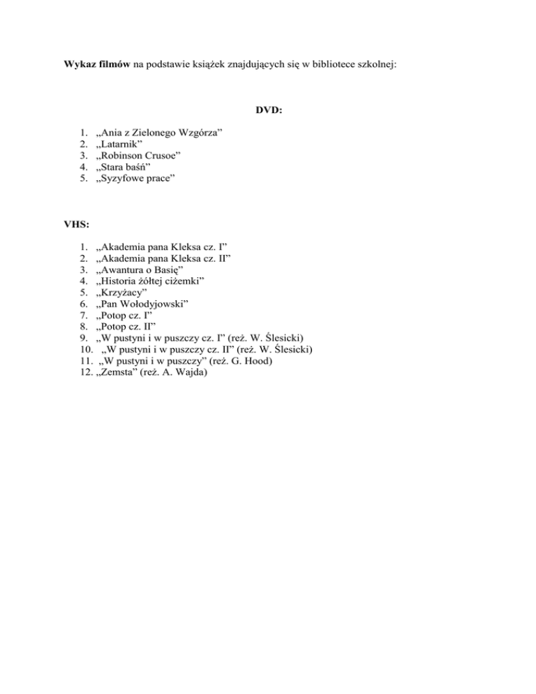 Wykaz filmów na podstawie książek znajdujących się w bibliotece szkolnej: DVD: 1. 2. 3. 4. 5. „Ania z Zielonego Wzgórza” „Latarnik” „Robinson Crusoe” „Stara baśń” „Syzyfowe prace” VHS: 1. „Akademia pana Kleksa cz. I” 2. „Akademia pana Kleksa cz. II” 3. „Awantura o Basię” 4. „Historia żółtej ciżemki” 5. „Krzyżacy” 6. „Pan Wołodyjowski” 7. „Potop cz. I” 8. „Potop cz. II” 9. „W pustyni i w puszczy cz. I” (reż. W. Ślesicki) 10. „W pustyni i w puszczy cz. II” (reż. W. Ślesicki) 11. „W pustyni i w puszczy” (reż. G. Hood) 12. „Zemsta” (reż. A. Wajda)