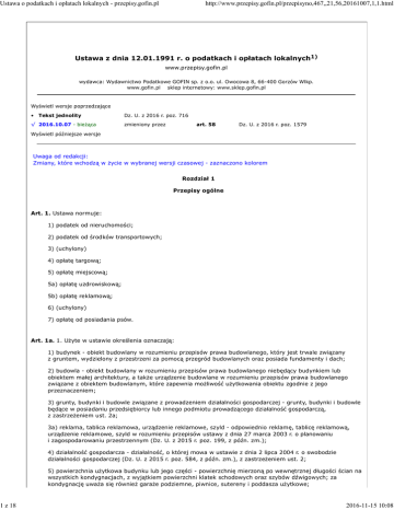 Ustawa o podatkach i opłatach lokalnych - przepisy.gofin.pl 1 z 18 http://www.przepisy.gofin.pl/przepisyno,467,,21,56,20161007,1,1.html Ustawa z dnia 12.01.1991 r. o podatkach i opłatach lokalnych1) www.przepisy.gofin.pl wydawca: Wydawnictwo Podatkowe GOFIN sp. z o.o. ul. Owocowa 8, 66-400 Gorzów Wlkp. www.gofin.pl sklep internetowy: www.sklep.gofin.pl Wyświetl wersje poprzedzające • Tekst jednolity √ 2016.10.07 - bieżąca Wyświetl późniejsze wersje Dz. U. z 2016 r. poz. 716 zmieniony przez art. 58 Dz. U. z 2016 r. poz. 1579 Uwaga od redakcji: Zmiany, które wchodzą w życie w wybranej wersji czasowej - zaznaczono kolorem Rozdział 1 Przepisy ogólne Art. 1. Ustawa normuje: 1) podatek od nieruchomości; 2) podatek od środków transportowych; 3) (uchylony) 4) opłatę targową; 5) opłatę miejscową; 5a) opłatę uzdrowiskową; 5b) opłatę reklamową; 6) (uchylony) 7) opłatę od posiadania psów. Art. 1a. 1. Użyte w ustawie określenia oznaczają: 1) budynek - obiekt budowlany w rozumieniu przepisów prawa budowlanego, który jest trwale związany z gruntem, wydzielony z przestrzeni za pomocą przegród budowlanych oraz posiada fundamenty i dach; 2) budowla - obiekt budowlany w rozumieniu przepisów prawa budowlanego niebędący budynkiem lub obiektem małej architektury, a także urządzenie budowlane w rozumieniu przepisów prawa budowlanego związane z obiektem budowlanym, które zapewnia możliwość użytkowania obiektu zgodnie z jego przeznaczeniem; 3) grunty, budynki i budowle związane z prowadzeniem działalności gospodarczej - grunty, budynki i budowle będące w posiadaniu przedsiębiorcy lub innego podmiotu prowadzącego działalność gospodarczą, z zastrzeżeniem ust. 2a; 3a) reklama, tablica reklamowa, urządzenie reklamowe, szyld - odpowiednio reklamę, tablicę reklamową, urządzenie reklamowe, szyld w rozumieniu przepisów ustawy z dnia 27 marca 2003 r. o planowaniu i zagospodarowaniu przestrzennym (Dz. U. z 2015 r. poz. 199, z późn. zm.); 4) działalność gospodarcza - działalność, o której mowa w ustawie z dnia 2 lipca 2004 r. o swobodzie działalności gospodarczej (Dz. U. z 2015 r. poz. 584, z późn. zm.), z zastrzeżeniem ust. 2; 5) powierzchnia użytkowa budynku lub jego części - powierzchnię mierzoną po wewnętrznej długości ścian na wszystkich kondygnacjach, z wyjątkiem powierzchni klatek schodowych oraz szybów dźwigowych; za kondygnację uważa się również garaże podziemne, piwnice, sutereny i poddasza użytkowe; 2016-11-15 10:08 Ustawa o podatkach i opłatach lokalnych - przepisy.gofin.pl 2 z 18 http://www.przepisy.gofin.pl/przepisyno,467,,21,56,20161007,1,1.html 6) działalność rolnicza - produkcję roślinną i zwierzęcą, w tym również produkcję materiału siewnego, szkółkarskiego, hodowlanego oraz reprodukcyjnego, produkcję warzywniczą, roślin ozdobnych, grzybów uprawnych, sadownictwo, hodowlę i produkcję materiału zarodowego zwierząt, ptactwa i owadów użytkowych, produkcję zwierzęcą typu przemysłowego fermowego oraz chów i hodowlę ryb; 7) działalność leśna - działalność właścicieli, posiadaczy lub zarządców lasów w zakresie urządzania, ochrony i zagospodarowania lasu, utrzymywania i powiększania zasobów i upraw leśnych, gospodarowania zwierzyną, pozyskiwania - z wyjątkiem skupu - drewna, żywicy, choinek, karpiny, kory, igliwia, zwierzyny oraz płodów runa leśnego, a także sprzedaż tych produktów w stanie nieprzerobionym. 2. Za działalność gospodarczą w rozumieniu ustawy nie uważa się: 1) działalności rolniczej lub leśnej; 2) wynajmu turystom pokoi gościnnych w budynkach mieszkalnych znajdujących się na obszarach wiejskich przez osoby ze stałym miejscem pobytu w gminie położonej na tym terenie, jeżeli liczba pokoi przeznaczonych do wynajęcia nie przekracza 5; 3) działalności, o której mowa w art. 3 pkt 4 ustawy z dnia 2 lipca 2004 r. o swobodzie działalności gospodarczej. 2a. Do gruntów, budynków i budowli związanych z prowadzeniem działalności gospodarczej nie zalicza się: 1) budynków mieszkalnych oraz gruntów związanych z tymi budynkami; 2) gruntów, o których mowa w art. 5 ust. 1 pkt 1 lit. b i d; 3) budynków, budowli lub ich części, w odniesieniu do których została wydana decyzja ostateczna organu nadzoru budowlanego, o której mowa w art. 67 ust. 1 ustawy z dnia 7 lipca 1994 r. - Prawo budowlane (Dz. U. z 2016 r. poz. 290), lub decyzja ostateczna organu nadzoru górniczego, na podstawie której trwale wyłączono budynek, budowlę lub ich części z użytkowania. 3. Przez użyte w ustawie określenia: 1) użytki rolne, 2) lasy, 3) nieużytki, 4) użytki ekologiczne, 5) grunty zadrzewione i zakrzewione, 6) (uchylony) 7) grunty pod wodami powierzchniowymi stojącymi oraz grunty pod wodami powierzchniowymi płynącymi, 8) grunty pod morskimi wodami wewnętrznymi - rozumie się grunty sklasyfikowane w ten sposób w ewidencji gruntów i budynków. Art. 1b. 1. Ulgi i zwolnienia podatkowe w zakresie podatków i opłat lokalnych przyznane kościołom i związkom wyznaniowym regulują odrębne ustawy. 2. Zwolnienia z podatku od nieruchomości przyznane z tytułu prowadzenia działalności gospodarczej na terenie specjalnych stref ekonomicznych regulują przepisy ustawy z dnia 2 października 2003 r. o zmianie ustawy o specjalnych strefach ekonomicznych i niektórych ustaw (Dz. U. poz. 1840, z późn. zm.). 3. Zwolnienie z podatku od nieruchomości gruntów i budynków wchodzących w skład nieruchomości przeznaczonych na budowę dróg publicznych, nabytych odpowiednio na własność lub w trwały zarząd: 1) Skarbu Państwa oraz przekazanych Generalnej Dyrekcji Dróg Krajowych i Autostrad, 2) właściwych jednostek samorządu terytorialnego - regulują przepisy ustawy z dnia 10 kwietnia 2003 r. o szczególnych zasadach przygotowania i realizacji inwestycji w zakresie dróg publicznych (Dz. U. z 2015 r. poz. 2031). Art. 1c. Organem po
