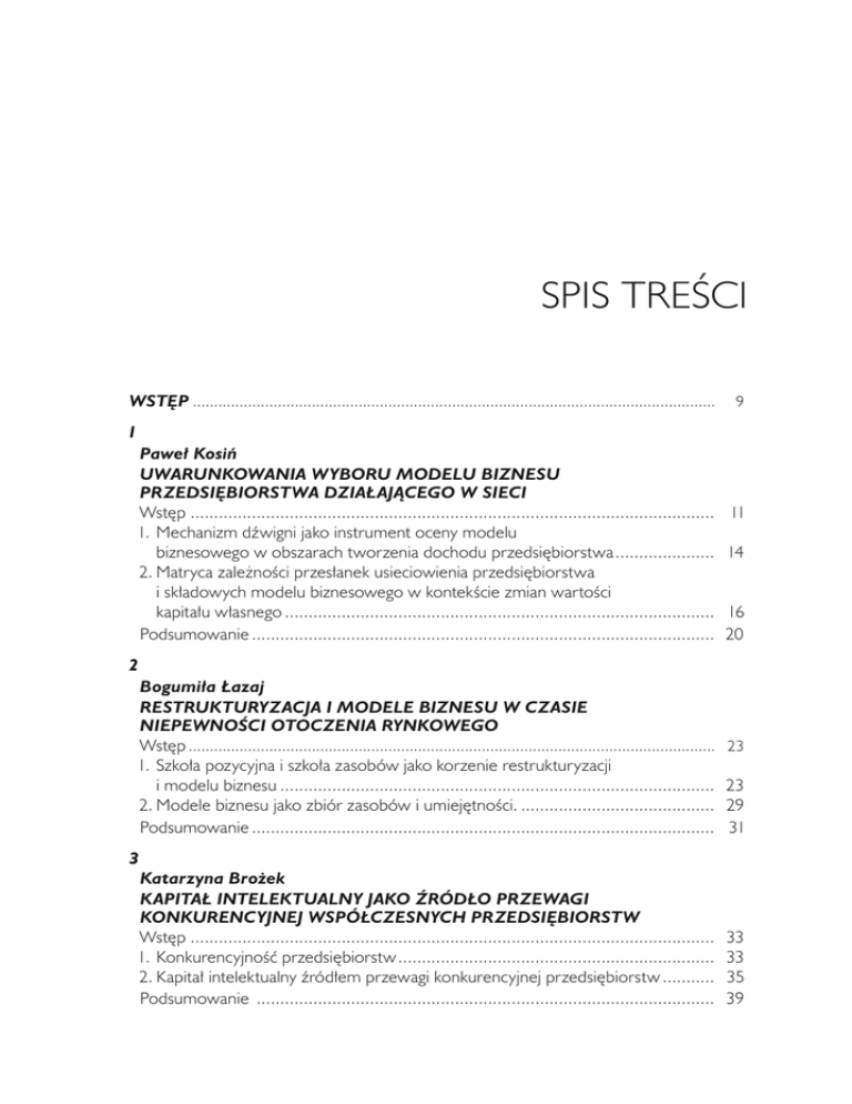 SPIS TREŚCI WSTĘP............................................................................................................................ 9 1 Paweł Kosiń UWARUNKOWANIA WYBORU MODELU BIZNESU PRZEDSIĘBIORSTWA DZIAŁAJĄCEGO W SIECI Wstęp................................................................................................................ 11 1.Mechanizm dźwigni jako instrument oceny modelu biznesowego w obszarach tworzenia dochodu przedsiębiorstwa...................... 14 2.Matryca zależności przesłanek usieciowienia przedsiębiorstwa i składowych modelu biznesowego w kontekście zmian wartości kapitału własnego............................................................................................ 16 Podsumowanie................................................................................................... 20 2 Bogumiła Łazaj RESTRUKTURYZACJA I MODELE BIZNESU W CZASIE NIEPEWNOŚCI OTOCZENIA RYNKOWEGO Wstęp............................................................................................................................. 23 1.Szkoła pozycyjna i szkoła zasobów jako korzenie restrukturyzacji i modelu biznesu............................................................................................. 23 2.Modele biznesu jako zbiór zasobów i umiejętności........................................... 29 Podsumowanie................................................................................................... 31 3 Katarzyna Brożek KAPITAŁ INTELEKTUALNY JAKO ŹRÓDŁO PRZEWAGI KONKURENCYJNEJ WSPÓŁCZESNYCH PRZEDSIĘBIORSTW Wstęp................................................................................................................ 33 1.Konkurencyjność przedsiębiorstw.................................................................... 33 2.Kapitał intelektualny źródłem przewagi konkurencyjnej przedsiębiorstw............ 35 Podsumowanie .................................................................................................. 39 SPIS TREŚCI 4 Iwona Franczak PODATKOWA GRUPA KAPITAŁOWA JAKO WSPÓŁCZESNE NARZĘDZIE OPTYMALIZACJI PODATKOWEJ Wstęp................................................................................................................ 43 1.Optymalizowanie obciążeń podatkowych......................................................... 44 2.Warunki utworzenia podatkowej grupy kapitałowej.......................................... 46 3.Korzyści wynikające z zawiązania podatkowej grupy kapitałowej....................... 48 Podsumowanie................................................................................................... 50 5 Marek Rawski METODA REFLEKSJI STRATEGICZNEJ W OCENIE POTENCJAŁU PRZEDSIĘBIORSTWA W ASPEKCIE MOŻLIWOŚCI REALIZACJI ZASADY SPOŁECZNEJ ODPOWIEDZIALNOŚCI Wstęp ............................................................................................................... 55 1.Istota metody refleksji strategicznej.................................................................. 56 2.Uwarunkowania realizacji społecznej odpowiedzialności przez przedsiębiorstwo............................................................................................ 60 3. Badanie relacji przedsiębiorstwa z wybranymi interesariuszami......................... 64 Podsumowanie................................................................................................... 68 6 Waldemar Zadworny STRATEGICZNE UWARUNKOWANIA PRZEWAGI KONKURENCYJNEJ MAŁYCH PODKARPACKICH PRZEDSIĘBIORSTW BUDOWLANYCH Wstęp ............................................................................................................... 71 1.Istota przewagi konkurencyjnej przedsiębiorstwa.............................................. 72 2.Problem wyboru strategii budującej przewagę konkurencyjną małych przedsiębiorstw budowlanych w świetle wyników badań bezpośrednich oraz analizy SWOT......................................................................................... 74 Podsumowanie................................................................................................... 79 7 Monika Raczyńska ŹRÓDŁA INFORMACJI W PROCESIE POZYSKIWANIA FUNDUSZY UNII EUROPEJSKIEJ Wstęp ............................................................................................................... 83 1.Informacja – problemy definicyjne.................................................................... 84 2.Informacja a ryzyko......................................................................................... 85 3.Działania informacyjne w programach operacyjnych......................................... 88 4.Ocena przydatności informacji uzyskiwanych z różnych źródeł.......................... 90 Podsumowanie................................................................................................... 93 6 SPIS TREŚCI 8 Jagoda Gola GOSPODARSTWA DOMOWE OSÓB PRACUJĄCYCH NA WŁASNY RACHUNEK W STATYSTYKACH KRAJOWYCH I EUROPEJSKICH Wstęp ............................................................................................................... 97 1.Definicja gospodarstwa domowego pracujących na własny rachunek................ 97 2.Gospodarstwa domowe osób pracujących na własny rachunek w statystykach narodowych krajów europejskich.............................................. 104 3.Gospodarstwa domowe osób pracujących na własny rachunek w systemie rachunków narodowych w Polsce.................................................. 106 Podsumowanie................................................................................................... 109 9 Gabriela Roszyk-Kowalska, Edyta Majorek, Maciej Majorek KOMPETENCJE LEŚNICZEGO NA PRZYKŁADZIE NADLEŚNICTWA KOŚCIAN Wstęp ............................................................................................................... 113 1.Istota kompetencji zasobów ludzkich.........................................