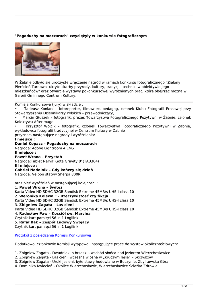 "Pogaduchy na moczarach" zwyciężyły w konkursie fotograficznym W Żabnie odbyło się uroczyste wręczenie nagród w ramach konkursu fotograficznego "Zielony Pierścień Tarnowa- ukryte skarby przyrody, kultury, tradycji i techniki w obiektywie jego mieszkańców" oraz otwarcie wystawy pokonkursowej wyróżnionych prac, które obejrzeć można w Galerii Gminnego Centrum Kultury. Komisja Konkursowa (Jury) w składzie : • Tadeusz Koniarz – fotoreporter, filmowiec, pedagog, członek Klubu Fotografii Prasowej przy Stowarzyszeniu Dziennikarzy Polskich – przewodniczący, • Marcin Głuszek – fotografik, prezes Towarzystwa Fotograficznego Pozytywni w Żabnie, członek Kolektywu Afterimage • Krzysztof Wójcik – fotografik, członek Towarzystwa Fotograficznego Pozytywni w Żabnie, wykładowca fotografii tradycyjnej w Centrum Kultury w Żabnie przyznała następujące nagrody i wyróżnienia: I miejsce : Daniel Kopacz – Pogaduchy na moczarach Nagroda: Adobe Lightroom 4 ENG II miejsce : Paweł Wrona – Przystań Nagroda:Tablet Narvik Gota Gravity 8”(TAB364) III miejsce : Gabriel Nadolnik – Gdy kończy się dzień Nagroda: Velbon statyw Sherpa 800R oraz pięć wyróżnień w następującej kolejności : 1. Paweł Wrona – Świteź Karta Video HD SDHC 32GB Sandisk Extreme 45MB/s UHS-I class 10 2. Weronika Kolewa ¬– Rzeczywistość czy fikcja Karta Video HD SDHC 32GB Sandisk Extreme 45MB/s UHS-I class 10 3. Zbigniew Zagata – Las cieni Karta Video HD SDHC 32GB Sandisk Extreme 45MB/s UHS-I class 10 4. Radosław Paw – Kościół św. Marcina Czytnik kart pamięci 56 in 1 Logilink 5. Rafał Bąk – Zespół Ludowy Swojacy Czytnik kart pamięci 56 in 1 Logilink Protokół z posiedzenia Komisji Konkursowej Dodatkowo, członkowie Komisji wytypowali następujące prace do wystaw okolicznościowych: 1. 2. 3. 4. Zbigniew Zagata - Dwudniaki o brzasku, wschód słońca nad jeziorem Wierzchosławice Zbigniew Zagata - Las cieni, wczesna wiosna w „kruczym lesie” – Skrzyszów Zbigniew Zagata - Uroki jesieni, byłe stawy hodowlane w Buczynie, Zbylitowska Góra Dominika Kwiecień - Okolice Wierzchosławic, Wierzchosławice Ścieżka Zdrowia 1/2 5. Paweł Wrona - ”Świteź „ – poranek na stawie Błotnica Lasy Wierzchosławicko-Radłowskie 6. Paweł Wrona - „O poranku w mgły oparach”- staw Błotnica Lasy Wierzchosławicko-Radłowskie 7. Paweł Wrona - „Przystań” staw Błotnica, Lasy Wierzchosławicko-Radłowskie 8. Radosław Paw - Kościół Św. Marcina w Zawadzie, Zawada k. Tarnowa 9. Radosław Paw - Koń- Ranczo U Jarmuły - Stare Żukowice 10. Stanisław Plebanek – „Korowód dożynkowy” przedstawiciel sołectwa Skrzyszów 11. Rafał Bąk - „Zespół Ludowy Swojacy” na terenie obejścia domu rodzinnego Wincentego Witosa w Wierzchosławicach ( Dwudniaki) 12. Magdalena Nowak - „Złowroga natura” – kłosy zbóż na tle nadchodzącej burzy pola w Wietrzychowicach 13. Magdalena Nowak - „Współczesny rycerz”- zbroja wykonana przez 16-letniego płatnerza z zamiłowania. (Wietrzychowice) 14. Gabriel Nadolnik - „Gdy kończy się dzień” - lampa naftowa z zabytkową zabudową kuchenną w tle - Skrzyszów 15. Gabriel Nadolnik - „Sto Lat w Samotności”- Stępa do tłuczenia m.in. zboża, Skrzyszów 16. Gabriel Nadolnik - „Wrota Historii” - zabytkowa sień w starym domu, Skrzyszów 17. Lidia Mazur - „Harmonia natury” - zdjęcie wykonane nad jeziorem Jadowniki Mokre - Gmina Wietrzychowice 18. Adam Żołądź – Pomnik – cmentarz wojenny nr 253 w Żabnie 19. Weronika Kolewa - „Ścieżka czterech pór roku”- Gmina Skrzyszów 20. Weronika Kolewa - „Rzeczywistość czy fikcja”- Gmina Skrzyszów 21. Daniel Kopacz - „Pogaduchy na moczarach”- wiosną na stawach hodowlanych w Wierzchosławicach swoje gody odbywają żaby moczarowe. Samce tych żab przybierają niebieski kolor, a odgłosy wydawane przez nie przypominają gotującą się wodę. Wszystko to trwa zaledwie kilka wiosennych dni - Wierzchosławice 22. Daniel Kopacz - „Świt na stawach”- pierwsze promienie słońca padające na porośnięte trzcinami małe wysepki zlokalizowane na środku stawu Okniska - Wierzchosławice 23. Daniel Kopacz - „Wschód słońca”- wiosenny wschód słońca na stawie hodowlanym Okniska. –Wierzchosławice 24. Tomasz Sobczak - Lisogórskie wzgórze od strony południowej - Lisia Góra fotografie: Sebastian Maciejko /TFP, Reporters.pl/ 2/2 Powered by TCPDF (www.tcpdf.org)