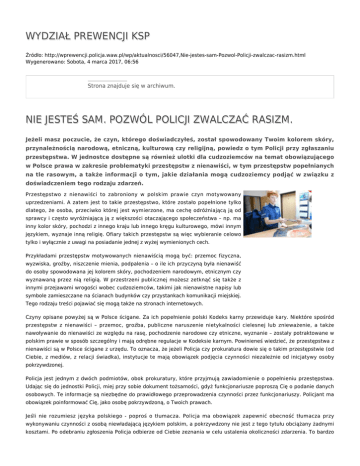 WYDZIAŁ PREWENCJI KSP Źródło: http://wprewencji.policja.waw.pl/wp/aktualnosci/56047,Nie-jestes-sam-Pozwol-Policji-zwalczac-rasizm.html Wygenerowano: Sobota, 4 marca 2017, 06:56 Strona znajduje się w archiwum. NIE JESTEŚ SAM. POZWÓL POLICJI ZWALCZAĆ RASIZM. Jeżeli masz poczucie, że czyn, którego doświadczyłeś, został spowodowany Twoim kolorem skóry, przynależnością narodową, etniczną, kulturową czy religijną, powiedz o tym Policji przy zgłaszaniu przestępstwa. W jednostce dostępne są również ulotki dla cudzoziemców na temat obowiązującego w Polsce prawa w zakresie problematyki przestępstw z nienawiści, w tym przestępstw popełnianych na tle rasowym, a także informacji o tym, jakie działania mogą cudzoziemcy podjąć w związku z doświadczeniem tego rodzaju zdarzeń. Przestępstwo z nienawiści to zabroniony w polskim prawie czyn motywowany uprzedzeniami. A zatem jest to takie przestępstwo, które zostało popełnione tylko dlatego, że osoba, przeciwko której jest wymierzone, ma cechę odróżniającą ją od sprawcy i często wyróżniającą ją z większości otaczającego społeczeństwa – np. ma inny kolor skóry, pochodzi z innego kraju lub innego kręgu kulturowego, mówi innym językiem, wyznaje inną religię. Ofiary takich przestępstw są więc wybieranie celowo tylko i wyłącznie z uwagi na posiadanie jednej z wyżej wymienionych cech. Przykładami przestępstw motywowanych nienawiścią mogą być: przemoc fizyczna, wyzwiska, groźby, niszczenie mienia, podpalenia – o ile ich przyczyną była nienawiść do osoby spowodowana jej kolorem skóry, pochodzeniem narodowym, etnicznym czy wyznawaną przez nią religią. W przestrzeni publicznej możesz zetknąć się także z innymi przejawami wrogości wobec cudzoziemców, takimi jak nienawistne napisy lub symbole zamieszczane na ścianach budynków czy przystankach komunikacji miejskiej. Tego rodzaju treści pojawiać się mogą także na stronach internetowych. Czyny opisane powyżej są w Polsce ścigane. Za ich popełnienie polski Kodeks karny przewiduje kary. Niektóre spośród przestępstw z nienawiści – przemoc, groźba, publiczne naruszenie nietykalności cielesnej lub znieważenie, a także nawoływanie do nienawiści ze względu na rasę, pochodzenie narodowe czy etniczne, wyznanie – zostały potraktowane w polskim prawie w sposób szczególny i mają odrębne regulacje w Kodeksie karnym. Powinieneś wiedzieć, że przestępstwa z nienawiści są w Polsce ścigane z urzędu. To oznacza, że jeżeli Policja czy prokuratura dowie się o takim przestępstwie (od Ciebie, z mediów, z relacji świadka), instytucje te mają obowiązek podjęcia czynności niezależnie od inicjatywy osoby pokrzywdzonej. Policja jest jednym z dwóch podmiotów, obok prokuratury, które przyjmują zawiadomienie o popełnieniu przestępstwa. Udając się do jednostki Policji, miej przy sobie dokument tożsamości, gdyż funkcjonariusze poproszą Cię o podanie danych osobowych. Te informacje są niezbędne do prawidłowego przeprowadzenia czynności przez funkcjonariuszy. Policjant ma obowiązek poinformować Cię, jako osobę pokrzywdzoną, o Twoich prawach. Jeśli nie rozumiesz języka polskiego - poproś o tłumacza. Policja ma obowiązek zapewnić obecność tłumacza przy wykonywaniu czynności z osobą niewładającą językiem polskim, a pokrzywdzony nie jest z tego tytułu obciążany żadnymi kosztami. Po odebraniu zgłoszenia Policja odbierze od Ciebie zeznania w celu ustalenia okoliczności zdarzenia. To bardzo ważne, abyś podał jak najbardziej szczegółowe informacje na temat przebiegu zdarzenia i sprawcy/sprawców czynu. Im bardziej będą one precyzyjne, tym większą szansę ma Policja, by zidentyfikować i zatrzymać sprawcę oraz doprowadzić do jego ukarania. Zwróć uwagę w szczególności na wygląd sprawcy, jego znaki szczególne, tatuaże, wypowiedziane przez niego słowa. Pamiętaj, że Twój udział w postępowaniu nie kończy się na zgłoszeniu przestępstwa. Policja lub prokuratura, prowadząc postępowanie, będzie potrzebowała Twojego współdziałania. Możesz więc zostać poproszony o ponowne przyjście i uzupełnienie zeznań, bądź o udział w czynnościach mających na celu identyfikację sprawcy. Brak współdziałania z Policją ze strony pokrzywdzonego lub świadka może uniemożliwić postawienie sprawcom zarzutów i zniweczyć wysiłek, jaki włożyłeś w zgłoszenie przestępstwa. http://www.reportracism.pl/ /ego/ Ocena: 0/5 (0) Tweetnij