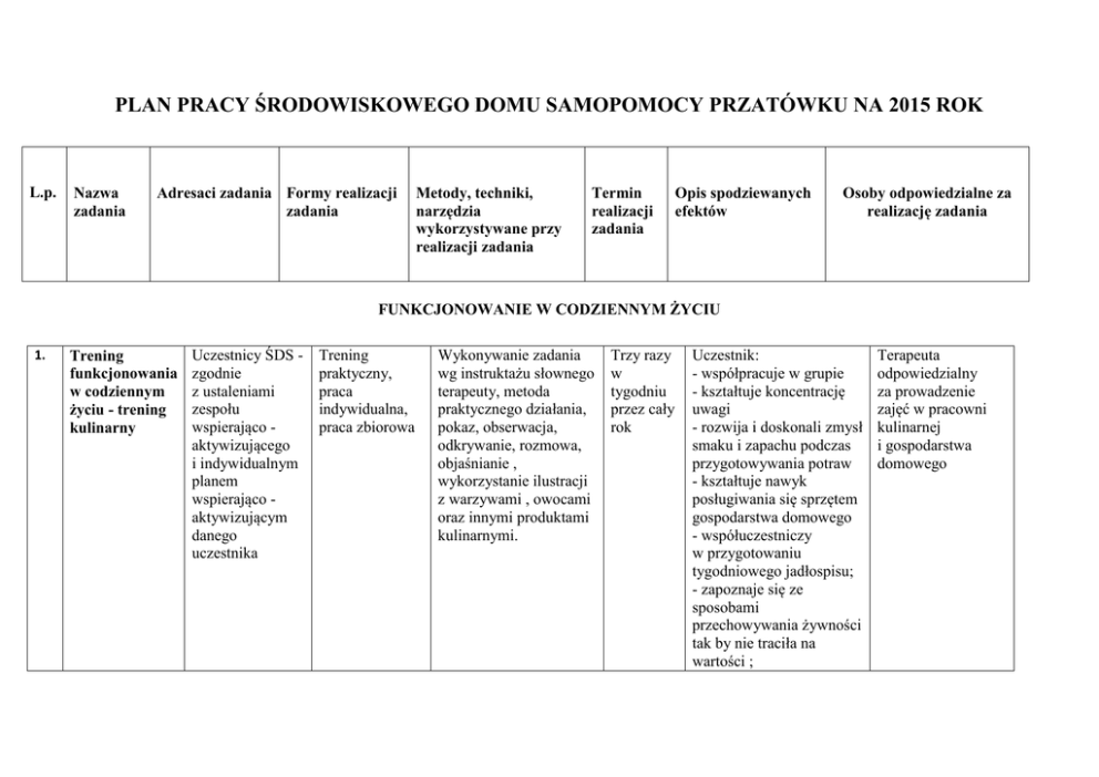 PLAN PRACY ŚRODOWISKOWEGO DOMU SAMOPOMOCY PRZATÓWKU NA 2015 ROK L.p. Nazwa zadania Adresaci zadania Formy realizacji zadania Metody, techniki, narzędzia wykorzystywane przy realizacji zadania Termin realizacji zadania Opis spodziewanych efektów Osoby odpowiedzialne za realizację zadania FUNKCJONOWANIE W CODZIENNYM ŻYCIU 1. Trening funkcjonowania w codziennym życiu - trening kulinarny Uczestnicy ŚDS zgodnie z ustaleniami zespołu wspierająco aktywizującego i indywidualnym planem wspierająco aktywizującym danego uczestnika Trening praktyczny, praca indywidualna, praca zbiorowa Wykonywanie zadania wg instruktażu słownego terapeuty, metoda praktycznego działania, pokaz, obserwacja, odkrywanie, rozmowa, objaśnianie , wykorzystanie ilustracji z warzywami , owocami oraz innymi produktami kulinarnymi. Trzy razy w tygodniu przez cały rok Uczestnik: - współpracuje w grupie - kształtuje koncentrację uwagi - rozwija i doskonali zmysł smaku i zapachu podczas przygotowywania potraw - kształtuje nawyk posługiwania się sprzętem gospodarstwa domowego - współuczestniczy w przygotowaniu tygodniowego jadłospisu; - zapoznaje się ze sposobami przechowywania żywności tak by nie traciła na wartości ; Terapeuta odpowiedzialny za prowadzenie zajęć w pracowni kulinarnej i gospodarstwa domowego - udoskonala umiejętności rozpoznawania produktów po ich cechach i właściwościach odbieranych za pomocą zmysłów; - przed rozpoczęciem zajęć przygotowuje narzędzia kuchenne; - rozpoznaje owoce za pomocą smaku; - samodzielnie przygotowuje owocowe szaszłyki oraz kolorowe kanapki; -uczestniczy w uroczystej degustacji. 2. Trening funkcjonowania w codziennym życiu - trening samoobsługi i higieny osobistej Uczestnicy ŚDS zgodnie z ustaleniami zespołu wspierająco aktywizującego i indywidualnym planem wspierająco aktywizującym danego uczestnika. Trening praktyczny, praca indywidualna, praca zbiorowa Wykonywanie zadania wg instruktażu słownego terapeuty, pokaz, oraz obserwacja, rozmowy indywidualne, pogadanki grupowe. Codziennie (od poniedziałku do piątku), przez cały rok Uczestnik: - samodzielnie się ubiera ( ubranie wierzchnie – kurtka, czapka, buty itp.) w asyście terapeuty czy osoby trzeciej: - rozumie jak ważny dla zdrowia jest właściwy dobór odzieży i obuwia; -codziennie zmienia bieliznę osobistą; - dba o higienę jamy ustnej; - regularnie myje swoje ciało z użyciem mydła lub innych detergentów; -odróżnia płyn do prania od płynu do płukania; - samodzielnie pierze brudną bieliznę;. -potrafi podać choroby , które są skutkiem nieprzestrzegania higieny; - po załatwieniu spraw fizjologicznych zawsze myje ręce, również przed posiłkiem i po posiłku; - dba o czystość podczas spożywania posiłku posługując się sztućcami. Instruktorzy terapii, terapeuci 3. Trening funkcjonowania w codziennym życiu - trening gospodarczo techniczny Uczestnicy ŚDS zgodnie z ustaleniami zespołu wspierająco aktywizującego i indywidualnym planem wspierająco aktywizującym danego uczestnika Trening praktyczny, praca zbiorowa, Wykonywanie zadania wg instruktażu słownego terapeuty, pokaz, obserwacja Codziennie (od poniedziałku do piątku), według ustalonych dyżurów oraz w zależności od potrzeb Uczestnicy: - dbają o porządek w pomieszczeniach ośrodka; - po zakończeniu zajęć układają przybory terapeutyczne na miejsce do tego przeznaczone; - wycierają stoliki; zamiatają podłogę; - odkurzają wykładzinę; - podlewają kwiaty doniczkowe - wynoszą śmieci; - po zakończeniu zajęć kulinarnych wkładają naczynia do zmywarki; - segregują sztućce, chowają deski i przybory kuchenne do szafek; - zabrudzone ściereczki kuchenne wkładają do pralki ; - w okresie wiosenno – letnim często spędzają czas w ogrodzie - wygrabiają liście z trawników; - podlewają kwiaty; - pielęgnują grządki. - zamiatają powierzchnię wokół budynku; - po zakończeniu zajęć segregują i konserwują narzędzia ogrodnicze; - pamiętają o schowaniu narzędzi do pomieszczenia gospodarczego Terapeuta odpowiedzialny za prowadzenie treningu gospodarczotechnicznego UMIEJĘTNOŚCI INTERPERSONALNE I ROZWIĄZYWANIE PROBLEMÓW 4. Trening umiejętności interpersonalnych i rozwiązywania problemów Uczestnicy ŚDS – zgodnie z ustaleniami zespołu wspierająco aktywizującego i indywidualnym planem wspierająco aktywizującym danego uczestnika Zebrania wszystkich uczestników spotkania indywidualne, spotkania grupowe Indywidualne rozmowy i ćwiczenia . Rozmowy terapeutyczne, wspierające. Ukierunkowana rozmowa, oparta na dobrym przykładzie w grupie. Dyskusje, wymiana poglądów, pogadanki . Praca ciągła przez cały rok ; w zależności od potrzeb Uczestnicy: - Podtrzymują i poszerzają kontakty interpersonalne w środowisku osób niepełnosprawnych i poza nim; -poprawiają poczucie własnej wartości dzięki prezentacji swoich umiejętności i ukrytego talentu; - nabywają nowe doświadczenia, są bardziej samodzielni dzięki wyjazdom poza miejsce zamieszkania; - poznają instytucje działające na terenie powiatu; -poznają własny region, jego kulturę i tradycję, - poprawnie określają czas, dni tygodnia , miesiące, pory roku; - rozwijają i utrwalają umiejętności czytania, pisania oraz liczenia; - rozróżniają koleżeństwo przyjaźń i miłość. Instruktor terapii odpowiedzialny za prowadzenie pracowni pedagogiczno – manualnej z pomocą pozostałych terapeutów TRENING SPĘDZANIA CZASU WOLNEGO 5. Trening umiejętności spędzania czasu wolnego trening muzyczno teatralny Uczestnicy ŚDS zgodnie z ustaleniami zespołu wspierająco aktywizującego i indywidualnym planem wspierająco aktywizującym danego uczestnika Praca indywidualna, praca grupowa Pokaz ,obserwacja, metody stosowane: relaksacyjne, kreatywne, wyobrażeniowe. Narzędzia wykorzystywane : Instrumenty muzyczne, płyty z utworami , teksty wierszy, śpiewniki W zależności od potrzeb,