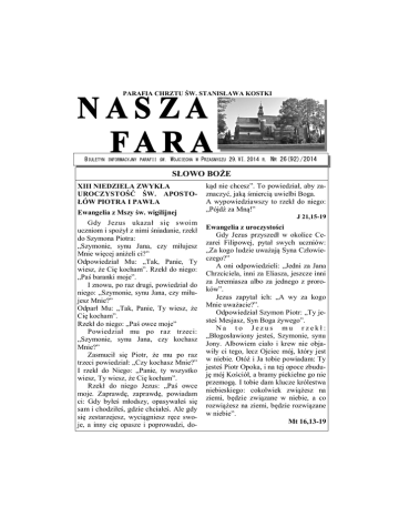 PARAFIA CHRZTU ŚW. STANISŁAWA KOSTKI BIULETYN INFORMACYJNY PARAFII ŚW. WOJCIECHA W PRZASNYSZU 29.VI.2014 R. NR 26(92)/2014 SŁOWO BOŻE Ewangelia z Mszy św. wigilijnej kąd nie chcesz”. To powiedział, aby zaznaczyć, jaką śmiercią uwielbi Boga. A wypowiedziawszy to rzekł do niego: „Pójdź za Mną!” Gdy Jezus ukazał się swoim uczniom i spożył z nimi śniadanie, rzekł do Szymona Piotra: „Szymonie, synu Jana, czy miłujesz Mnie więcej aniżeli ci?” Odpowiedział Mu: „Tak, Panie, Ty wiesz, że Cię kocham”. Rzekł do niego: „Paś baranki moje”. I znowu, po raz drugi, powiedział do niego: „Szymonie, synu Jana, czy miłujesz Mnie?” Odparł Mu: „Tak, Panie, Ty wiesz, że Cię kocham”. Rzekł do niego: „Paś owce moje” Powiedział mu po raz trzeci: „Szymonie, synu Jana, czy kochasz Mnie?” Zasmucił się Piotr, że mu po raz trzeci powiedział: „Czy kochasz Mnie?” I rzekł do Niego: „Panie, ty wszystko wiesz, Ty wiesz, że Cię kocham”. Rzekł do niego Jezus: „Paś owce moje. Zaprawdę, zaprawdę, powiadam ci: Gdy byłeś młodszy, opasywałeś się sam i chodziłeś, gdzie chciałeś. Ale gdy się zestarzejesz, wyciągniesz ręce swoje, a inny cię opasze i poprowadzi, do- Ewangelia z uroczystości Gdy Jezus przyszedł w okolice Cezarei Filipowej, pytał swych uczniów: „Za kogo ludzie uważają Syna Człowieczego?” A oni odpowiedzieli: „Jedni za Jana Chrzciciela, inni za Eliasza, jeszcze inni za Jeremiasza albo za jednego z proroków”. Jezus zapytał ich: „A wy za kogo Mnie uważacie?”. Odpowiedział Szymon Piotr: „Ty jesteś Mesjasz, Syn Boga żywego”. Na to Jezus mu rzekł: „Błogosławiony jesteś, Szymonie, synu Jony. Albowiem ciało i krew nie objawiły ci tego, lecz Ojciec mój, który jest w niebie. Otóż i Ja tobie powiadam: Ty jesteś Piotr Opoka, i na tej opoce zbuduję mój Kościół, a bramy piekielne go nie przemogą. I tobie dam klucze królestwa niebieskiego: cokolwiek zwiążesz na ziemi, będzie związane w niebie, a co rozwiążesz na ziemi, będzie rozwiązane w niebie”. Mt 16,13-19 XIII NIEDZIELA ZWYKŁA UROCZYSTOŚĆ ŚW. APOSTOŁÓW PIOTRA I PAWŁA J 21,15-19 Z nauczania św.. Jana Pawła II Enczklika Redemptor hominis ( pkt. 16) Jeśli przeto ten nasz czas, czas zbliżającego się do końca drugiego tysiąclecia naszej chrześcijańskiej ery, jawi się nam jako czas wielkiego postępu, to równocześnie też jako czas wielorakiego zagrożenia człowieka, o którym Kościół musi mówić do wszystkich ludzi dobrej woli, o którym musi z nimi wciąż rozmawiać. Sytuacja bowiem człowieka w świecie współczesnym wydaje się daleka od obiektywnych wymagań porządku moralnego, daleka od wymagań sprawiedliwości, a tym bardziej miłości społecznej. Chodzi tutaj nie o co innego, tylko właśnie o to, co znalazło wyraz już w pierwszym orędziu Stwórcy skierowanym do człowieka, gdy oddawał mu ziemię, by czynił ją sobie „poddaną”. To pierwotne wezwanie zostało potwierdzone w Tajemnicy Odkupienia przez Chrystusa Pana, czemu wyraz daje Sobór Watykański II, poświęcając szczególnie piękne rozdziały swego magisterium „królewskości” człowieka, to znaczy jego powołaniu do uczestniczenia w królewskiej misji (in munere regali) samego Chrystusa. Istotny sens tej „królewskości”, tego „panowania” człowieka w świecie widzialnym, zadanym mu przez samego Stwórcę, leży w pierwszeństwie etyki przed techniką, leży w prymacie osoby w stosunku do rzeczy, leży w pierwszeństwie ducha wobec materii. I dlatego też trzeba gruntownie śledzić wszystkie procesy rozwoju współczesnego, trzeba niejako prześwietlać poszczególne jego etapy pod tym właśnie kątem widzenia. Chodzi o rozwój osób, a nie tylko o mnożenie rzeczy, którymi osoby mogą się posługiwać. Chodzi o to, aby — jak to sformułował współczesny myśliciel, a powtórzył Sobór — nie tyle „więcej mieć”, ile „bardziej być”. Istnieje bowiem bardzo realne i wyczuwalne już niebezpieczeństwo, że wraz z olbrzymim postępem w opanowaniu przez człowieka świata rzeczy, człowiek gubi istotne wątki swego wśród nich panowania, na różne sposoby podporządkowuje im swoje człowieczeństwo, sam staje się przedmiotem wielorakiej — czasem bezpośrednio nieuchwytnej — manipulacji poprzez całą organizację życia zbiorowego, poprzez system produkcji, poprzez nacisk środków przekazu społecznego. Człowiek nie może zrezygnować z siebie, ze swojego właściwego miejsca w świecie widzialnym, nie może stać się niewolnikiem rzeczy, samych stosunków ekonomicznych, niewolnikiem produkcji, niewolnikiem swoich własnych wytworów. Cywilizacja o profilu czysto materialistycznym — z pewnością nieraz wbrew intencjom i założeniom swych pionierów — oddaje człowieka w taką niewolę. U korzenia współczesnej troski o człowieka leży z pewnością ta sprawa. Nie chodzi tu tylko o abstrakcyjną odpowiedź na pytanie, kim jest człowiek, ale o cały dynamizm życia i cywilizacji, o sens różnych poczynań życia codziennego, a równocześnie założeń wielu programów cywilizacyjnych, politycznych, ekonomicznych, społecznych, ustrojowych i wielu innych. Jest przecież dobrze znany fakt cywilizacji konsumpcyjnej, która ma swoje źródło w jakimś nadmiarze dóbr potrzebnych dla człowieka, dla całych społeczeństw — a chodzi tu właśnie o społeczeństwo bogate i wysoko rozwinięte — podczas gdy z drugiej strony inne społeczeństwa, przynajmniej szerokie ich kręgi, głodują, a wielu codziennie umiera z głodu, z niedożywienia. W parze z tym idzie jakieś nadużycie wolności jednych, co łączy się właśnie z niekontrolowaną etycznie postawą konsumpcyjną, przy równoczesnym ograniczaniu wolności drugich, tych, którzy odczuwają dotkliwe braki, którzy zostają zepchnięci w warunki nędzy i upośledzenia. To powszechnie znane porównanie i przeciwstawi