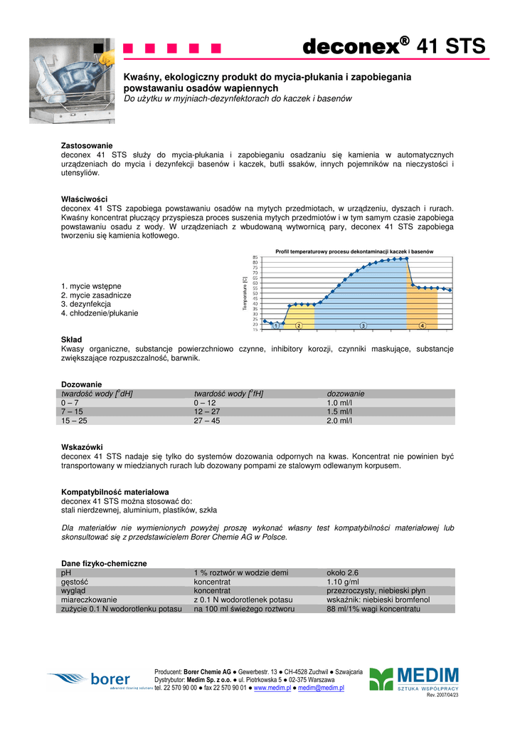 deconex® 41 STS ■ ■ ■ ■ ■ ■ Kwaśny, ekologiczny produkt do mycia-płukania i zapobiegania powstawaniu osadów wapiennych Do użytku w myjniach-dezynfektorach do kaczek i basenów Zastosowanie deconex 41 STS służy do mycia-płukania i zapobieganiu osadzaniu się kamienia w automatycznych urządzeniach do mycia i dezynfekcji basenów i kaczek, butli ssaków, innych pojemników na nieczystości i utensyliów. Właściwości deconex 41 STS zapobiega powstawaniu osadów na mytych przedmiotach, w urządzeniu, dyszach i rurach. Kwaśny koncentrat płuczący przyspiesza proces suszenia mytych przedmiotów i w tym samym czasie zapobiega powstawaniu osadu z wody. W urządzeniach z wbudowaną wytwornicą pary, deconex 41 STS zapobiega tworzeniu się kamienia kotłowego. Profil temperaturowy procesu dekontaminacji kaczek i basenów 1. mycie wstępne 2. mycie zasadnicze 3. dezynfekcja 4. chłodzenie/płukanie Skład Kwasy organiczne, substancje powierzchniowo czynne, inhibitory korozji, czynniki maskujące, substancje zwiększające rozpuszczalność, barwnik. Dozowanie o twardość wody [ dH] 0–7 7 – 15 15 – 25 o twardość wody [ fH] 0 – 12 12 – 27 27 – 45 dozowanie 1.0 ml/l 1.5 ml/l 2.0 ml/l Wskazówki deconex 41 STS nadaje się tylko do systemów dozowania odpornych na kwas. Koncentrat nie powinien być transportowany w miedzianych rurach lub dozowany pompami ze stalowym odlewanym korpusem. Kompatybilność materiałowa deconex 41 STS można stosować do: stali nierdzewnej, aluminium, plastików, szkła Dla materiałów nie wymienionych powyżej proszę wykonać własny test kompatybilności materiałowej lub skonsultować się z przedstawicielem Borer Chemie AG w Polsce. Dane fizyko-chemiczne pH gęstość wygląd miareczkowanie zużycie 0.1 N wodorotlenku potasu 1 % roztwór w wodzie demi koncentrat koncentrat z 0.1 N wodorotlenek potasu na 100 ml świeżego roztworu około 2.6 1.10 g/ml przezroczysty, niebieski płyn wskaźnik: niebieski bromfenol 88 ml/1% wagi koncentratu Producent: Borer Chemie AG ● Gewerbestr. 13 ● CH-4528 Zuchwil ● Szwajcaria Dystrybutor: Medim Sp. z o.o. ● ul. Piotrkowska 5 ● 02-375 Warszawa tel. 22 570 90 00 ● fax 22 570 90 01 ● www.medim.pl ● [email protected] Rev. 2007/04/23 ■ ■ ■ ■ ■ ■ deconex® 41 STS Dostępność Proszę pytać lokalnego dystrybutora o dostępne wielkości opakowań. Pojemniki, zakrętki i etykiety są wykonane z polietylenu podlegającemu recyklingowi. Dodatkowe informacje Informacje dotyczące bezpieczeństwa pracy, przechowywania, usuwania odpadów znajdują się w karcie charakterystyki substancji niebezpiecznej. Proszę skorzystać z naszego know-how ! Proszę się z nami skontaktować, aby zastosować nasze produkty do Państwa specyficznych zastosowań. Wszystkie powyższe informacje są oparte na naszej aktualnej wiedzy i nie mogą stanowić zabezpieczenia specyficznych właściwości produktu. Producent: Borer Chemie AG ● Gewerbestr. 13 ● CH-4528 Zuchwil ● Szwajcaria Dystrybutor: Medim Sp. z o.o. ● ul. Piotrkowska 5 ● 02-375 Warszawa tel. 22 570 90 00 ● fax 22 570 90 01 ● www.medim.pl ● [email protected] Rev. 2007/04/23
