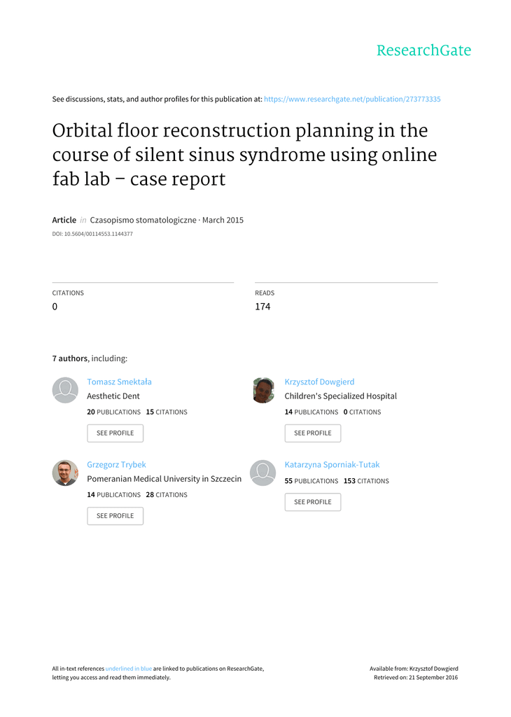 Seediscussions,stats,andauthorprofilesforthispublicationat:https://www.researchgate.net/publication/273773335 Orbitalfloorreconstructionplanninginthe courseofsilentsinussyndromeusingonline fablab–casereport ArticleinCzasopismostomatologiczne·March2015 DOI:10.5604/00114553.1144377 CITATIONS READS 0 174 7authors,including: TomaszSmektała KrzysztofDowgierd AestheticDent Children'sSpecializedHospital 20PUBLICATIONS15CITATIONS 14PUBLICATIONS0CITATIONS SEEPROFILE SEEPROFILE GrzegorzTrybek KatarzynaSporniak-Tutak PomeranianMedicalUniversityinSzczecin 55PUBLICATIONS153CITATIONS 14PUBLICATIONS28CITATIONS SEEPROFILE SEEPROFILE Allin-textreferencesunderlinedinbluearelinkedtopublicationsonResearchGate, lettingyouaccessandreadthemimmediately. Availablefrom:KrzysztofDowgierd Retrievedon:21September2016 J Stomatol 2015; 68, 1: © 2014 Polish Dental Society DOI: O R IC GA IS NE A LR E AP RO T RI TC L E Orbital floor reconstruction planning in the course of silent sinus syndrome using online fab lab – case report Planowanie zabiegu rekonstrukcji dna oczodołu, w przebiegu zespołu cichej zatoki, we współpracy z online fab lab. Opis przypadku Paweł Berczyński1, Tomasz Smektała2, Dorota Oskwarek3, Krzysztof Dowgierd4, Grzegorz Trybek2, Katarzyna Lewusz2, Katarzyna Sporniak-Tutak5 1Katedra i Zakład Stomatologii Zachowawczej i Endodoncji, Pomorski Uniwersytet Medyczny w Szczecinie, Polska Chair and Department of Conservative Dentistry and Endodontics, Pomeranian Medical University in Szczecin, Poland Head: prof. dr hab. J. Buczkowska-Radlińska 2 Zakład Chirurgii Stomatologicznej, Pomorski Uniwersytet Medyczny w Szczecinie, Polska Department of Oral Surgery, Pomeranian Medical University in Szczecin, Poland Head: dr n. med. G. Trybek 3 Prywatna praktyka stomatologiczna, Szczecin, Polska Private dental practice in Szczecin, Poland 4 Oddział Chirurgii Szczękowo-Twarzowej, Rekonstrukcyjnej i Estetycznej w Wojewódzkim Specjalistycznym Szpitalu Dziecięcym w Olsztynie, Polska Department of Maxillofacial Surgery, Reconstructive and Aesthetic Surgery, The Regional Children’s Specialized in Olsztyn, Poland Head: lek. dent. K. Dowgierd 5Klinika Chirurgii Szczękowo-Twarzowej, Pomorski Uniwersytet Medyczny w Szczecinie, Polska Clinic of Maxillofacial Surgery, Pomeranian Medical University in Szczecin, Poland Head: dr hab. n. med. K. Sporniak-Tutak Abstract Streszczenie Silent sinus syndrome is rarely presented in Polish literature. This case report illustrating the deformation of the orbital floor in the course of silent sinus syndrome shows the use of rapid prototyping technology in the planning of orbital floor reconstruction surgery, with particular emphasis on the preparation stage of a virtual model. The starting point was computed tomography imaging. Using open source software, a virtual reconstruction of the orbit was obtained. A model was then produced by means of a laser sintering technique using online Fab Lab (Sculpteo). Prior to surgery, a semi-individual titanium plate was moulded from the prepared form, which was then used as a next step in the reconstruction of a new orbital floor. Zespół cichej zatoki jest jednostką chorobową rzadko prezentowaną w polskim piśmiennictwie. Opisany przypadek kliniczny, deformacji dna oczodołu w przebiegu zespołu cichej zatoki, przedstawia wykorzystanie technologii szybkiego prototypowania w procesie planowania zabiegu rekonstrukcji dna oczodołu, ze szczególnym uwzględnieniem etapu przygotowania wirtualnego modelu. Punktem wyjścia było badanie tomograficzne. Za pomocą oprogramowania typu open source uzyskaliśmy gotową, wirtualną rekonstrukcję oczodołu. Model został następnie wyprodukowany techniką synteryzacji laserowej, przy wykorzystaniu online fab lab - Sculpteo. Na tak przygotowanej formie przedzabiegowo ukształtowano półindywidualną płytkę tytanową, która w dalszym etapie posłużyła do rekonstrukcji dna oczodołu. KEYWORDS: orbital fractures, maxillary sinus, rapid prototyping, silent sinus syndrome HASŁA INDEKSOWE: złamanie oczodołu, zatoka szczękowa, szybkie prototypowanie, zespół cichej zatoki http://www.jstoma.com 77 J Stomatol 2015; 68, 1 Introduction Berczyński P., Smektała T., Oskwarek D., Dowgierd K., Trybek G., Lewusz K., Sporniak-Tutak K. The definition of “silent sinus syndrome” (SSS) was first described by Soparkar in 1994.1 Since then, few clinical cases have been noted and described in Polish-language literature.2,3 The most important and hitherto unexplained aspect of the pathogenesis of this syndrome is the creation of negative pressure inside the maxillary sinus. As a result of this pressure, the side walls of the maxillary sinus collapse centrically. The ceiling, medial and lateral walls are shifted to produce larger volumes of the orbit.4 The most common symptoms are unilateral movement of the eyeball posteriorly and inferiorly caused by the asymmetrical position of the eyeballs. This asymmetry is manifested by the withdrawal of the upper eyelid on the side of affected maxillary sinus which hinders closing the eyelids (lagophthalamus). The onset of the disease is usually sudden and difficult to connect with a specific event. SSS is often linked to diplopia, as it points to the destruction of the orbital floor and dysfunction of the inferior oblique muscle.4-6 The absence of trauma, acute or chronic sinusitis, and no symptoms of pain are all characteristic. Silent sinus syndrome mainly occurs in males, between the third and fifth decade of life.7 Risk factors for the disease are anatomical anomalies in the region of the nasal cavity, in particular a lateral deformation of the middle nasal concha and nasal septum.7-10 The differential diagnosis should include: orbital blowout fracture, congenital hypoplasia of the maxillary sinus, post-traumatic deformation of the maxillary sinus and mucocoele. The treatment of choice for SSS is functional endoscopic sinus surgery (FESS). The goal of this p