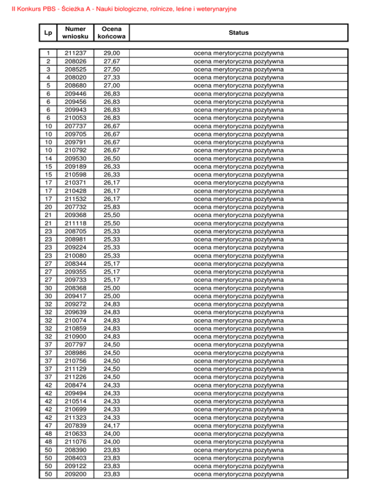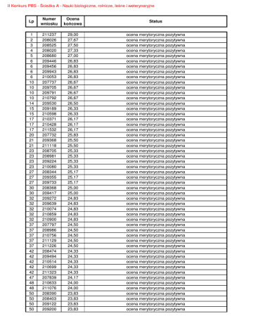 II Konkurs PBS - Ścieżka A - Nauki biologiczne, rolnicze, leśne i weterynaryjne Lp Numer wniosku Ocena końcowa Status 1 2 3 4 5 6 6 6 6 10 10 10 10 14 15 15 17 17 17 20 21 21 23 23 23 23 27 27 27 30 30 32 32 32 32 32 37 37 37 37 37 42 42 42 42 42 47 48 48 50 50 50 50 211237 208026 208525 208020 208680 209446 209456 209943 210053 207737 209705 209791 210792 209530 209189 210598 210371 210428 211532 207732 209368 211118 208705 208981 209224 210080 208344 209355 209733 208368 209417 209272 209639 210074 210859 210900 207797 208986 210756 211129 211226 208474 209494 210514 210699 211323 207839 210633 211076 208390 208403 209122 209200 29,00 27,67 27,50 27,33 27,00 26,83 26,83 26,83 26,83 26,67 26,67 26,67 26,67 26,50 26,33 26,33 26,17 26,17 26,17 25,83 25,50 25,50 25,33 25,33 25,33 25,33 25,17 25,17 25,17 25,00 25,00 24,83 24,83 24,83 24,83 24,83 24,50 24,50 24,50 24,50 24,50 24,33 24,33 24,33 24,33 24,33 24,17 24,00 24,00 23,83 23,83 23,83 23,83 ocena merytoryczna pozytywna ocena merytoryczna pozytywna ocena merytoryczna pozytywna ocena merytoryczna pozytywna ocena merytoryczna pozytywna ocena merytoryczna pozytywna ocena merytoryczna pozytywna ocena merytoryczna pozytywna ocena merytoryczna pozytywna ocena merytoryczna pozytywna ocena merytoryczna pozytywna ocena merytoryczna pozytywna ocena merytoryczna pozytywna ocena merytoryczna pozytywna ocena merytoryczna pozytywna ocena merytoryczna pozytywna ocena merytoryczna pozytywna ocena merytoryczna pozytywna ocena merytoryczna pozytywna ocena merytoryczna pozytywna ocena merytoryczna pozytywna ocena merytoryczna pozytywna ocena merytoryczna pozytywna ocena merytoryczna pozytywna ocena merytoryczna pozytywna ocena merytoryczna pozytywna ocena merytoryczna pozytywna ocena merytoryczna pozytywna ocena merytoryczna pozytywna ocena merytoryczna pozytywna ocena merytoryczna pozytywna ocena merytoryczna pozytywna ocena merytoryczna pozytywna ocena merytoryczna pozytywna ocena merytoryczna pozytywna ocena merytoryczna pozytywna ocena merytoryczna pozytywna ocena merytoryczna pozytywna ocena merytoryczna pozytywna ocena merytoryczna pozytywna ocena merytoryczna pozytywna ocena merytoryczna pozytywna ocena merytoryczna pozytywna ocena merytoryczna pozytywna ocena merytoryczna pozytywna ocena merytoryczna pozytywna ocena merytoryczna pozytywna ocena merytoryczna pozytywna ocena merytoryczna pozytywna ocena merytoryczna pozytywna ocena merytoryczna pozytywna ocena merytoryczna pozytywna ocena merytoryczna pozytywna II Konkurs PBS - Ścieżka A - Nauki biologiczne, rolnicze, leśne i weterynaryjne Lp Numer wniosku Ocena końcowa Status 54 55 55 57 58 58 60 60 60 60 60 65 65 67 67 69 69 69 69 73 73 75 75 75 78 79 79 81 82 83 84 85 86 87 87 89 90 90 92 93 94 94 94 94 98 99 100 101 102 103 104 105 105 210655 208552 210106 208987 208468 208652 209008 209068 209079 209581 210373 207962 210507 209293 209541 208085 208499 209299 210315 208892 210524 207916 211412 211435 208825 209537 211325 210025 210648 210215 211358 209683 210188 209112 210682 209962 209184 210519 209618 208884 207828 208891 210520 210777 210236 208837 210671 210432 209823 210515 210918 209617 209624 23,67 23,50 23,50 23,33 23,17 23,17 23,00 23,00 23,00 23,00 23,00 22,83 22,83 22,67 22,67 22,33 22,33 22,33 22,33 22,00 22,00 21,67 21,67 21,67 20,83 20,50 20,50 19,83 19,67 26,00 25,17 23,17 21,83 21,50 21,50 21,17 20,83 20,83 20,50 20,33 20,17 20,17 20,17 20,17 20,00 19,00 18,83 18,67 18,33 18,17 17,83 17,50 17,50 ocena merytoryczna pozytywna ocena merytoryczna pozytywna ocena merytoryczna pozytywna ocena merytoryczna pozytywna ocena merytoryczna pozytywna ocena merytoryczna pozytywna ocena merytoryczna pozytywna ocena merytoryczna pozytywna ocena merytoryczna pozytywna ocena merytoryczna pozytywna ocena merytoryczna pozytywna ocena merytoryczna pozytywna ocena merytoryczna pozytywna ocena merytoryczna pozytywna ocena merytoryczna pozytywna ocena merytoryczna pozytywna ocena merytoryczna pozytywna ocena merytoryczna pozytywna ocena merytoryczna pozytywna ocena merytoryczna pozytywna ocena merytoryczna pozytywna ocena merytoryczna pozytywna ocena merytoryczna pozytywna ocena merytoryczna pozytywna ocena merytoryczna pozytywna ocena merytoryczna pozytywna ocena merytoryczna pozytywna ocena merytoryczna pozytywna ocena merytoryczna pozytywna ocena merytoryczna negatywna ocena merytoryczna negatywna ocena merytoryczna negatywna ocena merytoryczna negatywna ocena merytoryczna negatywna ocena merytoryczna negatywna ocena merytoryczna negatywna ocena merytoryczna negatywna ocena merytoryczna negatywna ocena merytoryczna negatywna ocena merytoryczna negatywna ocena merytoryczna negatywna ocena merytoryczna negatywna ocena merytoryczna negatywna ocena merytoryczna negatywna ocena merytoryczna negatywna ocena merytoryczna negatywna ocena merytoryczna negatywna ocena merytoryczna negatywna ocena merytoryczna negatywna ocena merytoryczna negatywna ocena merytoryczna negatywna ocena merytoryczna negatywna ocena merytoryczna negatywna II Konkurs PBS - Ścieżka A - Nauki biologiczne, rolnicze, leśne i weterynaryjne Lp Numer wniosku Ocena końcowa Status 107 108 109 110 111 112 113 114 115 116 117 118 119 120 121 122 123 124 125 126 127 128 129 130 131 132 133 208502 211403 209545 208848 210938 211459 210906 209339 209445 209632 209391 209469 210784 207804 208208 208261 208600 208622 209038 209341 209476 209536 209715 210741 211177 211181 211487 17,00 16,67 16,17 16,00 15,00 14,83 13,83 - ocena merytoryczna negatywna ocena merytoryczna negatywna ocena merytoryczna negatywna ocena merytoryczna negatywna ocena merytoryczna negatywna ocena merytoryczna negatywna ocena merytoryczna negatywna odrzucony z powodów formalnych - protest uwzględniony odrzucony z powodów formalnych - protest uwzględniony odrzucony z powodów formalnych - protest uwzględniony odrzucony z powodów formalnych - protest nieuwzględniony odrzucony z powodów formalnych - protest nieuwzględniony odrzucony z powodów formalnych - pr