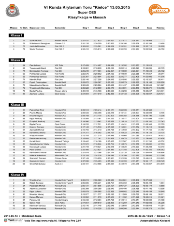 VI Runda Kryterium Toru "Kielce" 13.05.2015 Super OES Klasyfikacja w klasach Miejsce Nr Start. Nazwisko i imię Samochód Bieg 1 Bieg 2 Bieg 3 Bieg 4 Bieg 5 Czas Różnica Klasa I 1 77 Surma Erwin Nissan Micra 2:27.431 2:27.823 2:27.067 2:27.571 2:26.911 12:16.803 2 76 Wiśniewski Remigiusz Citroen C 1 2:31.135 2:30.259 2:30.563 2:29.100 2:29.236 12:30.293 13.490 3 75 Janduła Mirosław Fiat 126 P 2:35.632 2:35.581 2:34.819 2:33.781 2:32.899 12:52.712 35.909 4 78 Szuter Tomasz Fiat 126 P 2:34.412 2:35.813 2:36.668 2:38.793 2:37.267 13:02.953 46.150 Klasa II 1 64 Paw Łukasz VW Polo 2:17.428 2:14.497 2:14.556 2:13.782 2:13.653 11:13.916 2 65 Twardowski Karol Fiat CC 2:18.881 2:18.639 2:18.134 2:20.314 2:20.127 11:36.095 22.179 3 74 Domagalski Tomasz Fiat SC 2:20.249 2:17.964 2:22.421 2:19.680 2:20.334 11:40.648 26.732 4 69 Piotrowicz Łukasz Fiat Punto 2:22.676 2:20.862 2:21.133 2:19.930 2:20.256 11:44.857 30.941 5 66 Piotrowicz Mariusz Fiat Punto 2:23.397 2:23.894 2:22.829 2:23.277 2:22.495 11:55.892 41.976 6 71 Mendyk Piotr Fiat Uno 2:28.140 2:27.256 2:24.915 2:24.056 2:25.960 12:10.327 56.411 7 67 Pypeć Przemysław Suzuki Swift 2:28.672 2:26.367 2:27.183 2:28.579 2:28.365 12:19.166 1:05.250 8 70 Mazurkiewicz Marcin Suzuki Swift 2:32.649 2:29.924 2:30.688 2:31.437 2:30.845 12:35.543 1:21.627 9 72 Wesołowski Stanisław Fiat SC 2:36.522 2:42.599 2:33.179 2:34.601 2:33.470 13:00.371 1:46.455 10 73 Bajda Paulina Nissan Micra 2:49.618 2:45.768 2:43.623 2:43.298 2:35.940 13:38.247 2:24.331 11 83 Zachara Łukasz Opel Corsa 2:51.934 2:47.019 2:42.356 2:42.133 2:39.605 13:43.047 2:29.131 Klasa III 1 50 Pakosiński Piotr Honda CRX 2:09.513 2:09.414 2:10.171 2:08.709 2:08.181 10:45.988 2 49 Piwnik Maciej Honda CRX 2:09.545 2:08.498 2:09.215 2:10.131 2:09.304 10:46.693 3 48 Kruk Grzegorz Honda CRX 2:09.758 2:13.175 2:10.403 2:08.302 2:08.558 10:50.196 4.208 4 89 Kępa Andrzej Honda Civic 2:13.084 2:13.161 2:11.233 2:13.517 2:10.904 11:01.899 15.911 5 86 Przędzik Andrzej Łada 2:14.990 2:13.642 2:12.838 2:13.810 2:13.051 11:08.331 22.343 6 52 Bigda Zenon Opel Corsa 2:14.220 2:12.721 2:13.853 2:14.431 2:13.118 11:08.343 22.355 7 60 Kozicki Tomasz Honda Civic 2:17.145 2:15.530 2:15.028 2:15.001 2:13.512 11:16.216 30.228 8 51 Zalewski Michał Honda Civic 2:15.755 2:14.310 2:15.729 2:14.559 2:17.402 11:17.755 31.767 9 54 Kaniewska Iwona Honda Civic 2:17.311 2:16.092 2:14.727 2:16.522 2:14.470 11:19.122 33.134 10 61 Wojtunik Adam Honda Civic 2:12.705 2:31.215 2:17.846 2:10.060 2:11.085 11:22.911 36.923 11 57 Pasternak Andrzej Honda Civic 2:18.604 2:17.141 2:21.869 2:16.470 2:15.362 11:29.446 43.458 12 53 Kuraś Karol Renault Twingo 2:19.442 2:16.166 2:15.435 2:22.567 2:18.130 11:31.740 45.752 13 80 Gerashchenko Vitaliy Honda Civic 2:21.572 2:18.624 2:17.704 2:18.675 2:17.116 11:33.691 47.703 14 56 Kowalczyk Łukasz Honda Civic 2:21.749 2:19.621 2:19.818 2:18.820 2:19.290 11:39.298 53.310 15 55 Pater Dawid Peugeot 106 2:22.466 2:23.927 2:21.383 2:21.758 2:22.806 11:52.340 1:06.352 16 62 Karlikowski Michał Honda Civic 2:21.878 2:23.366 2:21.174 2:22.128 2:26.098 11:54.644 1:08.656 17 85 Małecki Arkadiusz Mitsubishi Colt 2:23.328 2:24.038 2:24.046 2:23.399 2:23.275 11:58.086 1:12.098 18 59 Szerszeń Tomasz Citroen Saxo 2:37.149 2:35.659 2:33.981 2:32.299 2:30.725 12:49.813 2:03.825 19 58 Gadomski Kamil Honda Civic 2:37.936 2:35.493 2:35.344 2:33.393 2:31.951 12:54.117 2:08.129 20 63 Smoliński Łukasz Audi A 3 2:43.181 2:42.586 2:47.054 2:43.970 2:44.076 13:40.867 2:54.879 0.705 Klasa IV 1 26 Wolski Artur Honda Civic Type R 2:06.813 2:06.369 2:04.943 2:04.061 2:05.408 10:27.594 2 22 Różak Tomasz Honda Civic Type R 2:06.835 2:06.231 2:05.704 2:05.350 2:05.378 10:29.498 3 24 Podsiadło Michał Renault Clio 2:09.131 2:07.505 2:07.121 2:06.127 2:06.590 10:36.474 8.880 4 45 Adamiak Jarosław Honda Civic 2:09.399 2:08.368 2:08.840 2:08.400 2:06.185 10:41.192 13.598 5 25 Kępa Łukasz Honda CTR 2:09.879 2:08.565 2:09.359 2:09.082 2:09.549 10:46.434 18.840 6 30 Niemiec Maciej Renault Clio 2:13.077 2:11.777 2:12.190 2:11.269 2:09.792 10:58.105 30.511 7 35 Kalara Mariusz Renault Clio 2:12.952 2:11.570 2:11.503 2:11.762 2:11.228 10:59.015 31.421 8 81 Polak Arvid Honda Integra 2:12.342 2:12.384 2:11.728 2:12.014 2:10.614 10:59.082 31.488 9 39 Sztorc Piotr Opel Astra 2:17.564 2:09.870 2:08.899 2:15.259 2:11.240 11:02.832 35.238 10 28 Modesan Mariusz Renault Clio 2:15.116 2:14.146 2:13.649 2:12.658 2:13.379 11:08.948 41.354 11 37 Podsiadło Andrzej Renault Clio 2:10.652 2:10.328 2:09.054 2:09.200 2:30.144 11:09.378 41.784 2015-06-13 / Miedziana Góra Vola Timing (www.vola.fr) / Msports Pro 2.07 1.904 2015-06-13 do 16:28 / Strona 1/4 VolaSoftControlPdf Automobilklub Kielecki VI Runda Kryterium Toru "Kielce" 13.05.2015 Super OES Klasyfikacja w klasach Miejsce Nr Start. Nazwisko i imię Samochód Bieg 1 Bieg 2 Bieg 3 Bieg 4 Bieg 5 Czas Różnica 12 42 Niemiec Michał Renault Clio 2:15.699 2:15.253 2:13.245 2:15.404 2:16.569 11:16.170 48.576 13 47 Kny Adam Honda 2:17.560 2:16.667 2:14.788 2:14.769 2:15.016 11:18.800 51.206 14 31 Gruca Michał Renault Clio 2:17.996 2:17.175 2:16.923 2:16.673 2:15.561 11:24.328 56.734 15 92 Wajman Filip Renault Clio 2:21.089 2:15.955 2:17.885 2:14.666 2:16.504 11:26.099 58.505 16 40 Zawłocki Krystian Renault Clio 2:24.286 2:21.360 2:19.359 2:18.793 2:18.102 11:41.900 1:14.306 17 29 Barcicki Łukasz BMW E 36 2:21.117 2:22.772 2:20.068 2:19.999 2:18.783 11:42.739 1:15.145 18 36 Adamczyk Michał BMW E 36 2:42.306 2:19.386 2:18.615 2:20.295 2:20.174 12:00.776 1:33.182 19 33 Lipowski Tomasz Renault Clio 2:26.196 2:22.530 2:24.689 2:24.598 2:24.727 12:02.740 1:35.146 20 44 Gonciarz Paweł BMW E 36 2:31.765 2:25.948 2:27.925 2:27.750 2:27.561 12:20.949 1:53.355 21 38 Stryszowski Jacek Peugeot 205 GTI 2:34.874 2:29.023 2:29.533 2:26.216 2:28.556 12:28.202 2:00.608 22 79 Krawczyk Jarosław Alfa Romeo 2:34.147 2:34.037 2:30.518 2:31.209 2:30.085 12:39.996 2:12.402 23 32 Kubat Iwona Peugeot 205 R