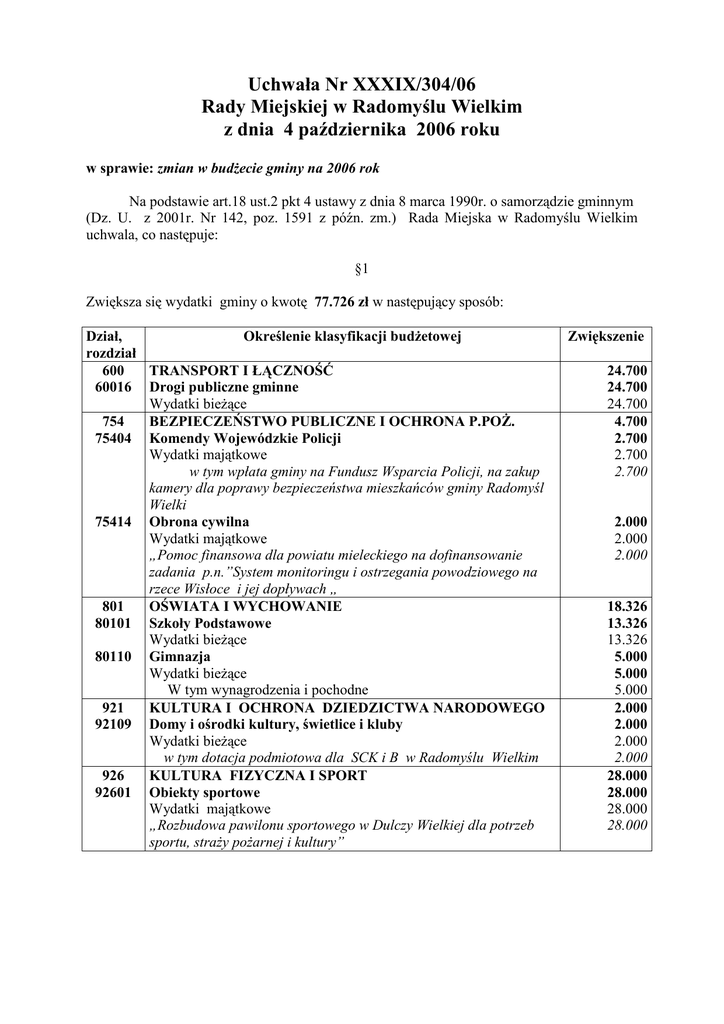 Uchwała Nr XXXIX/304/06 Rady Miejskiej w Radomyślu Wielkim z dnia 4 października 2006 roku w sprawie: zmian w budŜecie gminy na 2006 rok Na podstawie art.18 ust.2 pkt 4 ustawy z dnia 8 marca 1990r. o samorządzie gminnym (Dz. U. z 2001r. Nr 142, poz. 1591 z późn. zm.) Rada Miejska w Radomyślu Wielkim uchwala, co następuje: §1 Zwiększa się wydatki gminy o kwotę 77.726 zł w następujący sposób: Dział, Określenie klasyfikacji budŜetowej rozdział 600 TRANSPORT I ŁĄCZNOŚĆ 60016 Drogi publiczne gminne Wydatki bieŜące 754 BEZPIECZEŃSTWO PUBLICZNE I OCHRONA P.POś. 75404 Komendy Wojewódzkie Policji Wydatki majątkowe w tym wpłata gminy na Fundusz Wsparcia Policji, na zakup kamery dla poprawy bezpieczeństwa mieszkańców gminy Radomyśl Wielki 75414 Obrona cywilna Wydatki majątkowe „Pomoc finansowa dla powiatu mieleckiego na dofinansowanie zadania p.n.”System monitoringu i ostrzegania powodziowego na rzece Wisłoce i jej dopływach „ 801 OŚWIATA I WYCHOWANIE 80101 Szkoły Podstawowe Wydatki bieŜące 80110 Gimnazja Wydatki bieŜące W tym wynagrodzenia i pochodne 921 KULTURA I OCHRONA DZIEDZICTWA NARODOWEGO 92109 Domy i ośrodki kultury, świetlice i kluby Wydatki bieŜące w tym dotacja podmiotowa dla SCK i B w Radomyślu Wielkim 926 KULTURA FIZYCZNA I SPORT 92601 Obiekty sportowe Wydatki majątkowe „Rozbudowa pawilonu sportowego w Dulczy Wielkiej dla potrzeb sportu, straŜy poŜarnej i kultury” Zwiększenie 24.700 24.700 24.700 4.700 2.700 2.700 2.700 2.000 2.000 2.000 18.326 13.326 13.326 5.000 5.000 5.000 2.000 2.000 2.000 2.000 28.000 28.000 28.000 28.000 §2 Zmniejsza się wydatki gminy o kwotę 77.726 zł w następujący sposób: Dział, Określenie klasyfikacji budŜetowej rozdział 600 TRANSPORT I ŁĄCZNOŚĆ 60016 Drogi publiczne gminne Wydatki bieŜące 801 OŚWIATA I WYCHOWANIE 80110 Gimnazja Wydatki bieŜące w tym dotacja dla Niepublicznej Szkoły w Dulczy Małej 80113 DowoŜenie uczniów do szkół Wydatki bieŜące 926 KULTURA FIZYCZNA I SPORT 92601 Obiekty sportowe Wydatki bieŜące Wydatki majątkowe „Opracowanie dokumentacji rozbudowy pawilonu oraz obiektów sportowych i rekreacyjnych w Radomyślu Wielkim” Zmniejszenie §3 Uchwała wchodzi w Ŝycie z dniem podjęcia. Przewodniczący Rady Miejskiej Jan Miękoś 2.000 2.000 2.000 51.026 16.021 16.021 16.021 35.005 35.005 24.700 24.700 20.200 4.500 4.500 Uzasadnienie do uchwały Nr XXXIX/304 /06 Rady Miejskiej w Radomyślu Wielkim z dnia 4 października 2006 roku w sprawie: zmian w budŜecie gminy na 2006 rok WYDATKI zwiększenia - 77.726 zł Dział, Określenie klasyfikacji budŜetowej rozdział 600 TRANSPORT I ŁĄCZNOŚĆ *bieŜące remonty dróg gminnych *ułoŜenie płyt drogowych w Radomyślu Wielkim ( wg uchwały Rady Osiedla) 754 BEZPIECZEŃSTWO PUBLICZNE I OCHRONA P.POś. * wpłata gminy na Fundusz Wsparcia Policji, na zakup kamery dla poprawy bezpieczeństwa mieszkańców gminy Radomyśl Wielki Zwiększenie *„Pomoc finansowa dla powiatu mieleckiego na dofinansowanie zadania p.n.”System monitoringu i ostrzegania powodziowego na rzece Wisłoce i jej dopływach „ OŚWIATA I WYCHOWANIE *remont Szkoły Podstawowej w Janowcu (Cd.) *wyposaŜenie instalacji słaboprądowej – Szkoła Podstawowa w Radomyślu Wielkim *Gimnazjum Publiczne w Radomyślu Wielkim ( wynagrodzenia i pochodne – uruchomienie klasy integracyjnej ) 2.000 801 921 926 KULTURA I OCHRONA DZIEDZICTWA NARODOWEGO *dotacja dla SCK i B (stroje dla chóru „Echo” – uchwała Rady Osiedla) KULTURA FIZYCZNA I SPORT *„Rozbudowa pawilonu sportowego w Dulczy Wielkiej dla potrzeb sportu, straŜy poŜarnej i kultury” 24.700 20.200 4.500 4.700 2.700 18.326 3.500 9.826 5.000 2.000 2.000 28.000 28.000 WYDATKI zmniejszenia - 77.726 zł Dział, Określenie klasyfikacji budŜetowej rozdział 600 TRANSPORT I ŁĄCZNOŚĆ *konserwacja rowów (1.500 i rezerwa 500 - Rada Osiedla RW) 801 OŚWIATA I WYCHOWANIE * dotacja dla Niepublicznej Szkoły w Dulczy Małej *dowoŜenie uczniów do szkół 926 KULTURA FIZYCZNA I SPORT *remont stadionu w Radomyślu Wielkim *„Opracowanie dokumentacji rozbudowy pawilonu oraz obiektów sportowych i rekreacyjnych w Radomyślu Wielkim” Zmniejszenie 2.000 2.000 51.026 16.021 35.005 24.700 20.200 4.500