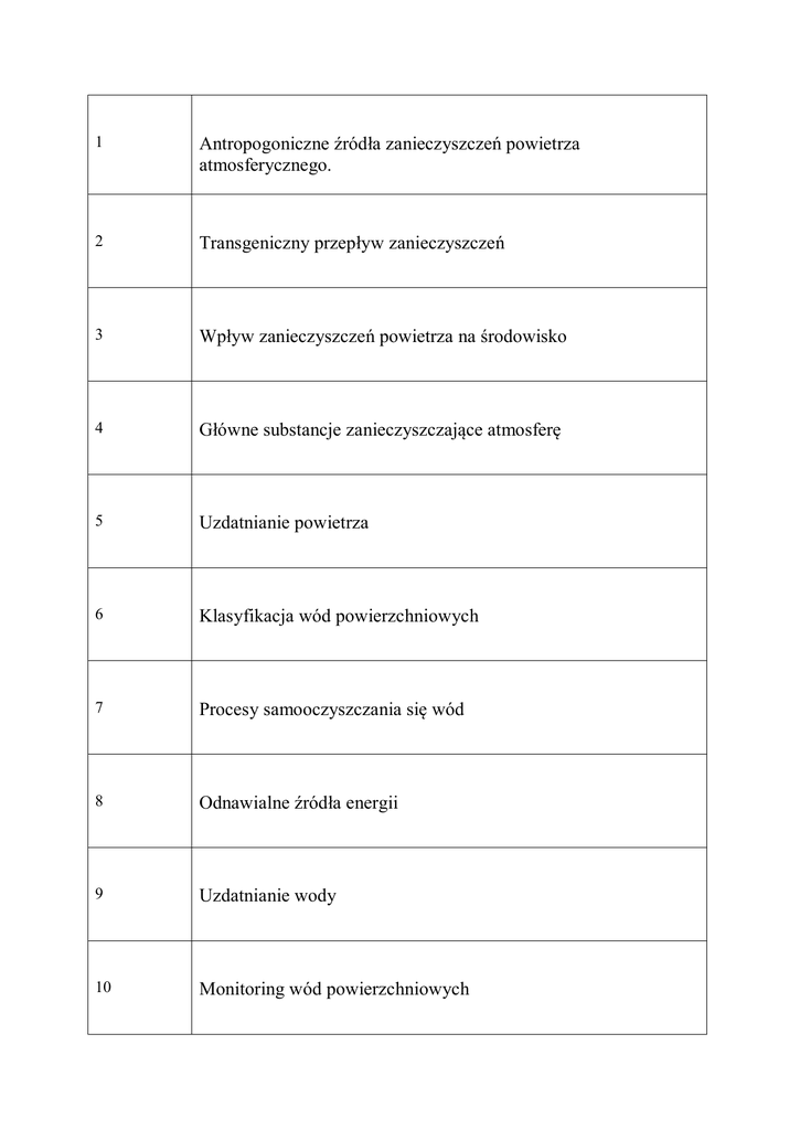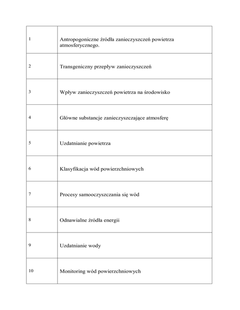 1 Antropogoniczne źródła zanieczyszczeń powietrza atmosferycznego. 2 Transgeniczny przepływ zanieczyszczeń 3 Wpływ zanieczyszczeń powietrza na środowisko 4 Główne substancje zanieczyszczające atmosferę 5 Uzdatnianie powietrza 6 Klasyfikacja wód powierzchniowych 7 Procesy samooczyszczania się wód 8 Odnawialne źródła energii 9 Uzdatnianie wody 10 Monitoring wód powierzchniowych 11 Definicja i podział ścieków 12 Podstawowe systemy oczyszczania ścieków 13 Degradacja i ochrona gleb 14 Wskaźniki podstawowe i eutroficzne oraz procent redukcji na poszczególnych etapach oczyszczania ścieków 15 Uwarunkowania prawne odprowadzania ścieków do wód i do gleby 16 Mechaniczne oczyszczanie ścieków 17 Chemiczne oczyszczanie ścieków 18 Rolnicze wykorzystanie ścieków 19 Podstawowe kierunki przerobu i unieszkodliwiania osadów ściekowych 20 Higienizacja osadów ściekowych 21 Termiczne metody utylizacji osadów ściekowych 22 Główne tezy strategii gospodarki odpadami 23 Kategorie odpadów 24 Regulacje prawne gospodarki odpadami w Polsce 25 Zasady składowania odpadów komunalnych 26 Klasyfikacja odpadów niebezpiecznych 27 Właściwości odpadów niebezpiecznych 28 Fazy produkcji biogazu 29 Rekultywacja i poeksploatacyjne zagospodarowanie terenu wysypiska odpadów 30 Termiczna utylizacja odpadów – piroliza 31 Technologie kompleksowego przerobu odpadów 32 Kompostowanie odpadów komunalnych 33 Ekologiczne i prawne regulacje przyrodniczego użytkowania osadów ściekowych 34 Postępowanie z odpadami pochodzenia zwierzęcego 35 Unieszkodliwianie odpadów niebezpiecznych 36 Monitoring gospodarki odpadami 37 Ocena oddziaływania obiektów komunalnych na środowisko 38 Oddziaływanie ferm tuczu zwierząt na środowisko 39 Metody dezodoryzacji powietrza 40 Główne źródła zanieczyszczeń wód powierzchniowych 41 Układ technologiczny biologicznej oczyszczalni ścieków 42 Wpływ metali ciężkich na ekosystemy 43 Zjawisko powstawania kwaśnych opadów 44 Rodzaje zanieczyszczeń w osadach ściekowych 45 Rodzaje ścieków i charakterystyka 46 Podstawowe operacje i procesy jednostkowe w technologii oczyszczania ścieków 47 Rekultywacja gleb zdegradowanych chemicznie 48 Metody zagospodarowania ścieków odzwierzęcych 49 Przyrodnicze skutki degradacji wód 50 Podstawowe elementy maszyn i urządzeń stosowanych w technologiach ochrony środowiska 51 Wpływ hałasu i wibracji na środowisko 52 Źródła powstawania odorów w środowisku 53 Rekultywacja terenów zdegradowanych 54 Parazytologiczne zanieczyszczenie gleby, ścieków i osadów ściekowych 55 Wymagania sanitarne wody do picia 56 Wymień czynniki powodujące eutrofizację wód. 57 Przedstaw proces samooczyszczania się wód. 58 Wyjaśnij pojęcie bioindykacji. 59 Jakie są formy ochrony przyrody. 60 Na czym polega monitoring środowiska? 61 Omów znaczenie małej retencji wodnej w krajobrazie. 62 Scharakteryzuj łańcuchy troficzne. 63 W jaki sposób można ograniczyć eutrofizację zbiorników wodnych? 64 Koncepcje i wskaźniki rozwoju zrównoważonego 65 Zasady gospodarowania zasobami odnawialnymi i nieodnawialnymi 66 Cele i procedury sporządzania raportów oddziaływania na środowisko 67 Formy ochrony przyrody w Polsce 68 Prawne aspekty ochrony środowiska w Polsce 69 Parki Narodowe w Polsce 70 Sposoby zagospodarowania odchodów zwierzęcych 71 72 73 74 75 76 77 78 79 80 81 82 83 84 85 86 87 88 89 90