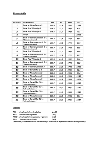 Plan osiedla Nazwa domu 1 2 3 4 Dom w Nenufarach 3 217,4 32,8 250,2 PD 1368 Dom Pod Pistacją G 178,5 21,0 199,5 825 Dom Pod Pistacja G 178,5 21,0 199,5 731 5 Dom w Tamaryszkach 3-L 6 Dom w Tamaryszkach 3-L 7 Dom w Tamaryszkach 3-L 8 9 Nr działki PM PG PMG Droga 3263 159,7 17,8 177,5 894 159,7 17,8 177,5 805 159,7 17,8 177,5 805 Dom Pod Pistacja G 178,5 21,0 199,5 958 Dom w Tamaryszkach 3-L 159,7 17,8 177,5 897 ( Odbicie lustrzane ) ( Odbicie lustrzane ) ( Odbicie lustrzane ) ( Odbicie lustrzane ) 10 Dom Pod Pistacja G 178,5 21,0 199,5 762 11 Dom w Tamaryszkach 3-L 159,7 17,8 177,5 822 12 13 14 15 16 Dom w Tamaryszkach 3 159,7 17,8 177,5 1006 Dom w Świetliku G 2 169,7 39,0 208,7 924 Dom w Nenufarach 3 217,4 32,8 250,2 994 Dom w Nenufarach 3 217,4 32,8 250,2 1188 Dom w Nenufarach 3 217,4 32,8 250,2 1011 17 Dom w Świetliku G2- L 169,7 39,0 208,7 1050 18 Dom w Świetliku G2- L 169,7 39,0 208,7 1590 19 Dom w Świetliku G2- L 169,7 39,0 208,7 1586 20 Dom w Nenufarach 3 217,4 32,8 250,2 801 21 Dom w Świetliku G2- L 169,7 39,0 208,7 1637 ( Odbicie lustrzane ) ( odbicie lustrzane ) ( odbicie lustrzane ) ( odbicie lustrzane ) ( odbicie lustrzane ) Legenda PM – Powierzchnia mieszkalna PG - Powierzchnia garażu PMG – Powierzchnia mieszkalna i garażu PD – Powierzchnia działki ( m2) ( m2) (m2) (m2) ( dokładna powierzchnia może ulec zmianie po ostatecznym wydzieleniu działek przez geodetę )