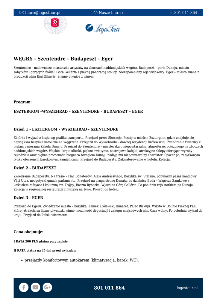 [email protected] Nasze biura 801 011 864 WĘGRY - Szentendre - Budapeszt - Eger Szentendre – malownicze miasteczko artystów na zboczach naddunajskich wzgórz. Budapeszt – perła Dunaju, miasto zabytków i gorących źródeł. Góra Gellérta z piękną panoramą stolicy. Niezapomniany rejs widokowy. Eger – miasto znane z produkcji wina Egri Bikavér. Słynne piwnice z winem. . Program: ESZTERGOM –WYSZEHRAD – SZENTENDRE – BUDAPESZT – EGER Dzień 1 - ESZTERGOM - WYSZEHRAD - SZENTENDRE Zbiórka i wyjazd z kraju wg grafiku transportu. Przejazd przez Słowację. Postój w mieście Esztergom, gdzie znajduje się największa bazylika katolicka na Węgrzech. Przejazd do Wyszehradu – dawnej rezydencji królewskiej. Zwiedzanie twierdzy z piękną panoramą Zakola Dunaju. Przejazd do Szentendre – miasteczka o niepowtarzalnej atmosferze, położonego na zboczach naddunajskich wzgórz. Wąskie i kręte uliczki, piękne świątynie, nastrojowe kafejki, atrakcyjne sklepy oferujące wyroby rękodzieła oraz piękna promenada biegnąca brzegiem Dunaju nadają mu niepowtarzalny charakter. Spacer po, zabytkowym rynku otoczonym barokowymi kamienicami. Przejazd do Budapesztu. Zakwaterowanie w hotelu. Kolacja. Dzień 2 - BUDAPESZT Zwiedzanie Budapesztu. Na trasie – Plac Bohaterów, Aleja Andrássyiego, Bazylika św. Stefana, popularny pasaż handlowy Váci Utca, neogotycki gmach parlamentu. Przejazd na drugą stronę Dunaju, do dzielnicy Buda – Wzgórze Zamkowe z kościołem Mátyása i kolumną św. Trójcy, Baszta Rybacka. Wjazd na Górę Gellérta. Po południu rejs statkiem po Dunaju. Kolacja w regionalnej restauracji z muzyką na żywo. Powrót do hotelu. Dzień 3 - EGER Przejazd do Egeru. Zwiedzanie miasta – bazylika, Zamek Królewski, minaret, Pałac Biskupi. Wizyta w Dolinie Pięknej Pani, której atrakcją są liczne piwniczki winne; możliwość degustacji i zakupu miejscowych win. Czas wolny. Po południu wyjazd do kraju. Przyjazd do Polski wieczorem. Cena obejmuje: I RATA 200 PLN płatna przy zapisie II RATA płatna na 35 dni przed wyjazdem przejazdy komfortowym autokarem (klimatyzacja, barek, WC), 801 011 864 logostour.pl [email protected] Nasze biura 801 011 864 2 noclegi w hotelu 3* w Budapeszcie, pokoje 2- i 3-osob; dopłata do pokoju 1-osob. 150 PLN, 2 śniadania w hotelu, 2 kolacje (1 w hotelu, 1 w regionalnej restauracji z muzyką na żywo) – napoje dodatkowo płatne, opiekę pilota, ubezpieczenie Signal Iduna (KL, NNW, bagaż). Dodatkowe informacje: BILETY WSTĘPU Na bilety wstępu do zwiedzanych obiektów i rejs statkiem należy przeznaczyć ok. 6500 HUF (ok. 90 PLN). DODATKOWE OPŁATY Dopłata do obiadu połączonego z degustacją wina w Dolinie Pięknej Pani 90 PLN. MIEJSCA W AUTOKARZE Kolejność zapisów na wycieczkę decyduje o zajmowaniu miejsc w autokarze. Terminy: 801 011 864 logostour.pl