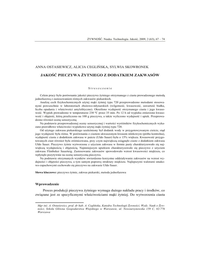 ŻYWNOŚĆ. Nauka. Technologia. Jakość, 2009, 2 (63), 67 – 74 ANNA OSTASIEWICZ, ALICJA CEGLIŃSKA, SYLWIA SKOWRONEK JAKOŚĆ PIECZYWA ŻYTNIEGO Z DODATKIEM ZAKWASÓW Streszczenie Celem pracy było porównanie jakości pieczywa żytniego otrzymanego z ciasta prowadzonego metodą jednofazową z zastosowaniem różnych zakwasów piekarskich. Analizę cech fizykochemicznych użytej mąki żytniej typu 720 przeprowadzono metodami stosowanymi powszechnie w laboratoriach zbożowo-młynarskich (wilgotność, kwasowość, zawartość białka, liczba opadania i właściwości amylolityczne). Określono wydajność otrzymanego ciasta i jego kwasowość. Wypiek prowadzono w temperaturze 230 ºC przez 35 min. Po 12 h od wypieku zmierzono kwasowość i objętość, którą przeliczono na 100 g pieczywa, a także wyliczono wydajność i upiek. Przeprowadzono również ocenę sensoryczną Na podstawie przeprowadzonej oceny sensorycznej i wartości wyróżników fizykochemicznych wykazano prawidłowe właściwości wypiekowe użytej mąki żytniej typu 720. Od użytego zakwasu piekarskiego uzależniony był dodatek wody w przygotowywanym cieście, stąd jego wydajność była różna. W porównaniu z ciastem ukwaszonym kwasem mlekowym (próba kontrolna), wydajność ciasta z dodatkiem zakwasu w paście (Uldo Sauer) była o 15% większa. Kwasowość przygotowanych ciast również była zróżnicowana, przy czym największą osiągnęło ciasto z dodatkiem zakwasu Uldo Sauer. Pieczywo żytnie wytworzone z użyciem zakwasu w formie pasty charakteryzowało się największą wydajnością i objętością. Najmniejszym upiekiem charakteryzowało się pieczywo z użyciem zakwasu Flintbeker Sauerteig. Zastosowanie zakwasów spowodowało wzrost kwasowości miękiszu, co wpłynęło pozytywnie na ocenę sensoryczną pieczywa. Na podstawie otrzymanych wyników stwierdzono korzystne oddziaływanie zakwasów na wzrost wydajności i objętości pieczywa, a tym samym poprawę struktury miękiszu. Najlepszymi walorami smakowo-zapachowymi cechowało się pieczywo na zakwasie Uldo Sauer. Słowa kluczowe: pieczywo żytnie, zakwas piekarski, metoda jednofazowa Wprowadzenie Proces produkcji pieczywa żytniego wymaga dużego nakładu pracy i środków, co związane jest ze specyficznymi właściwościami mąki żytniej. Do wytworzenia ciasta Mgr inż. A. Ostasiewicz, prof. dr hab. A. Ceglińska, Katedra Technologii Żywności, Wydz. Nauk o Żywności, Szkoła Główna Gospodarstwa Wiejskiego w Warszawie, ul. Nowoursynowska 159 C, 02-776 Warszawa 68 Anna Ostasiewicz, Alicja Ceglińska, Sylwia Skowronek żytniego konieczne jest jego ukwaszenie w celu osiągnięcia trwałej struktury pieczywa, wykształcenia wyrazistego smaku i aromatu oraz regulacji aktywności enzymatycznej mąki [21]. Ukwaszenie ciasta można uzyskać podczas fermentacji mlekowoetanolowej, która jest jednak procesem czasochłonnym i stwarza zagrożenie popełnienia błędów technologicznych [8]. Innym sposobem ukwaszania jest stosowanie zakwasów piekarskich, umożliwiających wytworzenie ciasta z pominięciem pośrednich faz fermentacji, a jednocześnie pozwalającym utrzymać powtarzalną jakość produkowanego pieczywa oraz kontrolę przebiegu procesu [19]. Zakwasy piekarskie są tradycyjnie prowadzonymi kwasami poddanymi procesowi suszenia lub z ewentualnym dodatkiem mieszanki kwasów organicznych [12]. Suche zakwasy ze względu na małą zawartość wody wykazują długi okres trwałości, jednak z uwagi na niewysoką kwasowość i zbyt krótki czas na rozwinięcie aktywności kwasotwórczej podczas fermentacji należy stosować je w większych dawkach. Oprócz zakwasów stosowane są środki zakwaszające, które nie wywodzą się z naturalnej fermentacji, a w ich skład wchodzą kwasy organiczne z dodatkiem naturalnych substancji zagęszczających, stabilizujących i powierzchniowo czynnych. W porównaniu z suchymi zakwasami odznaczają się wyższą kwasowością, dzięki czemu mogą być dodawane w mniejszych dawkach. Zakwasy piekarskie i środki zakwaszające występują w formie sypkiej, płynnej lub w postaci pasty [19]. Ciasta produkowane z użyciem zakwasów piekarskich wymagają jednak dodatku drożdży [4]. Wynika to z konieczności szybkiego spulchnienia ciasta poprzez wytworzenie gazów. Niektóre piekarnie same produkują zakwasy (na bazie kwasu mlekowego), inne stosują gotowe zakwasy [6]. Firmy, które produkują zakwasy piekarskie jako „gotowy do użycia produkt”, deklarują łatwy sposób przygotowania ciasta (metodą jednofazową) na bazie tych zakwasów oraz otrzymanie pieczywa o stałej, powtarzalnej jakości [3]. Celem pracy było porównanie jakości pieczywa żytniego otrzymanego z ciasta prowadzonego metodą jednofazową z dodatkiem różnych zakwasów piekarskich. Materiał i metody badań Ciasto na pieczywo żytnie przygotowywano z handlowej mąki typu 720, metodą laboratoryjną, z użyciem: − kwasu mlekowego (próba kontrolna), − suchego zakwasu Biopan-S, wyprodukowanego przez firmę „AKO” w Bydgoszczy, − suchego zakwasu Flintbeker Sauerteig, wyprodukowanego przez firmę „Ratjen Backmittel GmbH” w Bingen (Niemcy), − zakwasu w paście Uldo Sauer, wyprodukowanego przez firmę „Uldo-P” w Krakowie. JAKOŚĆ PIECZYWA ŻYTNIEGO Z DODATKIEM ZAKWASÓW 69 Biopan-S i Flintbeker Sauerteig są to suche zakwasy stosowane do produkcji pieczywa żytniego w ilości 2 % i 5 - 6 % w stosunku do masy mąki żytniej według zaleceń producenta. Uldo Sauer to zakwas w formie pasty, produkowany na bazie naturalnego kwasu, stosowany do produkcji pieczywa żytniego w ilości 7 % w stosunku do masy mąki. Analizę cech fizykochemicznych mąki żytniej typu 720 prowadzono na podstawie oznaczenia: wilgotności metodą suszenia w temperaturze 130 °C przez 1 h, kwasowości miareczkowej poprzez miareczkowanie roztworem 0,1 mol/dm3 wodorotlenku sodu kwasów zawartych w mące wobec 2 % alkoholowego roztworu fenoloftaleiny jako