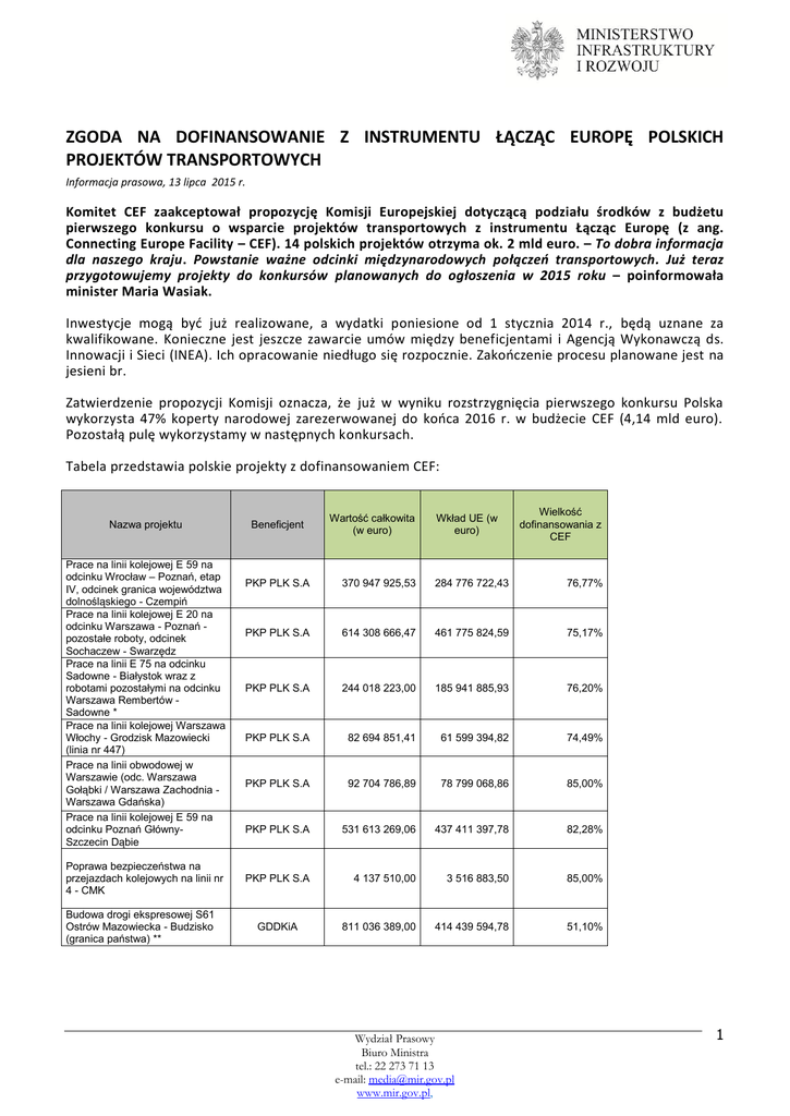 ZGODA NA DOFINANSOWANIE Z INSTRUMENTU ŁĄCZĄC EUROPĘ POLSKICH PROJEKTÓW TRANSPORTOWYCH Informacja prasowa, 13 lipca 2015 r. Komitet CEF zaakceptował propozycję Komisji Europejskiej dotyczącą podziału środków z budżetu pierwszego konkursu o wsparcie projektów transportowych z instrumentu Łącząc Europę (z ang. Connecting Europe Facility – CEF). 14 polskich projektów otrzyma ok. 2 mld euro. – To dobra informacja dla naszego kraju. Powstanie ważne odcinki międzynarodowych połączeń transportowych. Już teraz przygotowujemy projekty do konkursów planowanych do ogłoszenia w 2015 roku – poinformowała minister Maria Wasiak. Inwestycje mogą być już realizowane, a wydatki poniesione od 1 stycznia 2014 r., będą uznane za kwalifikowane. Konieczne jest jeszcze zawarcie umów między beneficjentami i Agencją Wykonawczą ds. Innowacji i Sieci (INEA). Ich opracowanie niedługo się rozpocznie. Zakończenie procesu planowane jest na jesieni br. Zatwierdzenie propozycji Komisji oznacza, że już w wyniku rozstrzygnięcia pierwszego konkursu Polska wykorzysta 47% koperty narodowej zarezerwowanej do końca 2016 r. w budżecie CEF (4,14 mld euro). Pozostałą pulę wykorzystamy w następnych konkursach. Tabela przedstawia polskie projekty z dofinansowaniem CEF: Nazwa projektu Prace na linii kolejowej E 59 na odcinku Wrocław – Poznań, etap IV, odcinek granica województwa dolnośląskiego - Czempiń Prace na linii kolejowej E 20 na odcinku Warszawa - Poznań pozostałe roboty, odcinek Sochaczew - Swarzędz Prace na linii E 75 na odcinku Sadowne - Białystok wraz z robotami pozostałymi na odcinku Warszawa Rembertów Sadowne * Prace na linii kolejowej Warszawa Włochy - Grodzisk Mazowiecki (linia nr 447) Prace na linii obwodowej w Warszawie (odc. Warszawa Gołąbki / Warszawa Zachodnia Warszawa Gdańska) Prace na linii kolejowej E 59 na odcinku Poznań GłównySzczecin Dąbie Poprawa bezpieczeństwa na przejazdach kolejowych na linii nr 4 - CMK Budowa drogi ekspresowej S61 Ostrów Mazowiecka - Budzisko (granica państwa) ** Beneficjent Wartość całkowita (w euro) Wkład UE (w euro) Wielkość dofinansowania z CEF PKP PLK S.A 370 947 925,53 284 776 722,43 76,77% PKP PLK S.A 614 308 666,47 461 775 824,59 75,17% PKP PLK S.A 244 018 223,00 185 941 885,93 76,20% PKP PLK S.A 82 694 851,41 61 599 394,82 74,49% PKP PLK S.A 92 704 786,89 78 799 068,86 85,00% PKP PLK S.A 531 613 269,06 437 411 397,78 82,28% PKP PLK S.A 4 137 510,00 3 516 883,50 85,00% 811 036 389,00 414 439 594,78 51,10% GDDKiA Wydział Prasowy Biuro Ministra tel.: 22 273 71 13 e-mail: [email protected] www.mir.gov.pl, 1 Sweden-Poland Sustainable SeaHinterland Services “Sustainable Swinoujscie-Trelleborg MoS ZMPSiŚ S.A. based on upgrading port (+ Szwecja) infrastructure, developing intermodal transport and integrating hinterland corridors” Badania optymalizujące Przemysłowy funkcjonowanie i rozmieszczenie Instytut stacji paliw alternatywnych sieci Motoryzacji bazowej TEN-T Rozwój infrastruktury LNG w GASPOL SA Polsce – projekt pilotażowy Establishment of Rail Freight Corridor "North Sea - Baltic" and its further development aiming at PKP PLK S.A improving conditions for international rail freight transport (RFC 8) Finansowanie struktur zarządczych korytarzy towarowych - RFC05 (Rail Freight Corridor 5 Baltic Adriatic. PKP PLK S.A Activities and studies related to improvement of corridor capacity, corridor's offer to the clients and performance monitoring) e-Freight Implementation Action Instytut Logistyki i (e-Impact) Magazynowania 29 812 872,00 22 437 167,47 75,26% 1 787 000,00 1 518 950,00 85,00% 1 014 500,00 507 250,00 50,00% 1 327 083,32 663 541,66 50,00% 485 000,00 242 500,00 50,00% 1 180 000,00 590 000,00 50,00% 2 787 068 076,68 1 954 220 181,82 * Z informacji uzyskanych od KE wynika, że z uwagi na ograniczony budżet konkursu oraz późniejsze rozpoczęcie realizacji projektu na obszarze woj. podlaskiego, podjęto decyzję o przesunięciu realizacji części podlaskiej na późniejszy termin i zmniejszeniu poziomu dofinansowania w ramach konkursu 2014. Jednocześnie Komisja zagwarantowała środki na realizację części w woj. podlaskim w ramach następnych konkursów. Rail Baltica jest jednym z priorytetowych projektów do dofinansowania ze środków CEF ** Z informacji uzyskanych od KE wynika, że z uwagi na limity środków (w tym te na inwestycje drogowe), poziom dofinansowania dla projektu również obniżono. Należy zaznaczyć, że przyznane dofinansowanie zapewni realizację inwestycji na odcinku od Szczuczyna do granicy państwa, tj. na odcinku dłuższym niż zakładano w pierwotnych analizach (Suwałki - granica państwa). Wydział Prasowy Biuro Ministra tel.: 22 273 71 13 e-mail: [email protected] www.mir.gov.pl, 2