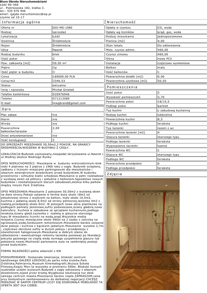 Biuro Obrotu Nieruchomościami Łódź 90-368 ul . Piotrkowska 182, klatka 3. tel.: 535 976 946 email: [email protected] czynne od 10-17 Informacje ogólne Nieruchomość Oferta nr GAJ-MS-1080 Opłaty w czynszu CO, woda Rodzaj sprzedaż Opłaty wg liczników prąd, gaz, woda Lokalizacja Łódź Rodzaj mieszkania jednopoziomowe Dzielnica Śródmieście Piwnica [m2] 4,00 Rejon Śródmieście Stan lokalu Do odświeżenia Ulica Nawrot Mies. czynsz admin. 460,00 Rodzaj budynku blok Czynsz zimowy 460,00 Ilość pokoi 2 Okna nowe PCV Pow. całkowita [m2] 50.50 m² Instalacje częściowo wymienione Piętro 3p Balkon mały Ilość pięter w budynku 3 Ilość balkonów 1 Cena 169000.00 PLN Powierzchnia działki [m2] 0.00 Cena/m2 3346.53 Powierzchnia użytkowa [m2] 50,50 Status aktualna Imię i nazwisko Michał Gniotek Telefon komórkowy 535976946 Telefon E-mail 571213589 [email protected] Opis Pomieszczenia Ilość pokoi 2 Wysokość pomieszczeń 2,70 Powierzchnia pokoi 18/10,5 Podłogi pokoi parkiet Typ kuchni z zabudową kuchenną Plac zabaw nie Rodzaj kuchni oddzielna Alarm nie Powierzchnia kuchni 8,5 Winda nie Podłoga kuchni terakota Powierzchnia balkonów/tarasów 2,00 Typ łazienki razem z wc Powierzchnia łazienki [m2] 4 Drzwi antywłamaniowe nie Glazura łazienki starszego typu Ilość kondygnacji 3 Podłoga łazienki terakota Wyposażenie łazienki wanna Powierzchnia WC 1 LOKALIZACJA:Budynek usytuowany,nieopodal skrzyżowania ul.Nawrot i ul.Wodnej okolica Wodnego Rynku Glazura WC starszego typu Podłoga WC terakota OPIS NIERUCHOMOŚCI: Mieszkanie w budynku wielorodzinnym-blok niski 4 piętrowy na 3 piętrze z 1960 roku z cegły. Budynek ocieplony, zadbany z licznymi miejscami parkingowymi dla mieszkańców i własnym wewnętrznym dziedzińcem przed budynkiem.W budynku przestronne i schludne klatki schodowe.Mieszkanie w pełni rozkładowe z wystawą okien od północy i południa z balkonem.Sąsiedztwo nowych budynków i rewitalizowanych starych zabudowań,okolica kilku parków między innymi Park Źródliska. Powierzchnia przedpokoi 6 Podłoga przedpokoi terakota DO SPRZEDAŻY MIESZKANIE 50,50m2,2 POKOJE, NA GRANICY ŚRÓDMIEŚCIA/WIDZEWA W BUDYNKU Z CEGŁY. OPIS MIESZKANIA:Mieszkanie 2 pokojowe 50,50m2 z wystawą okien na dwie strony.Pokoje ustawne w formie duży około 18m2 od południowej strony z wyjściem na balkon, mały około 10,5m2, kuchnia z jadalnią około 8,5m2 od strony północnej,łazienka 4m2 z toaletą,przedpokój około 6m2. W pokojach nowe okna plastikowe na podłogach parkiety jesionowe,sufity podwieszane,ściany gładzie,nowe kaloryfery. Kuchnia w zabudowie ze sprzętami kuchennymi,podłoga terakota,ściany gładź.Łazienka z toaletą w glazurze starszego typu.W mieszkaniu liczniki na wodę,prąd.Wszystkie media miejskie.Czynsz miesięcznie około 460zł na 2 osoby z zaliczką na ogrzewanie,wodę,funduszem remontowym.Mieszkanie bardzo ustawne duże pokoje i kuchnia z kącikiem jadalnym.Mieszkanie wysokie 2,7m , częściowo obniżone sufity w dużym pokoju i przedpokoju z oświetleniem halogenowym.Mieszkanie w dobrym stanie do odświeżenia i ewentualnego remontu łazienka ponieważ po likwidacji piecyka gazowego na ciepłą wodę wymaga uzupełnienia glazury lub położenia nowej.Możliwość parkowania auta na zamkniętej posesji przed budynkiem. FORMA WŁASNOŚCI:pełna własność z KW PODSUMOWANIE: Doskonała lokalizacja, bliskość centrum handlowego GALERII ŁÓDZKIEJ,do parku kilka kroków,Park Źródliska,Palmiarnia,Muzeum Kinematografii,Wyższa Szkoła Filmowa,Księży Młyn to wszystko w promieniu 500m. Bliskość licznych wydziałów uczelni wyższych.Budynek z cegły odnowiony z własnym dziedzińcem,wjazd przez bramę.Wyjątkowa lokalizacja tuż obok samego centrum miasta.Mieszkanie bardzo ciepłe.ZAPRASZAM,cena przy konkretnym zainteresowaniu do delikatnej negocjacji.CHCESZ MIESZKAĆ W SAMYM CENTRUM LICZY SIĘ DOSKONAŁA MOBILNOŚĆ TA OFERTA JEST DLA CIEBIE. Zdjęcia KONTAKT: Michał tel. 571 213 589 Biuro Obrotu Nieruchomościami Łódź 90-368 ul . Piotrkowska 182, klatka 3. tel.: 535 976 946 email: [email protected] czynne od 10-17