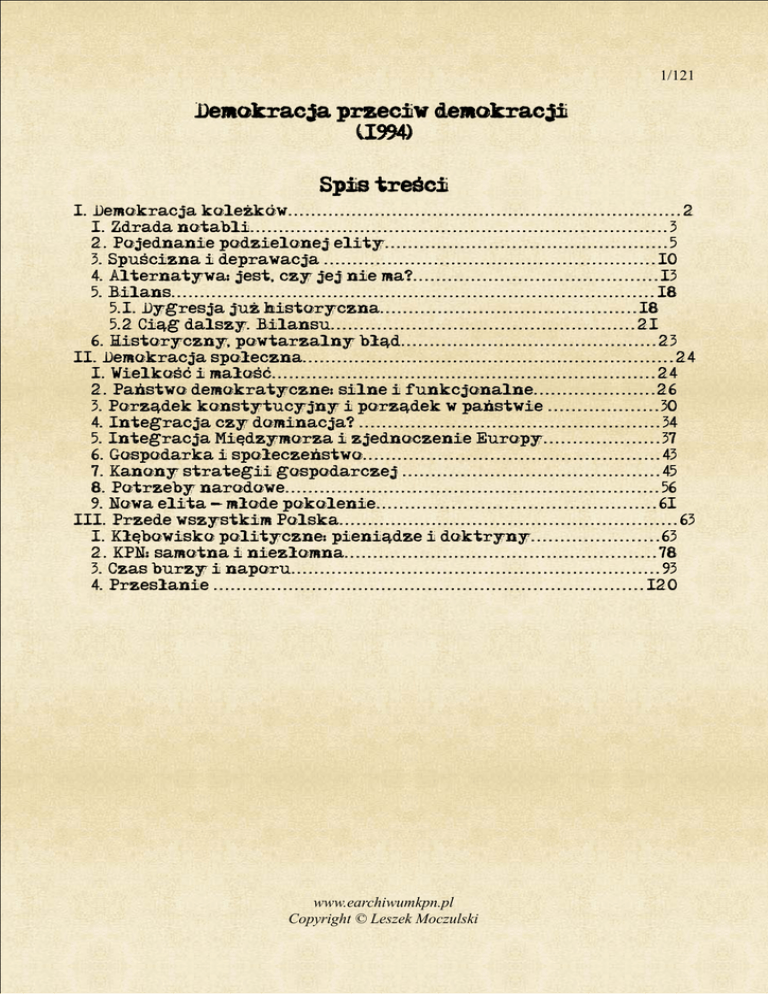 1/121 Demokracja przeciw demokracji (1994) Spis treści I. Demokracja koleżków....................................................................2 1. Zdrada notabli........................................................................3 2. Pojednanie podzielonej elity.................................................5 3. Spuścizna i deprawacja .........................................................10 4. Alternatywa: jest, czy jej nie ma?..........................................13 5. Bilans................................................................................... 18 5.1. Dygresja już historyczna............................................18 5.2 Ciąg dalszy. Bilansu....................................................21 6. Historyczny, powtarzalny błąd............................................23 II. Demokracja społeczna................................................................24 1. Wielkość i małość..................................................................24 2. Państwo demokratyczne: silne i funkcjonalne.....................26 3. Porządek konstytucyjny i porządek w państwie ...................30 4. Integracja czy dominacja? ....................................................34 5. Integracja Międzymorza i zjednoczenie Europy....................37 6. Gospodarka i społeczeństwo...................................................43 7. Kanony strategii gospodarczej ............................................45 8. Potrzeby narodowe................................................................56 9. Nowa elita - młode pokolenie................................................61 III. Przede wszystkim Polska..........................................................63 1. Kłębowisko polityczne: pieniądze i doktryny......................63 2. KPN: samotna i niezłomna......................................................78 3. Czas burzy i naporu...............................................................93 4. Przesłanie ..........................................................................120 www.earchiwumkpn.pl Copyright © Leszek Moczulski 2/121 Największą ich ambicją zbytek, jedyną namiętnością złoto... Mniejsza o to, jakiego pana słuchają, jakiego państwa prawa przestrzegają, byleby tylko znaleźli pieniądze, które można ukraść, i kobiety, które można uwodzić, wszędzie są w ojczyźnie. Nadajcie odmienny kierunek namiętnościom Polaków, a nadacie duszom ich narodowe oblicze. Przepoić cały naród duszą konfederatów i tak mocno ugruntować rzeczpospolitą w sercach Polaków, by się utrzymała pomimo wszelkich wysiłków jej ciemięzców. Jan Jakub Rousseau (1770) I. Demokracja koleżków Macie, coście chcieli. Tak, z goryczą, można powiedzieć. Tak, z satysfakcją, mówią niektórzy. Chcieliście demokracji - no to ją macie. Razem z panoszeniem się i arogancją tych, którzy rządzą. Razem z bezhołowiem i nieodpowiedzialnością władzy. Razem z bezkarnością skorumpowanych polityków, urzędników i aferzystów. Razem z mafiami, przestępczością zorganizowaną i bałaganiarską. Razem z bezsiłą państwa. Razem z wolnością przekraczającą wszystkie granice anarchii. Hulaj dusza bez kontusza wszystko wolno, piekła nie ma. Chcieliście gospodarki rynkowej - to ją macie. Więcej towarów niż pieniędzy. Więcej pieniędzy niż pracy. Więcej podatków. Więcej podwyżek cen. Więcej obniżek realnych zarobków. Więcej bezrobocia. Więcej nędzy. Każdy może mieć wszystko, jeśli jest tylko dostatecznie bogaty. Przez dziesięć lat miliony Polaków z godną podziwu determinacją czynnie obalały ustrój totalitarny. Komuna była zaprzeczeniem demokracji i racjonalnej gospodarki. Zniewalała i pauperyzowała człowieka. Dalej tak być nie mogło. Monopartyjna dyktatura płatnych zdrajców wreszcie upadła. Za nią poszły inne, sam niepokonany Kraj Rad wylądował w śmietniku historii. Dokładnie w cztery lata po upadku komunistycznej władzy rządy nad Polską przejęła koalicja stronnictw wywodzących się bezpośrednio z PRL. Z okazji pięćdziesięciolecia zniewolenia sowieckiego działacze SLD, najliczniejszej partii sejmowej, ogłosili w Lublinie, że czas totalitaryzmu PRL był najwspanialszym w dziejach Polski okresem rozwoju gospodarki i kultury, demokracji i dobrobytu. Jedni się śmieli, inni kiwali głowami, większość przyjęła z całkowitą obojętnością. Parę dni później na obchodach rocznicy Powstania Warszawskiego - półwiecza zamordowania Polski przez Niemcy i Rosję - honorowymi gośćmi byli Prezydent Niemiec i wysłannik Prezydenta Rosji. W różnych miastach nowowybrane rady powołują zarządy złożone z przedstawicieli SLD, Unii Wolności, nieraz także - jak w Łodzi - ZChN oraz list samorządowych. Mamy już ekspertów, bezbłędnie określających, którzy samorządowcy wywodzą się z PZPR, którzy z KLD, a którzy z Porozumienia "Centrum". Wybitny polityk prorządowej opozycji (czy też opozycyjnej opcji rządu) wyjaśnił, że w Polsce dokonuje się pozytywna, demokratyczna synteza polityczna, wsparta na bazie prywatyzacji i gospodarki rynkowej - oraz dał wyraz żalowi, że ludzie tego nie doceniają. Społeczeństwo bowiem, jak zwykle, przeszkadza. Po co jedliśmy tę żabę? www.earchiwumkpn.pl Copyright © Leszek Moczulski 3/121 1. Zdrada notabli Wiosną 1989 r. przy okrągłym stole w obecnym Pałacu Prezydenckim oraz w Magdalence ścierały się dwie wizje reformy PRL. Obie były nieprzemyślane do końca, przygotowane ledwo w zarysie, niekompletne - ale w generalnym charakterze wyraźne. Komitet Obywatelski, złożony głównie z doradców "Solidarności", domagał się szerokich rewindykacji społecznych, uspołecznienia zarządu gospodarką, uznania kluczowej roli związków zawodowych, poprawy jakości życia ludzi pracy. Był to program wyraźnie prospołeczny. Komunistyczny rząd bronił polityki realizowanej już od pewnego czasu, zgodnej z 