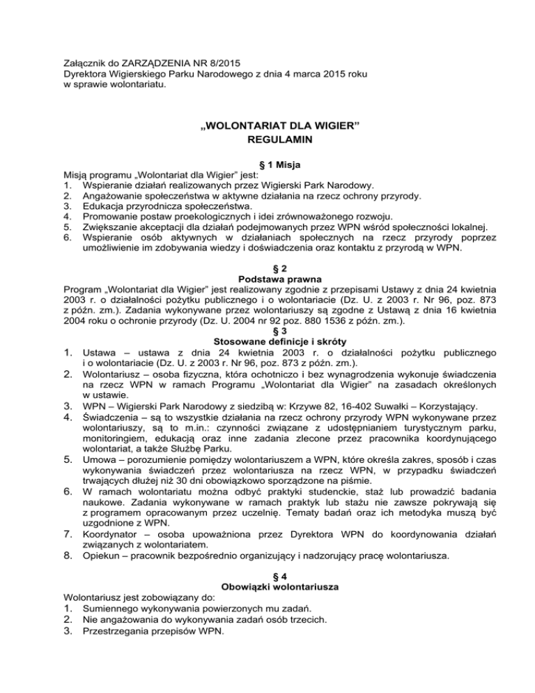 Załącznik do ZARZĄDZENIA NR 8/2015 Dyrektora Wigierskiego Parku Narodowego z dnia 4 marca 2015 roku w sprawie wolontariatu. „WOLONTARIAT DLA WIGIER” REGULAMIN § 1 Misja Misją programu „Wolontariat dla Wigier” jest: 1. Wspieranie działań realizowanych przez Wigierski Park Narodowy. 2. Angażowanie społeczeństwa w aktywne działania na rzecz ochrony przyrody. 3. Edukacja przyrodnicza społeczeństwa. 4. Promowanie postaw proekologicznych i idei zrównoważonego rozwoju. 5. Zwiększanie akceptacji dla działań podejmowanych przez WPN wśród społeczności lokalnej. 6. Wspieranie osób aktywnych w działaniach społecznych na rzecz przyrody poprzez umożliwienie im zdobywania wiedzy i doświadczenia oraz kontaktu z przyrodą w WPN. §2 Podstawa prawna Program „Wolontariat dla Wigier” jest realizowany zgodnie z przepisami Ustawy z dnia 24 kwietnia 2003 r. o działalności pożytku publicznego i o wolontariacie (Dz. U. z 2003 r. Nr 96, poz. 873 z późn. zm.). Zadania wykonywane przez wolontariuszy są zgodne z Ustawą z dnia 16 kwietnia 2004 roku o ochronie przyrody (Dz. U. 2004 nr 92 poz. 880 1536 z późn. zm.). §3 Stosowane definicje i skróty 1. Ustawa – ustawa z dnia 24 kwietnia 2003 r. o działalności pożytku publicznego i o wolontariacie (Dz. U. z 2003 r. Nr 96, poz. 873 z późn. zm.). 2. Wolontariusz – osoba fizyczna, która ochotniczo i bez wynagrodzenia wykonuje świadczenia na rzecz WPN w ramach Programu „Wolontariat dla Wigier” na zasadach określonych w ustawie. 3. WPN – Wigierski Park Narodowy z siedzibą w: Krzywe 82, 16-402 Suwałki – Korzystający. 4. Świadczenia – są to wszystkie działania na rzecz ochrony przyrody WPN wykonywane przez wolontariuszy, są to m.in.: czynności związane z udostępnianiem turystycznym parku, monitoringiem, edukacją oraz inne zadania zlecone przez pracownika koordynującego wolontariat, a także Służbę Parku. 5. Umowa – porozumienie pomiędzy wolontariuszem a WPN, które określa zakres, sposób i czas wykonywania świadczeń przez wolontariusza na rzecz WPN, w przypadku świadczeń trwających dłużej niż 30 dni obowiązkowo sporządzone na piśmie. 6. W ramach wolontariatu można odbyć praktyki studenckie, staż lub prowadzić badania naukowe. Zadania wykonywane w ramach praktyk lub stażu nie zawsze pokrywają się z programem opracowanym przez uczelnię. Tematy badań oraz ich metodyka muszą być uzgodnione z WPN. 7. Koordynator – osoba upoważniona przez Dyrektora WPN do koordynowania działań związanych z wolontariatem. 8. Opiekun – pracownik bezpośrednio organizujący i nadzorujący pracę wolontariusza. §4 Obowiązki wolontariusza Wolontariusz jest zobowiązany do: 1. Sumiennego wykonywania powierzonych mu zadań. 2. Nie angażowania do wykonywania zadań osób trzecich. 3. Przestrzegania przepisów WPN. 4. Zachowania zasad kultury osobistej, oraz poprawnego zachowania wobec pracowników WPN, 5. 6. 7. innych wolontariuszy i osób odwiedzających WPN. Używania zgodnie z przeznaczeniem oraz poszanowaniem przydzielonego mu sprzętu oraz pojazdów. Komunikacji z pracownikiem nadzorującym pracę i koordynatorem oraz informowania ich o wszelkich nieprawidłowościach. Uzupełnienia Karty Czasu Pracy i dostarczenia jej do opiekuna lub koordynatora w dniu zakończenia wolontariatu (zał. 5). §5 Obowiązki WPN wobec wolontariuszy WPN ma obowiązek udostępnić wolontariuszom: 1. Informację o ryzyku dla zdrowia i bezpieczeństwa związanym z wykonywanymi świadczeniami oraz o zasadach ochrony przed zagrożeniami. 2. Bezpieczne i higieniczne warunki wykonywania przez nich świadczeń, w tym – w zależności od rodzaju świadczeń i zagrożeń związanych z ich wykonywaniem – odpowiednie środki ochrony indywidualnej. 3. Informację o przysługujących im prawach i ciążących na nich obowiązkach. 4. Dodatkowe specjalistyczne przeszkolenie, jeśli jest niezbędne do wykonywania zadania. 5. Ubezpieczenie NNW na kwotę 4000 zł w przypadku umów podpisywanych na okres nie dłuższy niż 30 dni. 6. Odzież służbową zapewniającą identyfikację wizualną i w miarę potrzeb odzież ochronną. 7. Sprzęt niezbędny do poprawnego wykonywania świadczeń. 8. Kartę wstępu do parku na czas trwania wolontariatu, dzięki której może zwiedzać wszystkie obiekty WPN. 9. Bezpłatny nocleg w standardzie schroniskowym – łóżko bez pościeli, WC, prysznic (ciepła woda), kuchenka, lodówka, naczynia (liczba miejsc noclegowych jest ograniczona, pierwszeństwo mają wolontariusze długoterminowi). 10. Pomoc z zorganizowaniu dojazdu z miejsca zakwaterowania (dotyczy kwater WPN) do miejsca wykonywania świadczeń. 11. Zwrot kosztów delegacji na zasadach dotyczących pracowników w przypadku świadczeń wykonywanych poza terenem WPN. 12. Pisemną opinię o wykonanych świadczeniach wydawaną na prośbę wolontariusza. §6 Szczegółowe zasady przystąpienia do Programu „Wolontariat dla Wigier” Wolontariuszem WPN może zostać osoba, która spełnia następujące warunki: 1. Wysłała za pośrednictwem Internetu lub w inny sposób dostarczyła do siedziby WPN zgłoszenie na zadanie (zał. 1) bądź ankietę zgłoszeniową (zał. 2). 2. Pozytywnie zaliczyła kwalifikacyjny test lub rozmowę w przypadku zadań edukacyjnych i innych określonych przez koordynatora. 3. Odbyła przeszkolenie w zakresie ryzyka dla zdrowia i bezpieczeństwa oraz zasad ochrony przed zagrożeniami związanymi z wykonywaniem świadczeń – potwierdzone w formie pisemnej przez wolontariusza (zał. 3). 4. Złożyła pisemne oświadczenie o braku przeciwwskazań zdrowotnych do wykonywania świadczeń (zał. 3). 5. Podpisała umowę tj. porozumienie na wykonywanie świadczeń pomiędzy wolontariuszem a WPN (zał. 4). §7 Zasady korzystania z kwater 1. Bezpłatny nocleg przysługuje wolontariuszom podczas wykonywania świadczeń wolontariackich, włączając w to przysługujące dni wolne, dni szkoleń oraz w innych