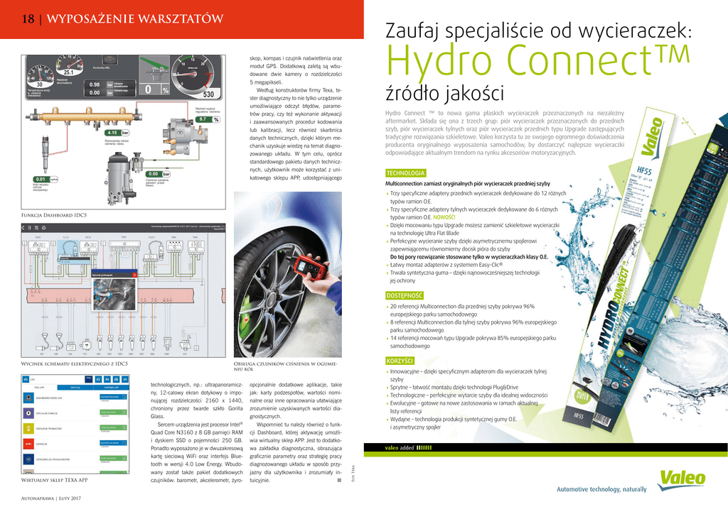 18 | WYPOSAŻENIE WARSZTATÓW Zaufaj specjaliście od wycieraczek: Hydro Connect™ skop, kompas i czujnik naświetlenia oraz moduł GPS. Dodatkową zaletą są wbudowane dwie kamery o rozdzielczości 5 megapikseli. Według konstruktorów firmy Texa, tester diagnostyczny to nie tylko urządzenie umożliwiające odczyt błędów, parametrów pracy, czy też wykonanie aktywacji i zaawansowanych procedur kodowania lub kalibracji, lecz również skarbnica danych technicznych, dzięki którym mechanik uzyskuje wiedzę na temat diagnozowanego układu. W tym celu, oprócz standardowego pakietu danych technicznych, użytkownik może korzystać z unikatowego sklepu APP, udostępniającego źródło jakości Hydro Connect ™ to nowa gama płaskich wycieraczek przeznaczonych na niezależny aftermarket. Składa się ona z trzech grup: piór wycieraczek przeznaczonych do przednich szyb, piór wycieraczek tylnych oraz piór wycieraczek przednich typu Upgrade zastępujących tradycyjne rozwiązania szkieletowe. Valeo korzysta tu ze swojego ogromnego doświadczenia producenta oryginalnego wyposażenia samochodów, by dostarczyć najlepsze wycieraczki odpowiadające aktualnym trendom na rynku akcesoriów motoryzacyjnych. TECHNOLOGIA Multiconnection zamiast oryginalnych piór wycieraczek przedniej szyby T rzy specyficzne adaptery przednich wycieraczek dedykowane do 12 różnych typów ramion O.E. T rzy specyficzne adaptery tylnych wycieraczek dedykowane do 6 różnych Funkcja Dashboard IDC5 typów ramion O.E. NOWOŚĆ! D zięki mocowaniu typu Upgrade możesz zamienić szkieletowe wycieraczki na technologię Ultra Flat Blade P erfekcyjne wycieranie szyby dzięki asymetrycznemu spojlerowi zapewniającemu równomierny docisk pióra do szyby Do tej pory rozwiązanie stosowane tylko w wycieraczkach klasy O.E. Ł atwy montaż adapterów z systemem Easy-Clic® T rwała syntetyczna guma – dzięki najnowocześniejszej technologii jej ochrony DOSTĘPNOŚĆ 2 0 referencji Multiconnection dla przedniej szyby pokrywa 96% europejskiego parku samochodowego 8 referencji Multiconnection dla tylnej szyby pokrywa 96% europejskiego parku samochodowego 1 4 referencji mocowań typu Upgrade pokrywa 85% europejskiego parku samochodowego Wirtualny sklep TEXA APP Autonaprawa | Luty 2017 KORZYŚCI Obsługa czujników ciśnienia w ogumieniu kół technologicznych, np.: ultrapanoramiczny, 12-calowy ekran dotykowy o imponującej rozdzielczości 2160 x 1440, chroniony przez twarde szkło Gorilla Glass. Sercem urządzenia jest procesor Intel® Quad Core N3160 z 8 GB pamięci RAM i dyskiem SSD o pojemności 250 GB. Ponadto wyposażono je w dwuzakresową kartę sieciową WiFi oraz interfejs Blue tooth w wersji 4.0 Low Energy. Wbudowany został także pakiet dodatkowych czujników: barometr, akcelerometr, żyro- opcjonalnie dodatkowe aplikacje, takie jak: karty podzespołów, wartości nominalne oraz inne opracowania ułatwiające zrozumienie uzyskiwanych wartości diagnostycznych. Wspomnieć tu należy również o funkcji Dashboard, której aktywację umożliwia wirtualny sklep APP. Jest to dodatkowa zakładka diagnostyczna, obrazująca graficznie parametry oraz strategię pracy diagnozowanego układu w sposób przyjazny dla użytkownika i zrozumiały intuicyjnie. n Innowacyjne – dzięki specyficznym adapterom dla wycieraczek tylnej szyby S prytne – łatwość montażu dzięki technologii Plug&Drive T echnologiczne – perfekcyjne wytarcie szyby dla idealnej widoczności E wolucyjne – gotowe na nowe zastosowania w ramach aktualnej listy referencji W ydajne – technologia produkcji syntetycznej gumy O.E. i asymetryczny spojler Fot. Texa Wycinek schematu elektrycznego z IDC5