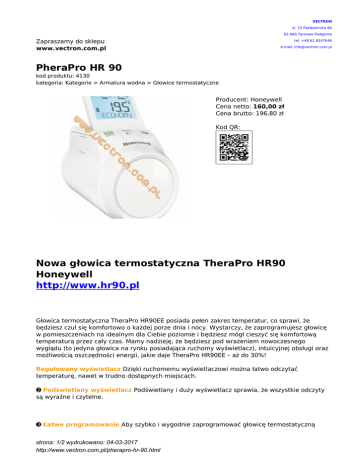VECTRON ul. 23 Października 66 62-080 Tarnowo Podgórne Zapraszamy do sklepu www.vectron.com.pl tel. +48 61 8147646 e-mail: [email protected] PheraPro HR 90 kod produktu: 4130 kategoria: Kategorie > Armatura wodna > Głowice termostatyczne Producent: Honeywell Cena netto: 160,00 zł Cena brutto: 196,80 zł Kod QR: Nowa głowica termostatyczna TheraPro HR90 Honeywell http://www.hr90.pl Głowica termostatyczna TheraPro HR90EE posiada pełen zakres temperatur, co sprawi, że będziesz czuł się komfortowo o każdej porze dnia i nocy. Wystarczy, że zaprogramujesz głowicę w pomieszczeniach na idealnym dla Ciebie poziomie i będziesz mógł cieszyć się komfortową temperaturą przez cały czas. Mamy nadzieję, że będziesz pod wrażeniem nowoczesnego wyglądu (to jedyna głowica na rynku posiadająca ruchomy wyświetlacz), intuicyjnej obsługi oraz możliwością oszczędności energii, jakie daje TheraPro HR90EE – aż do 30%! Regulowany wyświetlacz Dzięki ruchomemu wyświetlaczowi można łatwo odczytać temperaturę, nawet w trudno dostępnych miejscach. ➋ Podświetlany wyświetlacz Podświetlany i duży wyświetlacz sprawia, że wszystkie odczyty są wyraźne i czytelne. ➌ Łatwe programowanie Aby szybko i wygodnie zaprogramować głowicę termostatyczną strona: 1/2 wydrukowano: 04-03-2017 http://www.vectron.com.pl/pherapro-hr-90.html TheraPro HR90EE wystarczy zdjąć ją z zaworu grzejnikowego. ➍ Funkcja ochrony przed wychłodzeniem Gdy temperatura spadnie poniżej 5°C głowica termostatyczna TheraPro HR90EE włącza się samoistnie i pracuje dopóki temperatura nie osiągnie ponownie min. 6°C - zapobiega to wychłodzeniu mieszkania. ➎ Blokada głowicy Aby zabezpieczyć głowicę przed manipulacją osób niepożądanych (np. przed dziećmi), możesz ją zablokować w prosty sposób. ➏ Tryb pracy ekonomicznej EKO W trybie EKO temperatura wszystkich nastaw obniża się o 3°C. Dzięki nowej głowicy elektronicznej TheraPro HR90 możesz w pełni kontrolować domową atmosferę. Nowoczesny design sprawi, że Twój grzejnik nabierze zupełnie nowego wyglądu, a intuicyjna obsługa i zaprogramowane tryby pracy pozwolą na dopasowanie temperatury do Twoich aktualnych potrzeb. Wymienne adaptery pozwalają na szybki montaż głowicy do każdego rodzaju grzejnika, ruchomy wyświetlacz na łatwą obsługę urządzenia nawet w trudno dostępnych miejscach, a funkcja pogramowania „w fotelu” pozwoli ustawić głowicę z dowolnego miejsca. Zasilanie: Baterie lub akumulatorki Typ Baterii: LR6, AA, AM3 2x Mignon 1,5V Alternatywnie: 2x Lithium 1,5V 2x NiMH 1,2V akumulatorki Wyświetlacz Wyświetlacz podświetlany: Tekst w standardzie 9 literowym Wymiary 30x26mm (szer./wys.) strona: 2/2 wydrukowano: 04-03-2017 http://www.vectron.com.pl/pherapro-hr-90.html