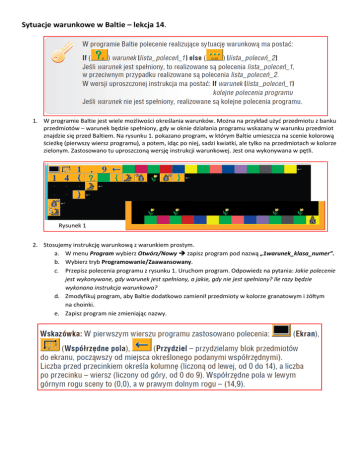 Sytuacje warunkowe w Baltie – lekcja 14. 1. W programie Baltie jest wiele możliwości określania warunków. Można na przykład użyć przedmiotu z banku przedmiotów – warunek będzie spełniony, gdy w oknie działania programu wskazany w warunku przedmiot znajdzie się przed Baltiem. Na rysunku 1. pokazano program, w którym Baltie umieszcza na scenie kolorową ścieżkę (pierwszy wiersz programu), a potem, idąc po niej, sadzi kwiatki, ale tylko na przedmiotach w kolorze zielonym. Zastosowano tu uproszczoną wersję instrukcji warunkowej. Jest ona wykonywana w pętli. Rysunek 1 2. Stosujemy instrukcję warunkową z warunkiem prostym. a. W menu Program wybierz Otwórz/Nowy zapisz program pod nazwą „1warunek_klasa_numer”. b. Wybierz tryb Programowanie/Zaawansowany. c. Przepisz polecenia programu z rysunku 1. Uruchom program. Odpowiedz na pytania: Jakie polecenie jest wykonywane, gdy warunek jest spełniony, a jakie, gdy nie jest spełniony? Ile razy będzie wykonana instrukcja warunkowa? d. Zmodyfikuj program, aby Baltie dodatkowo zamienił przedmioty w kolorze granatowym i żółtym na choinki. e. Zapisz program nie zmieniając nazwy. 3. Warunek może być również złożony. Pomiędzy przedmiotami określającymi warunek umieszczamy wtedy spójnik logiczny and ( ) lub or ( ). Na rysunku 2 widać przykład instrukcji warunkowej z warunkiem złożonym. Jeżeli przed Baltiem znajduje się lub wykona on krok do przodu. W innym przypadku wyczaruje i pójdzie krok do przodu. Rysunek 2 4. Stosujemy instrukcję warunkową z warunkiem złożonym a. Pobierz plik 2warunek (zmień podczas zapisu nazwę na „2warunek_klasa_numer”). b. Uruchom program. Omów, co dzieje się w poszczególnych wierszach programu. Odpowiedz na pytanie: Jakie polecenie jest wykonywane, gdy warunek jest spełniony, a jakie, gdy nie jest spełniony? c. Zmodyfikuj program, aby Baltie zamiast zamieniać przedmioty koloru czarnego na czerwone samochody, uzupełniał mur (umieszczając przedmiot ). d. Zapisz program nie zmieniając nazwy. 5. Pobierz plik grzyby (zmień podczas zapisu nazwę na „grzyby_klasa_numer”). Uruchom program i zmodyfikuj tak, żeby Baltie pozbierał wszystkie grzyby. Czyli pozamieniał wszystkie grzyby na przedmioty koloru czarnego (pierwszy przedmiot w banku 0). Następnie Baltie posadzi choinki w miejsce przedmiotów koloru czarnego. Zapisz program nie zmieniając nazwy i wyślij plik do oceny. 6. Pobierz plik śmieci (zmień podczas zapisu nazwę na „śmieci_klasa_numer”). Uruchom program i zmodyfikuj tak, żeby Baltie pozbierał śmieci w lesie, czyli pozamieniał przedmioty inne niż choinki na przedmioty koloru czarnego. Zapisz program nie zmieniając nazwy i wyślij plik do oceny.