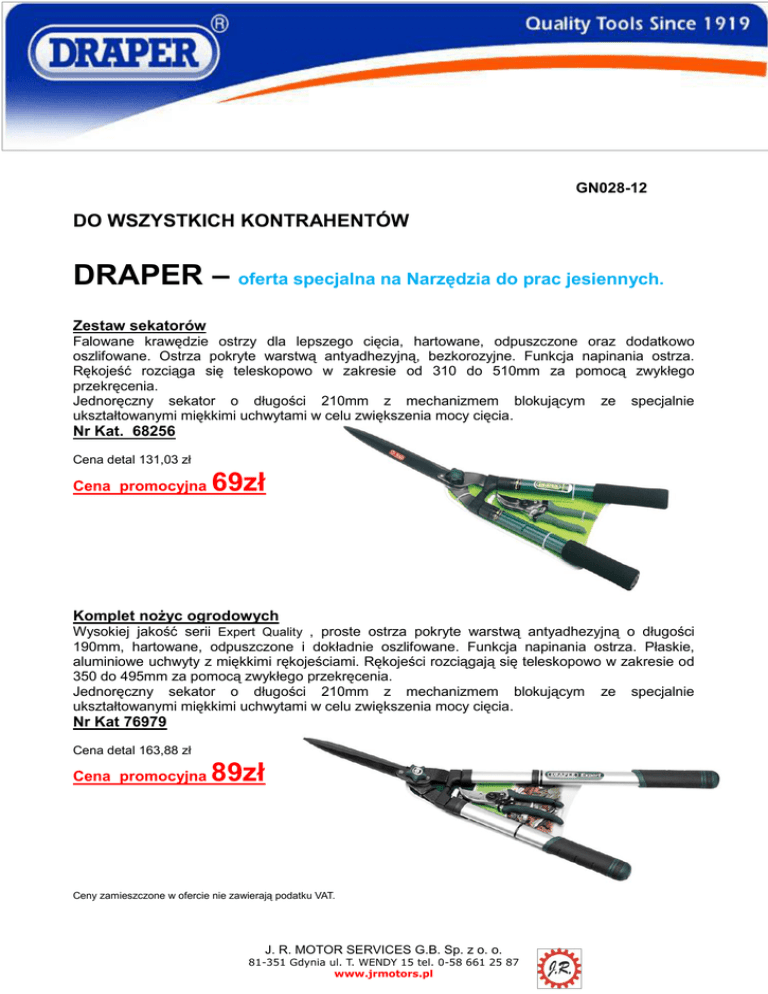 GN028-12 DO WSZYSTKICH KONTRAHENTÓW DRAPER – oferta specjalna na Narzędzia do prac jesiennych. Zestaw sekatorów Falowane krawędzie ostrzy dla lepszego cięcia, hartowane, odpuszczone oraz dodatkowo oszlifowane. Ostrza pokryte warstwą antyadhezyjną, bezkorozyjne. Funkcja napinania ostrza. Rękojeść rozciąga się teleskopowo w zakresie od 310 do 510mm za pomocą zwykłego przekręcenia. Jednoręczny sekator o długości 210mm z mechanizmem blokującym ze specjalnie ukształtowanymi miękkimi uchwytami w celu zwiększenia mocy cięcia. Nr Kat. 68256 Cena detal 131,03 zł Cena promocyjna 69zł Komplet nożyc ogrodowych Wysokiej jakość serii Expert Quality , proste ostrza pokryte warstwą antyadhezyjną o długości 190mm, hartowane, odpuszczone i dokładnie oszlifowane. Funkcja napinania ostrza. Płaskie, aluminiowe uchwyty z miękkimi rękojeściami. Rękojeści rozciągają się teleskopowo w zakresie od 350 do 495mm za pomocą zwykłego przekręcenia. Jednoręczny sekator o długości 210mm z mechanizmem blokującym ze specjalnie ukształtowanymi miękkimi uchwytami w celu zwiększenia mocy cięcia. Nr Kat 76979 Cena detal 163,88 zł Cena promocyjna 89zł Ceny zamieszczone w ofercie nie zawierają podatku VAT. J. R. MOTOR SERVICES G.B. Sp. z o. o. 81-351 Gdynia ul. T. WENDY 15 tel. 0-58 661 25 87 www.jrmotors.pl Nożyce do żywopłotu Falowane krawędzie ostrzy dla lepszego cięcia , hartowane, odpuszczone oraz dodatkowo oszlifowane z ogranicznikami. Rurowe uchwyty zakończone na końcach miękkimi rękojeściami. Nr Kat. 45327 Cena detal 75,36 zł Cena promocyjna 39zł Zestaw narzędzi ogrodowych 4 szt. W skład zestawu wchodzą: Sekator do cięcia gałęzi z ostrzem ze stali węglowej dodatkowo utwardzonym cieplnie. Średnica cięcia 25mm. Sekator jednoręczny o długości 175mm posiada ostrze ze stali węglowej utwardzone cieplnie. Dodatkowo dla bezpieczeństwa posiada blokadę zamknięcia. W zestawie dodatkowo łapaki do przesadzania roślin. Nr Kat. 14317 Cena detal 164,30 zł Cena promocyjna 89zł Teleskopowy sekator + sekator jednoręczny 210mm Wysokiej jakość serii Expert Quality, ostrza hartowane i odpuszczone z jednym ostrzem pokrytym powłoką antyadhezyjną. Płaskie, aluminiowe uchwyty z miękkimi rękojeściami, które rozciąga się od 480 do 780mm poprzez proste przekręcenie. Średnica cięcia 45mm. Jednoręczny sekator o długości 210mm z mechanizmem blokującym ze specjalnie ukształtowanymi miękkimi uchwytami w celu zwiększenia mocy cięcia. Nr Kat 76980 Cena detal 189,99 zł Cena promocyjna 99zł Ceny zamieszczone w ofercie nie zawierają podatku VAT. J. R. MOTOR SERVICES G.B. Sp. z o. o. 81-351 Gdynia ul. T. WENDY 15 tel. 0-58 661 25 87 www.jrmotors.pl Sekator z aluminium do gałęzi 685mm Wysokiej jakość serii Expert Quality ostrze głowicy wykonane z japońskiej stali SK-5, powlekane powłoką antyadhezyjną. Specjalna głowica umożliwia cięcie gałęzi w płaszczyźnie pionowej od spodu drzewa lub krzewu dając proste i czyste cięcie. Takie rozwiązanie umożliwia wzrost wydajności cięcia o 30%. Rączki wykonane z lekkiego aluminium zakończone miękką rękojeścią. Średnica cięcia 35mm. Nr Kat. 03315 Cena detal 136,05 zł Cena promocyjna 79zł Sekator ogrodowy o dł. 650mm Hartowane i odpuszczone ostrza dodatkowo jedno pokryte powłoka antyadhezyjną. Każdy sekator posiada miękkie profilowane rękojeści. Nr Kat. 19945 ( Kowadełkowy ) Nr Kat 19941 Cena detal 100,02 zł Cena promocyjna Cena detal 138,54 zł 49zł Cena promocyjna 59zł Zestaw sekatorów Teleskopowy sekator z miękkimi rękojeściami. Zakres pracy od 460 do 765mm. W zestawie sekator jednoręczny o dł. 210mm ze specjalnie ukształtowanymi miękkimi uchwytami w celu zwiększenia mocy cięcia. Nr Kat 68255 Cena detal 136,05 zł Cena promocyjna 79zł Ceny zamieszczone w ofercie nie zawierają podatku VAT. J. R. MOTOR SERVICES G.B. Sp. z o. o. 81-351 Gdynia ul. T. WENDY 15 tel. 0-58 661 25 87 www.jrmotors.pl Sekatory do gałęzi wykonane z wytrzymałego Fibreglassu o dł. 540mm Wysokiej jakość serii Expert Quality, ostrze z japońskiej stali SK-5 gwarantujące wysoką wydajność cięcia. Rączki wykonane z lekkiego i wytrzymałego Fibreglassu. Do cięcia gałęzi o średnicy 35mm. 03306 03307 Nr Kat. 03306 Cena detal 107,06 zł 59zł Nr Kat. 03308 Cena promocyjna 59zł Nr Kat. 03309 Cena detal 106,78 zł Cena promocyjna 03309 Nr Kat. 03307 Cena detal 106,95 zł Cena promocyjna 03308 Cena detal 106,79 zł 59zł Cena promocyjna 59zł Nożyce do trawy Ręczne nożyce z "obrotową głowicą" 360° Nóż można użytkować w poziome (0°), aż do pionowej (90°). Długość ostrza = 140 mm. Ostrze szlifowane, obrabiane cieplnie z powłoką antyadhezyjną. Jedno ostrze jest ustalone, aby umożliwić przycinanie trawy w pobliżu ścian. Nr Kat 14283 Cena detaliczna 54,74zł Cena promocyjna 35zł Ceny zamieszczone w ofercie nie zawierają podatku VAT. J. R. MOTOR SERVICES G.B. Sp. z o. o. 81-351 Gdynia ul. T. WENDY 15 tel. 0-58 661 25 87 www.jrmotors.pl Toporek – 560g Idealnie wyważony, z głowicą ze stali węglowej, hartowany i odpuszczony z oszlifowaną i lakierowaną powierzchnią. Stalowy trzonek rurowy z uchwytem antypoślizgowym. Nr Kat 62166 Cena detaliczna 55,57zł Cena promocyjna 35zł Toporek i Siekiery z trzonkiem z Fibreglass’ u Wysokiej jakość serii Expert Quality. Wyprodukowany zgodnie z normą BS2945:1995. Kuta głowica ze stali węglowej dodatkowo utwardzana i szlifowana. Idealnie wywarzone. Trzonek wykonany z lekkiego bardzo wytrzymałego włókna szklanego. Nr Kat 09941 – 680 g dł. 415 mm Nr Kat 09942 – 1,6 kg dł. 860 mm Nr Kat 09943 – 2,0 kg dł. 860 mm Nr Kat 09944 – 2,7 kg dł. Nr Kat 09941 Nr Kat 09942 Nr Kat 09943 Cena detaliczna 73,71zł Cena detaliczna 169,57zł Cena detaliczna 187,8zł Cena promocyjna 39zł Cena promocyjna 89zł Cena promocyjna Nr Kat 09944 Cena detaliczna 183,64zł Cena promocyjna 99zł Ceny zamieszczone w ofercie n