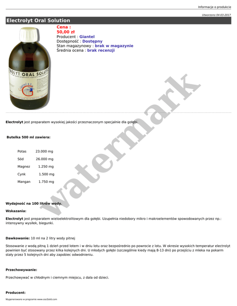 Informacje o produkcie Utworzono 04-03-2017 Electrolyt Oral Solution Cena : 50,00 zł er m ar k Producent : Giantel Dostępność : Dostępny Stan magazynowy : brak w magazynie Średnia ocena : brak recenzji Electrolyt jest preparatem wysokiej jakości przeznaczonym specjalnie dla gołębi. Butelka 500 ml zawiera: Potas 23.000 mg Sód 26.000 mg 1.250 mg Cynk 1.500 mg Mangan 1.750 mg w at Magnez Wydajność na 100 litrów wody. Wskazania: Electrolyt jest preparatem wieloelektrolitowym dla gołębi. Uzupełnia niedobory mikro i makroelementów spowodowanych przez np.: intensywny wysiłek, biegunki. Dawkowanie: 10 ml na 2 litry wody pitnej Stosowanie z wodą pitną 1 dzień przed lotem i w dniu lotu oraz bezpośrednio po powrocie z lotu. W okresie wysokich temperatur electrolyt powinien być stosowany przez kilka kolejnych dni. U młodych gołębi (szczególnie kiedy mają 8-13 dni) po przejściu z mleka na pokarm stały przez 5 kolejnych dni aby zapobiec odwodnieniu. Przechowywanie: Przechowywać w chłodnym i ciemnym miejscu, z dala od dzieci. Producent: Wygenerowano w programie www.oscGold.com w at er m ar k Giantel BV: Kruistraat 94 - 5541 RZ Reusel - Holland