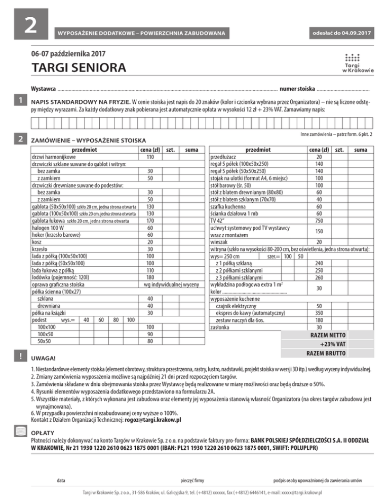 2 WYPOSAŻENIE DODATKOWE – POWIERZCHNIA ZABUDOWANA odesłać do 04.09.2017 06-07 października 2017 TARGI SENIORA Wystawca ............................................................................................................................................................... numer stoiska ....................................... 1 2 NAPIS STANDARDOWY NA FRYZIE. W cenie stoiska jest napis do 20 znaków (kolor i czcionka wybrana przez Organizatora) – nie są liczone odstępy między wyrazami. Za każdy dodatkowy znak pobierana jest automatycznie opłata w wysokości 12 zł + 23% VAT. Zamawiamy napis: Inne zamówienia – patrz form. 6 pkt. 2 ZAMÓWIENIE – WYPOSAŻENIE STOISKA przedmiot cena (zł) szt. suma drzwi harmonijkowe 110 drzwiczki szklane suwane do gablot i witryn: bez zamka 30 z zamkiem 50 drzwiczki drewniane suwane do podestów: bez zamka 30 z zamkiem 50 gablota (50x50x100) szkło 20 cm, jedna strona otwarta 130 gablota (100x50x100) szkło 20 cm, jedna strona otwarta 130 gablota łukowa szkło 20 cm, jedna strona otwarta 170 halogen 100 W 60 hoker (krzesło barowe) 60 kosz 20 krzesło 30 lada z półką (100x50x100) 100 lada z półką (50x50x100) 100 lada łukowa z półką 110 lodówka (pojemność: 120l) 180 oprawa graficzna stoiska wg indywidualnej wyceny półka ścienna (100x27) szklana 40 drewniana 40 półka na książki 30 podest wys.= 40 60 80 100 100x100 100 100x50 90 50x50 80 ! UWAGA! przedmiot cena (zł) szt. suma przedłużacz 20 regał 5 półek (100x50x250) 140 regał 5 półek (50x50x250) 140 stojak na ulotki (format A4, 6 miejsc) 100 stół barowy (śr. 50) 100 stół z blatem drewnianym (80x80) 60 stół z blatem szklanym (70x70) 40 szafka kuchenna 60 ścianka działowa 1 mb 60 TV 42” 750 uchwyt systemowy pod TV wystawcy 150 wraz z montażem wieszak 20 witryna (szkło na wysokości 80-200 cm, bez oświetlenia, jedna strona otwarta): wys= 250 cm szer.= 100 50 z 1 półką szklaną 240 z 2 półkami szklanymi 250 z 3 półkami szklanymi 260 wykładzina podłogowa extra 1 m2 30 kolor ................................................... wyposażenie kuchenne czajnik elektryczny 50 ekspres do kawy (automatyczny) 350 zestaw naczyń dla 6os. 180 zasłonka 30 RAZEM NETTO +23% VAT RAZEM BRUTTO 1. Niestandardowe elementy stoiska (element obrotowy, struktura przestrzenna, rastry, lustro, nadstawki, projekt stoiska w wersji 3D itp.) według wyceny indywidualnej. 2. Zmiany zamówienia wyposażenia możliwe są najpóźniej 21 dni przed rozpoczęciem targów. 3. Zamówienia składane w dniu obejmowania stoiska przez Wystawcę będą realizowane w miarę możliwości oraz będą droższe o 50%. 4. Rysunki elementów wyposażenia dodatkowego przedstawiono na formularzu 2A. 5. Wszystkie materiały, z których wykonana jest zabudowa oraz elementy jej wyposażenia stanowią własność Organizatora (na okres targów zabudowa jest wynajmowana). 6. W przypadku powierzchni niezabudowanej ceny wyższe o 100%. Kontakt z Działem Organizacji Technicznej: [email protected] OPŁATY Płatności należy dokonywać na konto Targów w Krakowie Sp. z o.o. na podstawie faktury pro-forma: BANK POLSKIEJ SPÓŁDZIELCZOŚCI S.A. II ODDZIAŁ W KRAKOWIE, Nr 21 1930 1220 2610 0623 1875 0001 (IBAN: PL21 1930 1220 2610 0623 1875 0001, SWIFT: POLUPLPR) data pieczęć firmy podpis osoby upoważnionej do zawierania umów Targi w Krakowie Sp. z o.o., 31-586 Kraków, ul. Galicyjska 9, tel. (+4812) xxxxxx, fax (+4812) 6446141, e-mail: [email protected] 2A ELEMENTY WYPOSAŻENIA DODATKOWEGO – POWIERZCHNIA ZABUDOWANA 06-07 października 2017 TARGI SENIORA 2. Gablota 1. Lada z półką cm 50 50 50 cm 50 cm 50 cm cm 3. Podest m 4. Lada łukowa z półką m 0c 10 cm 50 0c 10 80cm 100cm 100cm 100cm 100cm cm 50 m 0c 10 80cm cm 0 10 50 100cm 40,60,80,100cm 40,60,80,100cm 40,60,80,100cm cm 50 cm 50 10 10 0c cm 5. Witryna 6. Regał cm 100 cm 100 m 50c 7. Ścianka działowa m 0c 10 0c m m 8. Półki ścienne: a) szklana b) drewniana c) półka na książki cm 100 cm 100 27 9. Krzesło 250cm 80cm 70cm 80cm 11. Stół z blatem m drewnianym 80c cm cm data m 80 70 cm 45 8c cm 10. Stół z blatem 70cm szklanym 40cm cm 50 cm cm 250cm 250cm 50 50 27 80cm 80cm 250cm 250cm cm pieczęć firmy podpis osoby upoważnionej do zawierania umów Targi w Krakowie Sp. z o.o., 31-586 Kraków, ul. Galicyjska 9, tel. (+4812) xxxxxx, fax (+4812) 6446141, e-mail: [email protected] 2B odesłać do 04.09.2017 MEDIA – POWIERZCHNIA ZABUDOWANA 06-07 października 2017 TARGI SENIORA Wystawca ............................................................................................................................................................... numer stoiska ....................................... 1 ZAMÓWIENIE – ENERGIA ELEKTRYCZNA Firmy korzystające z zabudowy Organizatora otrzymują 1 gniazdo 230 V 2kW (1 faza) w standardzie. W przypadku zapotrzebowania na większą liczbę gniazd lub większą moc istnieje możliwość zamówienia dodatkowo: gniazdo 230 V (1 faza) cena (zł) 230 V 2 kW 220 230 V całodobowe 2 kW (np. do lodówek) 260 gniazdo 400 V (3- fazy) 2 cena (zł) do 6 kW / 16 A 420 6,1 – 10 kW / 16 A 570 6,1 – 10 kW / 32 A 570 10,1 – 20 kW / 32 A 810 20,1 – 36 kW / 63 A 1580 RAZEM ilość RAZEM cena (zł) ZAMÓWIENIE – WODA 3 ilość doprowadzenie i odprowadzenie wody do wskazanego punktu na stoisku 300 doprowadzenie i odprowadzenie wody do każdego kolejnego punktu na stoisku 150 szafka z 1-komorowym zlewem i podgrzewaczem wody 350 cena (zł) ZAMÓWIENIE – SPRĘŻONE POWIETRZE doprowadzenie przyłącza sprężonego powietrza do wskazanego punktu na stoisku (ciśnienie do 8 bar), przewód zakończony szybkozłączem 26KA ŁĄCZNA WARTOŚĆ ZAMÓWIENIA (POZ. 1-3) ilość ilość RAZEM RAZEM 380 RAZEM NETTO + 23% VAT ! BRUTTO UWAGA! 1. Zmiany zamówienia możliwe są najpóźniej 21 dni przed rozpoczęciem targów. 2. Zamówienia składane w dniu obejmowania stoiska przez Wystawcę będą realizowane w mi