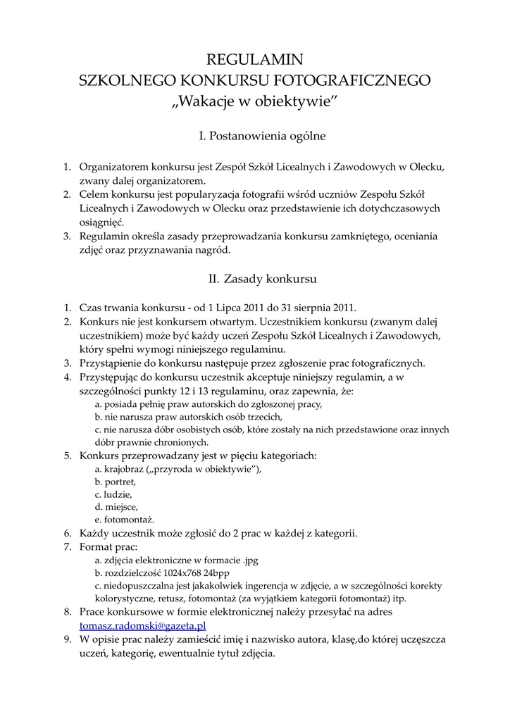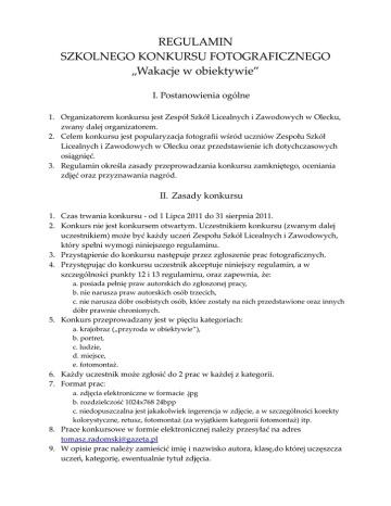 REGULAMIN SZKOLNEGO KONKURSU FOTOGRAFICZNEGO „Wakacje w obiektywie” I. Postanowienia ogólne 1. Organizatorem konkursu jest Zespół Szkół Licealnych i Zawodowych w Olecku, zwany dalej organizatorem. 2. Celem konkursu jest popularyzacja fotografii wśród uczniów Zespołu Szkół Licealnych i Zawodowych w Olecku oraz przedstawienie ich dotychczasowych osiągnięć. 3. Regulamin określa zasady przeprowadzania konkursu zamkniętego, oceniania zdjęć oraz przyznawania nagród. II. Zasady konkursu 1. Czas trwania konkursu - od 1 Lipca 2011 do 31 sierpnia 2011. 2. Konkurs nie jest konkursem otwartym. Uczestnikiem konkursu (zwanym dalej uczestnikiem) może być każdy uczeń Zespołu Szkół Licealnych i Zawodowych, który spełni wymogi niniejszego regulaminu. 3. Przystąpienie do konkursu następuje przez zgłoszenie prac fotograficznych. 4. Przystępując do konkursu uczestnik akceptuje niniejszy regulamin, a w szczególności punkty 12 i 13 regulaminu, oraz zapewnia, że: a. posiada pełnię praw autorskich do zgłoszonej pracy, b. nie narusza praw autorskich osób trzecich, c. nie narusza dóbr osobistych osób, które zostały na nich przedstawione oraz innych dóbr prawnie chronionych. 5. Konkurs przeprowadzany jest w pięciu kategoriach: a. krajobraz („przyroda w obiektywie”), b. portret, c. ludzie, d. miejsce, e. fotomontaż. 6. Każdy uczestnik może zgłosić do 2 prac w każdej z kategorii. 7. Format prac: a. zdjęcia elektroniczne w formacie .jpg b. rozdzielczość 1024x768 24bpp c. niedopuszczalna jest jakakolwiek ingerencja w zdjęcie, a w szczególności korekty kolorystyczne, retusz, fotomontaż (za wyjątkiem kategorii fotomontaż) itp. 8. Prace konkursowe w formie elektronicznej należy przesyłać na adres [email protected] 9. W opisie prac należy zamieścić imię i nazwisko autora, klasę,do której uczęszcza uczeń, kategorię, ewentualnie tytuł zdjęcia. 10. Termin składania prac upływa 31 sierpnia (środa). 11. Nadesłane prace zostaną sukcesywnie zamieszczane na stronie internetowej szkoły www.zsliz.olecko.pl do dnia 10 października 2011r. 12. Prace nagrodzone i wyróżnione będą eksponowane na wystawie pokonkursowej w budynku Zespołu Szkół Licealnych i Zawodowych oraz na stronie internetowej szkoły. 13. W przypadku prac nagrodzonych i wyróżnionych organizator zastrzega sobie prawo do ich nieodpłatnej publikacji w materiałach związanych z konkursem oraz promocją Zespołu Szkół Licealnych i Zawodowych z zaznaczeniem imienia i nazwiska autora. III. Zasady rozstrzygnięcia konkursu 1. Prace zostaną ocenione przez głosowanie przeprowadzone wśród uczniów Zespołu Szkół Licealnych i Zawodowych w Olecku w dniu 12 października 2011. 2. Zwycięzcą zostanie autor, którego praca otrzyma najwięcej punktów w danej kategorii. 3. Nagrody będą przyznawane w każdej kategorii niezależnie. 4. W przypadku jednakowej ilości punktów o zwycięstwie zadecyduje komisja konkursowa. 5. Komisja konkursowa zastrzega sobie prawo do nie przyznania pierwszej nagrody. 6. Organizator nie zwraca zgłoszonych prac. 7. Dla zwycięzców w każdej kategorii przewidziano nagrody. 8. Ogłoszenie wyników i rozdanie nagród 14 października 2011. IV. Postanowienia końcowe 1. Wzięcie udziału w konkursie (przesłanie prac) jest równoznaczne z wyrażeniem zgody na wykorzystywanie danych osobowych uczestnika zgodnie z przepisami Ustawy z 29 sierpnia 1997 r. o ochronie danych osobowych. 2. Uczestnicy ponoszą pełną odpowiedzialność za zgodność z prawdą danych nadesłanych wraz z pracami wynikającą z przepisów Kodeksu Cywilnego z 23 kwietnia 1964 r. oraz Ustawy z 4 lutego 1994 r. o prawie autorskim i prawach pokrewnych. 3. Organizator nie ponosi odpowiedzialności prawnej za naruszenie praw autorskich osób trzecich przez uczestników konkursu. 4. Organizator zastrzega sobie prawo do skrócenia, przedłużenia, przerwania lub odwołania konkursu bez podania przyczyny. 5. Niniejszy dokument jest jedynym dokumentem określającym zasady konkursu. 6. Regulamin jest do dostępny w siedzibie oraz na stronie internetowej organizatora. 7. We wszystkich sprawach nieobjętych niniejszym regulaminem decyduje organizator o ile akty prawne wyższego rzędu nie stanowią inaczej.