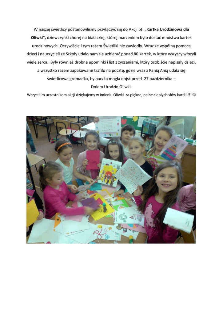 W naszej świetlicy postanowiliśmy przyłączyć się do Akcji pt. „Kartka Urodzinowa dla Oliwki”, dziewczynki chorej na białaczkę, której marzeniem było dostać mnóstwo kartek urodzinowych. Oczywiście i tym razem Świetliki nie zawiodły. Wraz ze wspólną pomocą dzieci i nauczycieli ze Szkoły udało nam się uzbierać ponad 80 kartek, w które wszyscy włożyli wiele serca. Były również drobne upominki i list z życzeniami, który osobiście napisały dzieci, a wszystko razem zapakowane trafiło na pocztę, gdzie wraz z Panią Anią udała się świetlicowa gromadka, by paczka mogła dojść przed 27 października – Dniem Urodzin Oliwki. Wszystkim uczestnikom akcji dziękujemy w imieniu Oliwki za piękne, pełne ciepłych słów kartki !!!