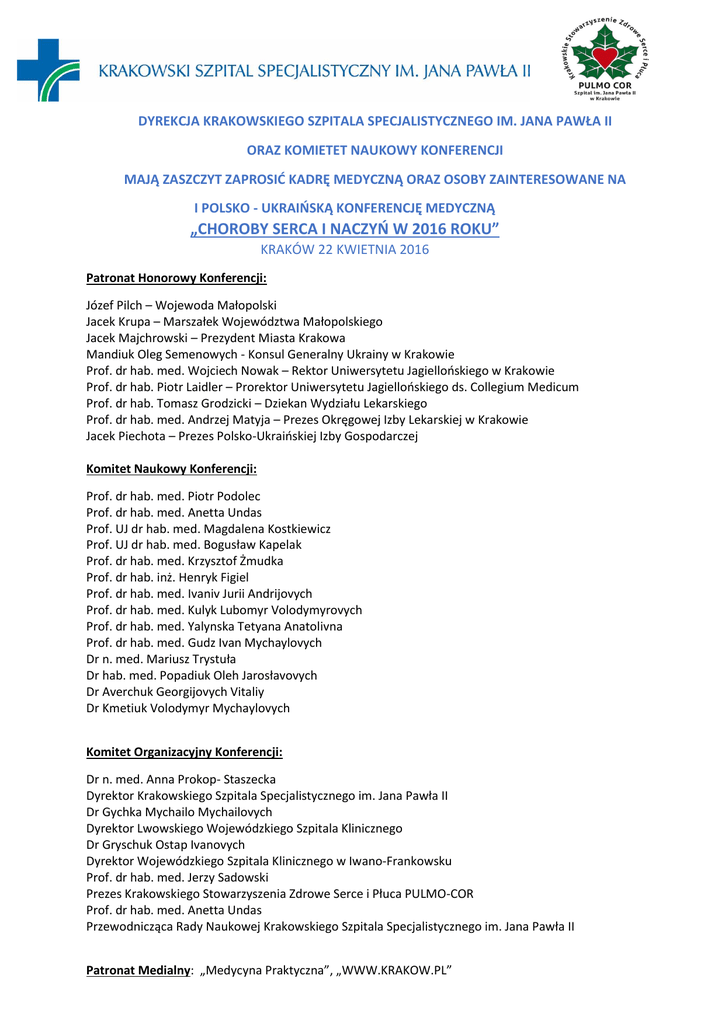 DYREKCJA KRAKOWSKIEGO SZPITALA SPECJALISTYCZNEGO IM. JANA PAWŁA II ORAZ KOMIETET NAUKOWY KONFERENCJI MAJĄ ZASZCZYT ZAPROSIĆ KADRĘ MEDYCZNĄ ORAZ OSOBY ZAINTERESOWANE NA I POLSKO - UKRAIŃSKĄ KONFERENCJĘ MEDYCZNĄ „CHOROBY SERCA I NACZYŃ W 2016 ROKU” KRAKÓW 22 KWIETNIA 2016 Patronat Honorowy Konferencji: Józef Pilch – Wojewoda Małopolski Jacek Krupa – Marszałek Województwa Małopolskiego Jacek Majchrowski – Prezydent Miasta Krakowa Mandiuk Oleg Semenowych - Konsul Generalny Ukrainy w Krakowie Prof. dr hab. med. Wojciech Nowak – Rektor Uniwersytetu Jagiellońskiego w Krakowie Prof. dr hab. Piotr Laidler – Prorektor Uniwersytetu Jagiellońskiego ds. Collegium Medicum Prof. dr hab. Tomasz Grodzicki – Dziekan Wydziału Lekarskiego Prof. dr hab. med. Andrzej Matyja – Prezes Okręgowej Izby Lekarskiej w Krakowie Jacek Piechota – Prezes Polsko-Ukraińskiej Izby Gospodarczej Komitet Naukowy Konferencji: Prof. dr hab. med. Piotr Podolec Prof. dr hab. med. Anetta Undas Prof. UJ dr hab. med. Magdalena Kostkiewicz Prof. UJ dr hab. med. Bogusław Kapelak Prof. dr hab. med. Krzysztof Żmudka Prof. dr hab. inż. Henryk Figiel Prof. dr hab. med. Ivaniv Jurii Andrijovych Prof. dr hab. med. Kulyk Lubomyr Volodymyrovych Prof. dr hab. med. Yalynska Tetyana Anatolivna Prof. dr hab. med. Gudz Ivan Mychaylovych Dr n. med. Mariusz Trystuła Dr hab. med. Popadiuk Oleh Jarosłavovych Dr Averchuk Georgijovych Vitaliу Dr Kmetiuk Volodymyr Mychaylovych Komitet Organizacyjny Konferencji: Dr n. med. Anna Prokop- Staszecka Dyrektor Krakowskiego Szpitala Specjalistycznego im. Jana Pawła II Dr Gychka Mychailo Mychailovych Dyrektor Lwowskiego Wojewódzkiego Szpitala Klinicznego Dr Gryschuk Ostap Ivanovych Dyrektor Wojewódzkiego Szpitala Klinicznego w Iwano-Frankowsku Prof. dr hab. med. Jerzy Sadowski Prezes Krakowskiego Stowarzyszenia Zdrowe Serce i Płuca PULMO-COR Prof. dr hab. med. Anetta Undas Przewodnicząca Rady Naukowej Krakowskiego Szpitala Specjalistycznego im. Jana Pawła II Patronat Medialny: „Medycyna Praktyczna”, „WWW.KRAKOW.PL” I Polsko-Ukraińska Konferencja „Choroby Serca i Naczyń w 2016 roku” Krakowski Szpital Specjalistyczny im Jana Pawła II - Kraków 22 kwietnia 2016 PROGRAM NAUKOWY Moderatorzy Konferencji: Prof. dr hab. med. Piotr Podolec Prof. UJ dr hab. med. Grzegorz Gajos 8:00 - 8:30 Rejestracja uczestników 8:30 - 9:00 Uroczyste otwarcie oraz wystąpienia zaproszonych Gości 9:00 – 10:15 Sesja I DIAGNOSTYKA OBRAZOWA Prowadzenie: Dr med. Wojciech Szot (Kraków) Prof. dr hab. med. Yalynska Tatyana Anatolivna (Kijów) Badania obrazowe – nowe możliwości, nowe technologie, integracja informacji (j. pol.) Prof. UJ dr hab. med. Magdalena Kostkiewicz, dr med. Wojciech Szot (Kraków) Wrodzone wady serca. Kardiomiopatia gąbczasta: diagnostyka MRI (j. ang.) Prof. dr hab. med. Tatyana Anatolivna Yalynska (Kijów) Trójwymiarowa echokardiografia w diagnostyce wad przeciekowych serca (j. pol.) Dr hab. med. Monika Komar (Kraków) Elastografia - nowe narzędzie w diagnostyce obrazowej (j. pol.) Dr Tadeusz Wilkosz (Kraków) Dyskusja 10:15 – 10:30 Zaproszenie do współpracy Polskie Archiwum Medycyny Wewnętrznej - Vice Editor in-Chief: Prof. UJ dr hab. med. Grzegorz Gajos Journal of Rare Cardiovascular Diseases - Editor in-Chief: Prof. dr hab. med. Piotr Podolec Ukraińskie wydanie „Interny Szczeklika” przez wydawnictwo Medycyna Praktyczna – mgr Aleksandra Kubiec 10:30 – 10:45 Coffee break 10:45 – 12:00 Sesja II CHOROBY SERCA i NACZYŃ Prowadzenie: Prof. dr hab. n. med. Piotr Podolec Prof. dr hab. n. med. Liubomyr Vladymyrovych Kulyk Przewlekła zatorowość płucna (j. pol.) Prof. dr hab. n. med. Liubomyr Vladymyrovych Kulyk (Lwów) Programy leczenia nadciśnienia płucnego – angioplastyka tętnic płucnych. Kiedy? Komu? (j. pol.) Prof. dr hab. n. med. Piotr Podolec, Dr hab. n. med. Grzegorz Kopeć (Kraków) Zabiegi hybrydowe, bypassy, zastawki TAVI (j. pol.) Prof. dr hab. med. Krzysztof Żmudka, Prof. UJ dr hab. med. Bogusław Kapelak, dr Jarosław Trębacz (Kraków) Kardiomiopatia w chorobach zastawkowych serca. Ocena czynnościowej rezerwy lewej komory u pacjentów z choroba zastawkowa serca. (j. pol.) Prof. dr hab. n. med. Jurij Andrijovych Ivaniv (Lwów) Dyskusja 12:00 – 12:15 Coffee break 12:15 – 13:30 Sesja III KARDIOCHIRURGIA I CHIRURGIA NACZYŃ Prowadzenie: Prof. UJ dr hab. med. Bogusław Kapelak (Kraków) dr hab. n. med. Oleksiy Ivanovych Gudz (Iwano-Frankiwsk) Endowaskularne leczenie schorzeń naczyniowych (j. pol.) Dr n. med. Mariusz Trystuła (Kraków) Angioplastyka tętnic dogłowowych - wskazania, wyniki (j. pol.) Prof dr hab med. Piotr Pieniążek, Dr hab med. Piotr Musiałek, Dr n. med. Łukasz Tekieli Wykorzystanie wielorzędowej tomografii komputerowej dla oceny przydatności żyły odpiszczelowej jako pomostu do dystalnej rekonstrukcji tętniczej. (j. ang.) dr n. med. Oleksiy Ivanovych Gudz (Iwano-Frankiwsk) Dyskusja 13:30 – 14:15 - lunch 14: 15 – 15: 15 Sesja IV Możliwości diagnostyczne i terapeutyczne Krakowskiego Szpitala Specjalistycznego im Jana Pawła II dla lekarzy i pacjentów z Ukrainy (j. pol.) dr med. Dorota Sobczyk – Pełnomocnik Dyrektora ds. Rozwoju Kardiologii, Chirurgii, Neurologii i Transplantologii (Kraków) Organizacja pracowni echokardiograficznych i monitorowania EKG w KSS im Jana Pawła II (j. pol.) Prof. UJ dr hab. med. Andrzej Gackowski Zwiedzanie wybranych oddziałów szpitala Organizator: Biuro Marketingu i Edukacji Krakowskiego Szpitala Specjalistycznego im. Jana Pawła II, osoba kontaktowa: Jadwiga Zając, e-mail: [email protected]; tel.: 12 614 22 64 lub +48 505 060 119.