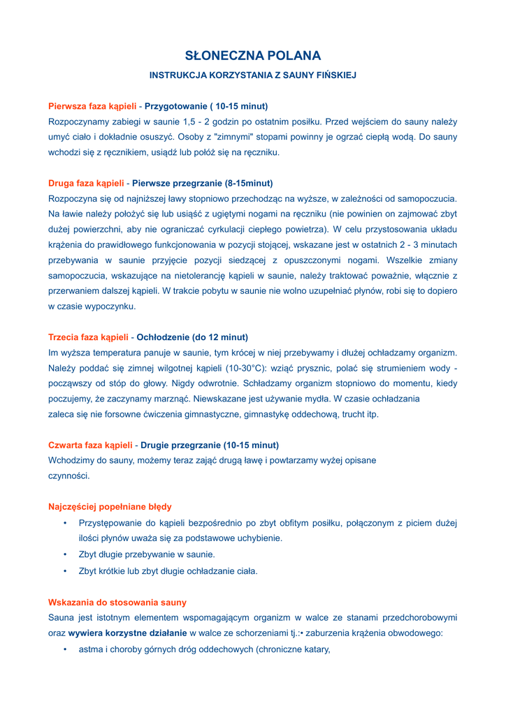 SŁONECZNA POLANA INSTRUKCJA KORZYSTANIA Z SAUNY FIŃSKIEJ Pierwsza faza kąpieli - Przygotowanie ( 10-15 minut) Rozpoczynamy zabiegi w saunie 1,5 - 2 godzin po ostatnim posiłku. Przed wejściem do sauny należy umyć ciało i dokładnie osuszyć. Osoby z "zimnymi" stopami powinny je ogrzać ciepłą wodą. Do sauny wchodzi się z ręcznikiem, usiądź lub połóż się na ręczniku. Druga faza kąpieli - Pierwsze przegrzanie (8-15minut) Rozpoczyna się od najniższej ławy stopniowo przechodząc na wyższe, w zależności od samopoczucia. Na ławie należy położyć się lub usiąść z ugiętymi nogami na ręczniku (nie powinien on zajmować zbyt dużej powierzchni, aby nie ograniczać cyrkulacji ciepłego powietrza). W celu przystosowania układu krążenia do prawidłowego funkcjonowania w pozycji stojącej, wskazane jest w ostatnich 2 - 3 minutach przebywania w saunie przyjęcie pozycji siedzącej z opuszczonymi nogami. Wszelkie zmiany samopoczucia, wskazujące na nietolerancję kąpieli w saunie, należy traktować poważnie, włącznie z przerwaniem dalszej kąpieli. W trakcie pobytu w saunie nie wolno uzupełniać płynów, robi się to dopiero w czasie wypoczynku. Trzecia faza kąpieli - Ochłodzenie (do 12 minut) Im wyższa temperatura panuje w saunie, tym krócej w niej przebywamy i dłużej ochładzamy organizm. Należy poddać się zimnej wilgotnej kąpieli (10-30°C): wziąć prysznic, polać się strumieniem wody począwszy od stóp do głowy. Nigdy odwrotnie. Schładzamy organizm stopniowo do momentu, kiedy poczujemy, że zaczynamy marznąć. Niewskazane jest używanie mydła. W czasie ochładzania zaleca się nie forsowne ćwiczenia gimnastyczne, gimnastykę oddechową, trucht itp. Czwarta faza kąpieli - Drugie przegrzanie (10-15 minut) Wchodzimy do sauny, możemy teraz zająć drugą ławę i powtarzamy wyżej opisane czynności. Najczęściej popełniane błędy • Przystępowanie do kąpieli bezpośrednio po zbyt obfitym posiłku, połączonym z piciem dużej ilości płynów uważa się za podstawowe uchybienie. • Zbyt długie przebywanie w saunie. • Zbyt krótkie lub zbyt długie ochładzanie ciała. Wskazania do stosowania sauny Sauna jest istotnym elementem wspomagającym organizm w walce ze stanami przedchorobowymi oraz wywiera korzystne działanie w walce ze schorzeniami tj.:• zaburzenia krążenia obwodowego: • astma i choroby górnych dróg oddechowych (chroniczne katary, • przeziębienia itp.) • reumatyzm, choroby stawów i schorzeń dysku międzykręgowego • otyłość (usuwanie wody), wychudzenie organizmu (poprawa apetytu) • rozregulowanie systemu nerwowego (nerwica żołądka, nerwica serca) • schorzenia nerek Bezwzględne przeciwwskazania do stosowania sauny • Wszystkie choroby w stanie ostrym i podostrym. • Wszystkie postacie niewydolności krążenia. • Zmiany degeneracyjne mięśnia sercowego ze współistniejącą dusznicą bolesną. • Choroby do pół roku po przebytym zawale mięśnia sercowego. • Wszystkie choroby serca przebiegające ze wzrostem oporu płucnego /serce płucne, wada zastawki dwudzielnej/. • Stenokardia. • Choroba nadciśnieniowa trzeciego stopnia. • Kamica nerkowa. • Padaczka, klaustrofobia. • Schizofrenia i inne schorzenia psychiczne. • Choroby nowotworowe, czynna gruźlica, robaczyce, choroby weneryczne • Zakrzepowe zapalenie żył • Jaskra • Alkoholizm i narkomania