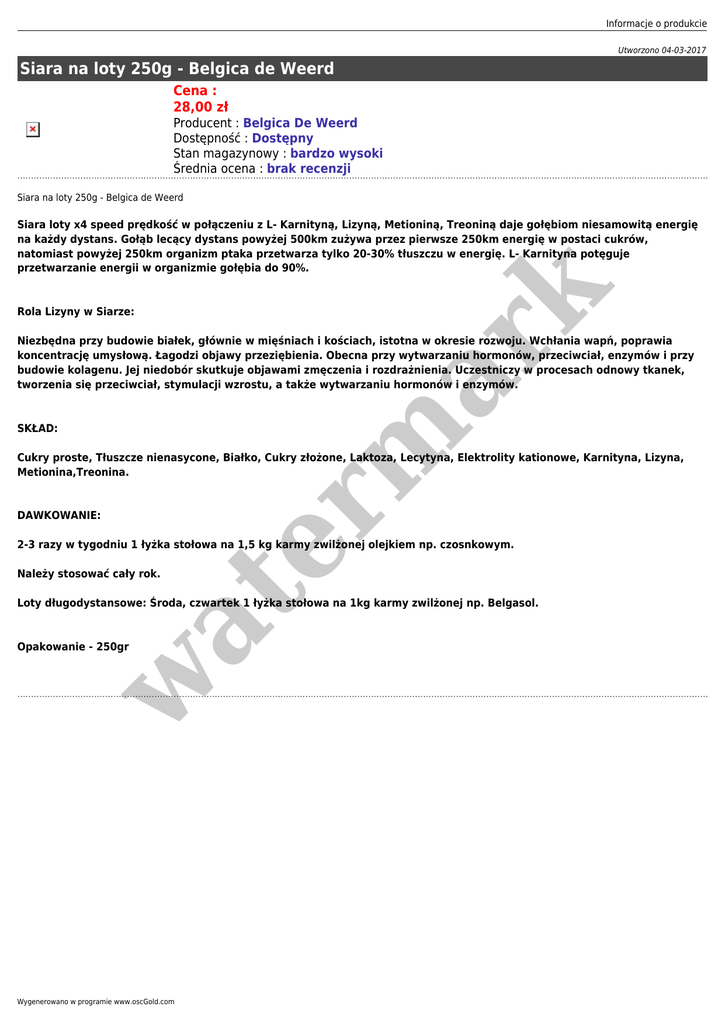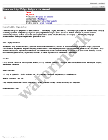 Informacje o produkcie Utworzono 04-03-2017 Siara na loty 250g - Belgica de Weerd Cena : 28,00 zł Producent : Belgica De Weerd Dostępność : Dostępny Stan magazynowy : bardzo wysoki Średnia ocena : brak recenzji Siara na loty 250g - Belgica de Weerd Rola Lizyny w Siarze: er m ar k Siara loty x4 speed prędkość w połączeniu z L- Karnityną, Lizyną, Metioniną, Treoniną daje gołębiom niesamowitą energię na każdy dystans. Gołąb lecący dystans powyżej 500km zużywa przez pierwsze 250km energię w postaci cukrów, natomiast powyżej 250km organizm ptaka przetwarza tylko 20-30% tłuszczu w energię. L- Karnityna potęguje przetwarzanie energii w organizmie gołębia do 90%. Niezbędna przy budowie białek, głównie w mięśniach i kościach, istotna w okresie rozwoju. Wchłania wapń, poprawia koncentrację umysłową. Łagodzi objawy przeziębienia. Obecna przy wytwarzaniu hormonów, przeciwciał, enzymów i przy budowie kolagenu. Jej niedobór skutkuje objawami zmęczenia i rozdrażnienia. Uczestniczy w procesach odnowy tkanek, tworzenia się przeciwciał, stymulacji wzrostu, a także wytwarzaniu hormonów i enzymów. SKŁAD: Cukry proste, Tłuszcze nienasycone, Białko, Cukry złożone, Laktoza, Lecytyna, Elektrolity kationowe, Karnityna, Lizyna, Metionina,Treonina. DAWKOWANIE: 2-3 razy w tygodniu 1 łyżka stołowa na 1,5 kg karmy zwilżonej olejkiem np. czosnkowym. at Należy stosować cały rok. Loty długodystansowe: Środa, czwartek 1 łyżka stołowa na 1kg karmy zwilżonej np. Belgasol. w Opakowanie - 250gr Wygenerowano w programie www.oscGold.com