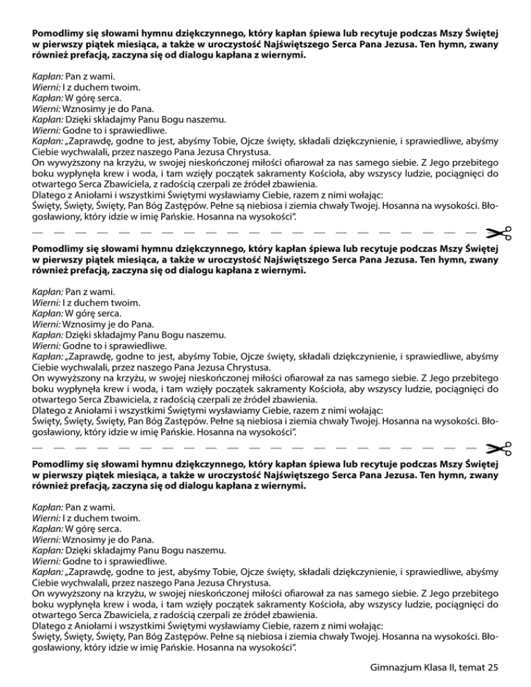 Pomodlimy się słowami hymnu dziękczynnego, który kapłan śpiewa lub recytuje podczas Mszy Świętej w pierwszy piątek miesiąca, a także w uroczystość Najświętszego Serca Pana Jezusa. Ten hymn, zwany również prefacją, zaczyna się od dialogu kapłana z wiernymi. Kapłan: Pan z wami. Wierni: I z duchem twoim. Kapłan: W górę serca. Wierni: Wznosimy je do Pana. Kapłan: Dzięki składajmy Panu Bogu naszemu. Wierni: Godne to i sprawiedliwe. Kapłan: „Zaprawdę, godne to jest, abyśmy Tobie, Ojcze święty, składali dziękczynienie, i sprawiedliwe, abyśmy Ciebie wychwalali, przez naszego Pana Jezusa Chrystusa. On wywyższony na krzyżu, w swojej nieskończonej miłości ofiarował za nas samego siebie. Z Jego przebitego boku wypłynęła krew i woda, i tam wzięły początek sakramenty Kościoła, aby wszyscy ludzie, pociągnięci do otwartego Serca Zbawiciela, z radością czerpali ze źródeł zbawienia. Dlatego z Aniołami i wszystkimi Świętymi wysławiamy Ciebie, razem z nimi wołając: Święty, Święty, Święty, Pan Bóg Zastępów. Pełne są niebiosa i ziemia chwały Twojej. Hosanna na wysokości. Błogosławiony, który idzie w imię Pańskie. Hosanna na wysokości”. Pomodlimy się słowami hymnu dziękczynnego, który kapłan śpiewa lub recytuje podczas Mszy Świętej w pierwszy piątek miesiąca, a także w uroczystość Najświętszego Serca Pana Jezusa. Ten hymn, zwany również prefacją, zaczyna się od dialogu kapłana z wiernymi. Kapłan: Pan z wami. Wierni: I z duchem twoim. Kapłan: W górę serca. Wierni: Wznosimy je do Pana. Kapłan: Dzięki składajmy Panu Bogu naszemu. Wierni: Godne to i sprawiedliwe. Kapłan: „Zaprawdę, godne to jest, abyśmy Tobie, Ojcze święty, składali dziękczynienie, i sprawiedliwe, abyśmy Ciebie wychwalali, przez naszego Pana Jezusa Chrystusa. On wywyższony na krzyżu, w swojej nieskończonej miłości ofiarował za nas samego siebie. Z Jego przebitego boku wypłynęła krew i woda, i tam wzięły początek sakramenty Kościoła, aby wszyscy ludzie, pociągnięci do otwartego Serca Zbawiciela, z radością czerpali ze źródeł zbawienia. Dlatego z Aniołami i wszystkimi Świętymi wysławiamy Ciebie, razem z nimi wołając: Święty, Święty, Święty, Pan Bóg Zastępów. Pełne są niebiosa i ziemia chwały Twojej. Hosanna na wysokości. Błogosławiony, który idzie w imię Pańskie. Hosanna na wysokości”. Pomodlimy się słowami hymnu dziękczynnego, który kapłan śpiewa lub recytuje podczas Mszy Świętej w pierwszy piątek miesiąca, a także w uroczystość Najświętszego Serca Pana Jezusa. Ten hymn, zwany również prefacją, zaczyna się od dialogu kapłana z wiernymi. Kapłan: Pan z wami. Wierni: I z duchem twoim. Kapłan: W górę serca. Wierni: Wznosimy je do Pana. Kapłan: Dzięki składajmy Panu Bogu naszemu. Wierni: Godne to i sprawiedliwe. Kapłan: „Zaprawdę, godne to jest, abyśmy Tobie, Ojcze święty, składali dziękczynienie, i sprawiedliwe, abyśmy Ciebie wychwalali, przez naszego Pana Jezusa Chrystusa. On wywyższony na krzyżu, w swojej nieskończonej miłości ofiarował za nas samego siebie. Z Jego przebitego boku wypłynęła krew i woda, i tam wzięły początek sakramenty Kościoła, aby wszyscy ludzie, pociągnięci do otwartego Serca Zbawiciela, z radością czerpali ze źródeł zbawienia. Dlatego z Aniołami i wszystkimi Świętymi wysławiamy Ciebie, razem z nimi wołając: Święty, Święty, Święty, Pan Bóg Zastępów. Pełne są niebiosa i ziemia chwały Twojej. Hosanna na wysokości. Błogosławiony, który idzie w imię Pańskie. Hosanna na wysokości”. Gimnazjum Klasa II, temat 25 Jezus i Małgorzata Maria Alacoque, witraż Gimnazjum Klasa II, temat 25 Gimnazjum Klasa II, temat 25 Przeczytajcie słowa Jezusa wypowiedziane podczas objawienia św. Małgorzacie Marii Alacoque, następnie podkreślcie: na czerwono to, co Jezus uczynił dla ludzi oraz na czarno słowa mówiące o ich niewdzięczności. „Oto Serce, które tak bardzo umiłowało ludzi, że niczego nie szczędziło, aż do wyczerpania i wyniszczenia się, by im dać dowody swej miłości. A w zamian od większości ludzi doznaję tylko niewdzięczności przez nieuszanowania i świętokradztwa, przez oziębłość i pogardę, z jaką się odnoszą do Mnie w tym Sakramencie miłości”. Przeczytajcie słowa Jezusa wypowiedziane podczas objawienia św. Małgorzacie Marii Alacoque, następnie podkreślcie: na czerwono to, co Jezus uczynił dla ludzi oraz na czarno słowa mówiące o ich niewdzięczności. „Oto Serce, które tak bardzo umiłowało ludzi, że niczego nie szczędziło, aż do wyczerpania i wyniszczenia się, by im dać dowody swej miłości. A w zamian od większości ludzi doznaję tylko niewdzięczności przez nieuszanowania i świętokradztwa, przez oziębłość i pogardę, z jaką się odnoszą do Mnie w tym Sakramencie miłości”. Przeczytajcie słowa Jezusa wypowiedziane podczas objawienia św. Małgorzacie Marii Alacoque, następnie podkreślcie: na czerwono to, co Jezus uczynił dla ludzi oraz na czarno słowa mówiące o ich niewdzięczności. „Oto Serce, które tak bardzo umiłowało ludzi, że niczego nie szczędziło, aż do wyczerpania i wyniszczenia się, by im dać dowody swej miłości. A w zamian od większości ludzi doznaję tylko niewdzięczności przez nieuszanowania i świętokradztwa, przez oziębłość i pogardę, z jaką się odnoszą do Mnie w tym Sakramencie miłości”. Przeczytajcie słowa Jezusa wypowiedziane podczas objawienia św. Małgorzacie Marii Alacoque, następnie podkreślcie: na czerwono to, co Jezus uczynił dla ludzi oraz na czarno słowa mówiące o ich niewdzięczności. „Oto Serce, które tak bardzo umiłowało ludzi, że niczego nie szczędziło, aż do wyczerpania i wyniszczenia się, by im dać dowody swej miłości. A w zamian od większości ludzi doznaję tylko niewdzięczności przez nieuszanowania i świętokradztwa, prze