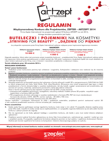 REGULAMIN Międzynarodowy Konkurs dla Projektantów, ZEPTER – ARTZEPT 2014 Firma Zepter International ma przyjemność ogłosić XI Konkurs ARTZEPT na rok 2014, którego tematem przewodnim jest hasło: BUTELECZKI I POJEMNIKI NA KOSMETYKI „STRIVING FOR BEAUTY” – „DĄŻENIE DO PIĘKNA” Jury ekspertów wyznaczone przez firmę Zepter International wybierze najlepsze prace inspirowane tegorocznym tematem. NAGRODY: Zdobywca pierwszego miejsca otrzyma 10 000 € Zdobywca drugiego miejsca otrzyma Zdobywca trzeciego miejsca otrzyma produkty firmy Zepter, wybrane z katalogu przez laureata o wartości produkty firmy Zepter, wybrane z katalogu przez laureata o wartości 4 000 € 3 000 € Nagroda specjalna, której celem jest promocja artysty (uczestnika konkursu) – przedstawiciele firmy Zepter International wybiorą jedną lub więcej prac, które zostaną wyprodukowane w małych seriach (do 100 sztuk) i wystawione w budynkach Spółki lub innych obiektach na całym świecie wybranych przez firmę, wraz z imieniem i nazwiskiem projektanta w widocznym miejscu. Termin składania prac: 20 września 2014 r. REGULAMIN KONKURSU: Temat i prace konkursowe 1. Nadesłane prace konkursowe powinny być unikatowe i oryginalne, funkcjonalne i estetyczne oraz nadawać się do masowej produkcji. 2. Zgodnie z tematem konkursu, uczestnicy powinni przedstawić propozycje projektów pojemników na kosmetyki, które obejmują: • Buteleczki na perfumy i wody toaletowe • Pojemniki na dezodoranty w sprayu i w kulce • Słoiczki i inne pojemniki na kremy, balsamy, żele, pudry, kosmetyki do makijażu itd. • Opakowania na kosmetyki do pielęgnacji twarzy i ciała Główne materiały służące do przygotowania pojemników na kosmetyki to szkło, ceramika, tworzywa sztuczne i różne współczesne materiały kompozytowe. 3. Wszystkie pojemniki na kosmetyki powinny być wykonane w formie cyfrowych modeli 3D w oprogramowaniu CAD/CAM lub CAID (w takich programach jak Catia, Solid Works, ProE, Alias/Wavefront, Rhinoceros oraz innych programach tego typu), a także przedstawione w formie obrazów/zdjęć w wysokiej rozdzielczości, tak aby kształt, wygląd i przeznaczenie tych przedmiotów, jak również ich wymiary, materiały, wykończenie powierzchni i farby były dobrze widoczne. Prace w formie cyfrowej powinny być zapisane na płycie CD lub DVD i muszą zawierać: • precyzyjne pod względem technicznym, szczegółowe, naturalnej wielkości modele cyfrowe 3D projektu wszystkich części pojemników w formacie IGES lub STEP; • Plik przygotowany do druku cyfrowego w wysokiej rozdzielczości w formacie EPS, PDF lub innym standardowym formacie dla obrazów, CMYK, 300 PPI, rozmiar wydruku – B2 (500 x 700 mm); • Krótkie podsumowanie koncepcji złożonej pracy (do 300 słów); Oprócz wydruków i prototypów wykonanych ze szkła i podobnych materiałów, projektanci powinni zastosować wydruk 3D w celu uzyskania przedmiotów zarówno w formie wirtualnej jak i rzeczywistej. Prawo uczestnictwa 4. Każda osoba fizyczna spełniająca wymogi regulaminu konkursu może wziąć w nim udział. W przypadku złożenia wspólnej pracy przez kilka osób, wszystkie te osoby uznaje się za współuczestników, a w przypadku wygranej traktowane są one jako jeden laureat konkursu z jednym prawem do nagrody. 5. Nie ma ograniczeń co do liczby zgłoszeń każdego z uczestników konkursu, ale każda z prac musi zostać złożona odrębnym zgłoszeniem 6. Projektanci powinni pobrać formularz zgłoszeniowy ze strony http://www.artzept.com, wydrukować go, wypełnić i wysłać go wraz z projektem pocztą. W przypadku wypełniania formularza odręcznie powinien on być czytelny i wypełniony drukowanymi literami. Możliwe jest również wypełnienie formularza na komputerze i złożenie własnoręcznego podpisu na wydruku. Więcej informacji na temat konkursu można znaleźć na stronach: www.artzept.com,www.zepter.com, www.zepter.pl 7. Zgodnie z zasadami konkursu, żadna z wersji prac, niezależnie od tego czy jest to wersja cyfrowa, drukowana czy też inna, nie jest zwracana, chyba że jest to w sposób wyraźny zgłoszone przez artystę. 8. Każdy projektant w formularzu zgłoszeniowym powinien zadeklarować, czy chce przekazać swoją pracę na rzecz organizatora, czy też chce aby została ona mu zwrócona. W przypadku zadeklarowania przez uczestnika, iż chce on aby praca została mu zwrócona, organizator zobowiązany jest do wysłania pracy na adres podany w formularzu oraz opłacenia kosztów jej transportu. Koszty ubezpieczenia lub ryzyka zniszczenia lub uszkodzenia od chwili wysyłki z siedziby organizatora są ponoszone przez artystę. 9. Wydrukowany, wypełniony i podpisany formularz zgłoszeniowy, praca w wersji elektronicznej zapisana na płycie DVD/CD, wersja STL (do wydruku w 3D) i/lub fizyczny model projektu wykonany z odpowiedniego materiału, należy przesłać pocztą na poniższy adres do dnia: 20 września 2014 r. ZEPTER INTERNATIONAL ARTZEPT 2014 cosmetic botles and containers – „STRIVING FOR BEAUTY” C/O BRID MARKETING – Via Sibila Aleramo 13 – 20092, Cinisello Balsamo, Milano, Italy 10. Prace nadesłane po wyznaczonym terminie nie będą brane pod uwagę w konkursie. 11. Organizator nie ponosi odpowiedzialności za ewentualną utratę lub uszkodzenia prac powstałe podczas ich transportu na drodze od adresu nadania przez artystę na adres podany powyżej. 12. Firma Zepter International pokryje ubezpieczenie otrzymanych prac od chwili ich otrzymania do dnia następnego po dniu ogłoszeniu zwycięzców włącznie, tj. do dnia transportu pracy z firmy do artysty. 13. Każdy eksponat jest ubezpieczony przez organizatora do wartości 400 €. Jeżeli wartość pracy jest wyższa od kwoty podanej powyżej, właściciel pracy pokrywa wszelkie szkody powstałe w wyniku utraty lub uszkodzenia tej pracy. 14. W przypadku utraty lub uszkodzenia pracy przed jej odbiorem przez organizatora, osoba odp