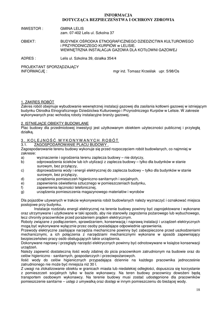 INFORMACJA DOTYCZ CA BEZPIECZE STWA I OCHRONY ZDROWIA INWESTOR : GMINA LELIS zam. 07-402 Lelis ul. Szkolna 37 OBIEKT: BUDYNEK O RODKA ETNOGRAFICZNEGO DZIEDZICTWA KULTUROWEGO i PRZYRODNICZEGO KURPIÓW w LELISIE. WEWN TRZNA INSTALACJA GAZOWA DLA KOTŁOWNI GAZOWEJ ADRES : Lelis ul. Szkolna 39, działka 354/4 PROJEKTANT SPORZ DZAJ CY INFORMACJ : mgr in . Tomasz Krze lak upr. 5/98/Os 1. ZAKRES ROBÓT Zakres robót obejmuje wybudowanie wewn trznej instalacji gazowej dla zasilania kotłowni gazowej w istniej cym budynku O rodka Etnograficznego Dziedzictwa Kulturowego i Przyrodniczego Kurpiów w Lelisie. W zakresie wykonywanych prac wchodz roboty instalacyjne bran y gazowej. 2. ISTNIEJ CE OBIEKTY BUDOWLANE Plac budowy dla przedmiotowej inwestycji jest u ytkowanym obiektem u yteczno ci publicznej i przyległ działk . 3. KOLEJNO W YKONYW ANYCH ROBÓT 3.1. ZAGOSPODAROWANIE PLACU BUDOWY . Zagospodarowanie terenu budowy wykonuje si przed rozpocz ciem robót budowlanych, co najmniej w zakresie: a) wyznaczenie i ogrodzenia terenu zaplecza budowy – nie dotyczy, b) odprowadzenia cieków lub ich utylizacji z zaplecza budowy – tylko dla budynków w stanie surowym, bez przył czy, c) doprowadzenia wody i energii elektrycznej do zaplecza budowy – tylko dla budynków w stanie surowym, bez przył czy, d) urz dzenia pomieszcze higieniczno-sanitarnych i socjalnych, e) zapewnienia o wietlenia sztucznego w pomieszczeniach budynku, f) zapewnienia ł czno ci telefonicznej, g) urz dzenia pomieszczenia magazynowego materiałów i wyrobów Dla pojazdów u ywanych w trakcie wykonywania robót budowlanych nale y wyznaczy i oznakowa miejsca postojowe przy budynku. Instalacje rozdziału energii elektrycznej na terenie budowy powinny by zaprojektowane i wykonane oraz utrzymywane i u ytkowane w taki sposób, aby nie stanowiły zagro enia po arowego lub wybuchowego, lecz chroniły pracowników przed pora eniem pr dem elektrycznym. Roboty zwi zane z podł czeniem, sprawdzaniem, konserwacj i napraw instalacji i urz dze elektrycznych mog by wykonywane wył cznie przez osoby posiadaj ce odpowiednie uprawnienia. Przewody elektryczne zasilaj ce narz dzia mechaniczne powinny by zabezpieczone przed uszkodzeniami mechanicznymi, a ich poł czenia z narz dziami mechanicznymi wykonane w sposób zapewniaj cy bezpiecze stwo pracy osób obsługuj cych takie urz dzenia. Dokonywane naprawy i przegl dy narz dzi elektrycznych powinny by odnotowywane w ksi ce konserwacji urz dze . Nale y zapewni dostateczn ilo wody zdatnej do picia pracownikom zatrudnionym na budowie oraz do celów higieniczno - sanitarnych, gospodarczych i przeciwpo arowych. Ilo wody do celów higienicznych przypadaj ca dziennie na ka dego pracownika jednocze nie zatrudnionego nie mo e by mniejsza ni 30 l. Z uwagi na zlokalizowanie obiektu w granicach miasta lub niedalekiej odległo ci, dopuszcza si korzystanie z pomieszcze socjalnych tylko w bazie wykonawcy. Na teren budowy pracownicy dowo eni b d transportem osobowym wykonawcy. Na terenie budowy musi zosta udost pnione dla pracowników pomieszczenie sanitarne – ust p z umywalk oraz dost p w innym pomieszczeniu do bie cej wody. 18 Składowanie materiałów, wyrobów i urz dze technicznych nale y wykona w sposób wykluczaj cy mo liwo wywrócenia, zsuni cia, rozsuni cia si lub spadni cia składowanych wyrobów i urz dze . Teren budowy powinien by wyposa ony w sprz t niezb dny do gaszenia po arów, który powinien by regularnie sprawdzany, konserwowany i uzupełniany, zgodnie z wymaganiami producentów i przepisów przeciwpo arowych. Ilo i rozmieszczenie ga nic przeno nych powinno by zgodne z wymaganiami przepisów przeciwpo arowych. W pomieszczeniach zamkni tych nale y zapewni wymian powietrza, wynikaj c z potrzeb bezpiecze stwa pracy. Wentylacja powinna działa sprawnie i zapewnia dopływ wie ego powietrza. Nie mo e ona powodowa przeci gów, wyzi bienia lub przegrzewania pomieszcze pracy. 3.2. ROBOTY INSTALACYJNO - MONTA OWE Zagro enia wyst puj ce przy wykonywaniu robót instalacyjno – monta owych : - oparzenia przy spawaniu przewodów instalacji gazowej ; - skaleczenia ostrymi kraw dziami rur , - stłuczenia ko czyn dolnych przy upuszczeniu elementów instalacyjnych ; - zapruszenie oczu pyłem przy wierceniu przebi instalacyjnych , - pora enia pr dem przy nieostro nym u ywaniu narz dzi elektrycznych . Punkty wietlne przy stanowiskach monta owych powinny by tak rozmieszczone, aby zapewniały równomierne o wietlenie, bez ostrych cieni i ol nie osób. W czasie monta u elementów instalacji na wysoko ci powy ej 1,70m od poziomu kondygnacji stosowa rusztowania i drabiny rozstawne. Osoby przebywaj ce na stanowiskach pracy, znajduj ce si na wysoko ci co najmniej 1,0 m od poziomu podłogi lub ziemi, powinny by asekurowane przez drugiego pracownika. Ponadto, nale y ustali rodzaje prac, które powinny by wykonywane, przez co najmniej dwie osoby, w celu zapewnienia asekuracji, ze wzgl du na mo liwo wyst pienia szczególnego zagro enia dla zdrowia lub ycia ludzkiego. Dotyczy to prac wykonywanych na wysoko ci powy ej 2,0 m w przypadkach, w których wymagane jest zastosowanie rodków ochrony indywidualnej przed upadkiem z wysoko ci. 3.3. Maszyny i urz dzenia techniczne u ytkowane na placu budowy Zagro enia wyst puj ce przy wykonywaniu robót budowlanych przy u yciu maszyn i urz dze technicznych: - pochwycenie ko czyny górnej lub ko czyny dolnej przez nap d (brak pełnej osłony nap du), - pora enie pr dem elektrycznym (brak zabezpieczenia przewodów zasilaj cych urz dzenia mechaniczne przed uszkodzeniami mechanicznymi). Narz dzia techniczne i elektryczne powinny by montowane, eksploatowane i obsługiwane zgodnie z instrukcj producenta oraz spełnia wymagania okre lone w przepisach dotycz cych systemu oceny zgodno ci. Maszyny i inne urz dzenia techniczne, podlegaj ce dozorowi technicznemu, mog by u ywane na terenie budowy tylko wówczas, je eli wystawiono dokumenty uprawniaj ce do ich eksploatacji. Wykonawca, u ytkuj cy maszyny 