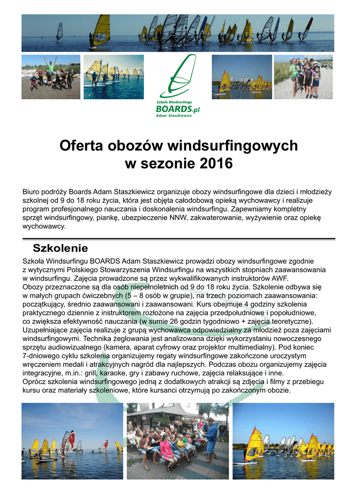 Oferta obozów windsurfingowych w sezonie 2016 Biuro podróży Boards Adam Staszkiewicz organizuje obozy windsurfingowe dla dzieci i młodzieży szkolnej od 9 do 18 roku życia, która jest objęta całodobową opieką wychowawcy i realizuje program profesjonalnego nauczania i doskonalenia windsurfingu. Zapewniamy kompletny sprzęt windsurfingowy, piankę, ubezpieczenie NNW, zakwaterowanie, wyżywienie oraz opiekę wychowawcy. Szkolenie Szkoła Windsurfingu BOARDS Adam Staszkiewicz prowadzi obozy windsurfingowe zgodnie z wytycznymi Polskiego Stowarzyszenia Windsurfingu na wszystkich stopniach zaawansowania w windsurfingu. Zajęcia prowadzone są przez wykwalifikowanych instruktorów AWF. Obozy przeznaczone są dla osób niepełnoletnich od 9 do 18 roku życia. Szkolenie odbywa się w małych grupach ćwiczebnych (5 – 8 osób w grupie), na trzech poziomach zaawansowania: początkujący, średnio zaawansowani i zaawansowani. Kurs obejmuje 4 godziny szkolenia praktycznego dziennie z instruktorem rozłożone na zajęcia przedpołudniowe i popołudniowe, co zwiększa efektywność nauczania (w sumie 26 godzin tygodniowo + zajęcia teoretyczne). Uzupełniające zajęcia realizuje z grupą wychowawca odpowiedzialny za młodzież poza zajęciami windsurfingowymi. Technika żeglowania jest analizowana dzięki wykorzystaniu nowoczesnego sprzętu audiowizualnego (kamera, aparat cyfrowy oraz projektor multimedialny). Pod koniec 7-dniowego cyklu szkolenia organizujemy regaty windsurfingowe zakończone uroczystym wręczeniem medali i atrakcyjnych nagród dla najlepszych. Podczas obozu organizujemy zajęcia integracyjne, m.in.: grill, karaoke, gry i zabawy ruchowe, zajęcia relaksujące i inne. Oprócz szkolenia windsurfingowego jedną z dodatkowych atrakcji są zdjęcia i filmy z przebiegu kursu oraz materiały szkoleniowe, które kursanci otrzymują po zakończonym obozie. Sprzęt windsurfingowy Posiadamy 150 desek wypornościowych i ślizgowych w zakresie wyporności od 80 do 240 litrów oraz 150 pędników (żagli dakronowych i monofilmowych) dostosowanych do każdych warunków wietrznych i etapu szkolenia o powierzchni od 1 do 8 m2. Wielkość i typ sprzętu jest dobierany indywidualnie w zależności od umiejętności kursanta i warunków wietrznych. Dysponujemy wszystkimi rozmiarami pianek windsurfingowych, trapezów i kamizelek asekuracyjnych. Ze względów bezpieczeństwa uczestnicy szkolenia windsurfingowego, muszą posiadać obowiązkowe buty do pływania (windsurfingowe, trampki lub tenisówki). Akwen Półwysep Helski należy do najlepszych miejsc w Europie do nauki i doskonalenia windsurfingu. Płycizna Zatoki Puckiej w Jastarni nie przekracza głębokości 100 cm w promieniu około 1 km, co czyni ten akwen najbezpieczniejszym miejscem do uprawiania windsurfingu na Półwyspie Helskim. Ukształtowanie brzegów zapewnia równy, stabilny wiatr idealny do nauki windsurfingu. Dodatkowo piaszczyste dno i plaże, płaska i ciepła woda sprzyjają nauce pływania na desce z żaglem. Bazę Szkoły dzieli jedynie wydma od akwenu szkoleniowego, gdzie odbywają się zajęcia praktyczne, a jednocześnie jest bardzo blisko do Centrum Jastarni. Opieka Dzieci i młodzież przebywająca na obozie w szkole windsurfingu BOARDS jest otoczona troskliwą, całodobową opieką wychowawcy, który organizuje czas wolny poza zajęciami windsurfingowymi. Zajęcia dla dzieci i młodzieży: • gry i zabawy ruchowe w terenie, • turniej w rzutki, • turniej w piłkarzyki, • piłka nożna i siatkowa, • aerobik, • karaoke, • wieczorne wypady do miasta i na dyskoteki. Zakwaterowanie i wyżywienie młodzieży Szkoła dysponuje pokojami 3, 4, 5 i 6 osobowymi z łazienkami w bazie Szkoły Windsurfingu BOARDS, w Jastarni przy ul. Polnej 7 – ilość miejsc ograniczona!!! Istnieje możliwość pobytu w przyczepach campingowych lub we własnym namiocie na terenie Szkoły Windsurfingu BOARDS. Przydział dzieci i młodzieży do pokoi dokonuje organizator ze względu na wiek i płeć uczestników obozu windsurfingowego. Teren ośrodka windsurfingu BOARDS jest ogrodzony i przebywają w nim jedynie kursanci szkoły co wpływa na bezpieczny pobyt dzieci i młodzieży na naszych obozach windsurfingowych. Bazę Szkoły Windsurfingowej BOARDS dzieli jedynie wydma od zatoki, gdzie odbywają się zajęcia na wodzie. Takie umiejscowienie ośrodka dodatkowo uatrakcyjnia pobyt na obozie. Jednocześnie centrum Jastarni i plaża nad Bałtykiem jest w odległości kilku minut spacerkiem. Uczestnikom Obozu windsurfingowego Szkoły Windsurfingu Boards zapewniamy pełne wyżywienie (3 posiłki dziennie) w restauracji U DANUSI. Terminy i ceny obozu Turnus Termin Cena obozu pod namiotem Cena obozu w przyczepie Cena obozu w pokoju 1. 25.06 – 02.07.2016 1220 zł 1290 zł 1395 zł 2. 02.07 – 09.07.2016 1220 zł 1290 zł 1430 zł 3. 09.07 – 16.07.2016 1220 zł 1290 zł 1430 zł 4. 16.07 – 23.07.2016 1220 zł 1290 zł 1430 zł 5. 23.07 – 30.07.2016 1220 zł 1290 zł 1430 zł 6. 30.07 – 06.08.2016 1220 zł 1290 zł 1430 zł 7. 06.08 – 13.08.2016 1220 zł 1290 zł 1430 zł 8. 13.08 – 20.08.2016 1220 zł 1290 zł 1430 zł 9. 20.08 – 27.08.2016 1220 zł 1290 zł Drugi i kolejne turnusy w sezonie 2016 są tańsze o 50 zł. 1395 zł Cena kursu obejmuje: - szkolenie windsurfingowe, - noclegi w ośrodku szkoły Boards, - wyżywienie (3 posiłki dziennie), - sprzęt windsurfingowy + kamizelka ratunkowa i trapez, - całodobową opiekę wychowawcy, - ubezpieczenie NNW, - dodatkowe atrakcje, - pianka windsurfingowa gratis. Dodatkowe opłaty: Istnieje możliwość wypożyczenia pościeli za dodatkową opłatą wynoszącą 20 zł za jeden turnus. Dotyczy wyłącznie pobytu we własnych namiotach lub w przyczepie campingowej. Informacje dodatkowe: Tygodniowe turnusy rozpoczynają się od soboty i kończą w sobotę - 7 noclegów. Zakwaterowanie odbywa się w godz. 16-18 w sobotę pierwszego dnia kursu przed kolacją i zajęciami teoret