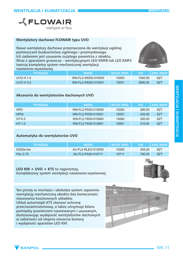 WENTYLACJA I KLIMATYZACJA WENTYLACJA Wentylatory dachowe FLOWAIR typu UVO Nowe wentylatory dachowe przeznaczone do wentylacji ogólnej pomieszczeń budownictwa ogólnego i przemysłowego. Ich zadaniem jest usuwanie zużytego powietrza z obiektu. Wraz z aparatami grzewczo - wentylacyjnymi LEO KMFB lub LEO KMFS tworzą kompletny system mechanicznej wentylacji nawiewno-wywiewnej. TYP RODZAJ INDEKS NR KAT. PROD. PLN JEDN. MIARY UVO H 1.4 WN-FL2-WD00-015000 15000 1540,00 SZT UVO H 3.0 WN-FL2-WD00-015001 15001 2680,00 SZT TYP RODZAJ INDEKS NR KAT. PROD. PLN HPD WN-FL2-PD00-015050 15050 HPDr WN-FL2-PD00-015051 15051 420,00 SZT HT-0.5 WN-FL2-TK00-015060 15060 300,00 SZT HT-1.0 WN-FL2-TK00-015061 15061 510,00 SZT 280,00 JEDN. MIARY SZT Automatyka do wentylatorów UVO INDEKS NR KAT. PROD. DSS2e-bis TYP RODZAJ AU-FL2-RLEO-010555 10555 PLN 455,00 JEDN. MIARY SZT FAL-0.75 AU-FL2-FA00-010711 10711 760,00 SZT LEO KM + UVO + KTS to najprostszy, kompleksowy system wentylacji nawiewno-wywiewnej Ten prosty w montażu i obsłudze system zapewnia wentylację mechaniczną obiektu bez konieczności stosowania kosztownych układów. Układ automatyki KTS stanowi ochronę przeciwzamrożeniową, a także utrzymuje bilans pomiędzy powietrzem nawiewanym i usuwanym, dostosowując wydajność wentylatorów dachowych w zależności od stopnia otwarcia komory i wydajności aparatów LEO KM. WK 11 WENTYLACJA I KLIMATYZACJA Akcesoria do wentylatorów dachowych UVO WENTYLACJA I KLIMATYZACJA WENTYLACJA Jednostki odzyzku ciepła OXeN OXeN to bezkanałowa jednostka wentylacyjna z odzyskiem ciepła. Urządzenie zapewnia wentylację nawiewno-wywiewną obiektów różnych gałęzi przemysłu oraz użyteczności publicznej jak magazyny, sklepy czy hale wystawowe. Jednostka nie wymaga prowadzenia jakichkolwiek dodatkowych kanałów rozprowadzających powietrze czy montażu specjalistycznej automatyki. To urządzenie kompaktowe od razu gotowe do pracy. OXeN może występować z wymiennikiem wodnym (OXeN-X2-W) lub bez niego (OXeN-X2-N). TYP RODZAJ INDEKS NR KAT. PROD. PLN JEDN. MIARY OXeN-X2-N-1.2-V NW-FL2-OXEN-N00100 30018 10990,00 SZT OXeN-X2-W-1.2-V NW-FL2-OXEN-W00100 30019 11690,00 SZT Akcesoria do jednostek odzysku ciepła OXeN W ofercie akcesoriów do jednostek odzysku ciepła OXeN znajduja się: zintegrowana czerpnia - wyrzutnia powietrza do montażu naściennego OxS, przedłużenie do czerpni powietrza 600 mm OxE, które umożliwia oddalenie wyrzutu powietrza od czerpni oraz przejście ścienne 200 mm OxC, łączące urządzenie z czerpnio - wyrzutnią. Akcesoria występują w wersji ocynkowanej (Zn) lub malowanej proszkowo (Pw). TYP RODZAJ INDEKS NR KAT. PROD. PLN JEDN. MIARY OxS Zn OS-FL2-OXEN-000100 30020 890,00 SZT OxS Pw OS-FL2-OXEN-000200 30027 1090,00 SZT OxE Zn OS-FL2-OXEN-000500 30021 240,00 SZT OxE Pw OS-FL2-OXEN-000600 30028 380,00 SZT OxC OS-FL2-OXEN-000800 30022 130,00 SZT Automatyka do jednostek odzysku ciepła OXeN TYP RODZAJ T-box WYMIAR INDEKS NR KAT. PROD. 32x113x127 AU-FL2-ROXE-000100 10799 Jednostka odzysku ciepła OXeN idealnie nadaje się do wentylacji obiektów gdy: • zależy Ci na energooszczędnym systemie wentylacji nawiewno-wywiewnej • w obiekcie nie ma miejsca na prowadzenie instalacji kanałowej • zależy Ci na szybkim montażu • niezawodność systemu jest dla Ciebie priorytetem WK 12 PLN 570,00 JEDN. MIARY SZT
