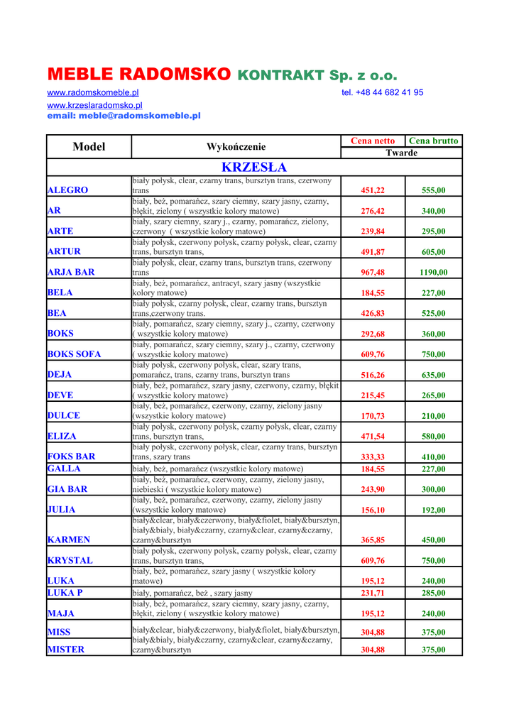 MEBLE RADOMSKO KONTRAKT Sp. z o.o. www.radomskomeble.pl tel. +48 44 682 41 95 www.krzeslaradomsko.pl email: [email protected] Model Wykończenie Cena netto Cena brutto Twarde KRZESŁA ALEGRO AR ARTE ARTUR ARJA BAR BELA BEA BOKS BOKS SOFA DEJA DEVE DULCE ELIZA FOKS BAR GALLA GIA BAR JULIA KARMEN KRYSTAL LUKA LUKA P MAJA MISS MISTER biały połysk, clear, czarny trans, bursztyn trans, czerwony trans biały, beż, pomarańcz, szary ciemny, szary jasny, czarny, błękit, zielony ( wszystkie kolory matowe) biały, szary ciemny, szary j., czarny, pomarańcz, zielony, czerwony ( wszystkie kolory matowe) biały połysk, czerwony połysk, czarny połysk, clear, czarny trans, bursztyn trans, biały połysk, clear, czarny trans, bursztyn trans, czerwony trans biały, beż, pomarańcz, antracyt, szary jasny (wszystkie kolory matowe) biały połysk, czarny połysk, clear, czarny trans, bursztyn trans,czerwony trans. biały, pomarańcz, szary ciemny, szary j., czarny, czerwony ( wszystkie kolory matowe) biały, pomarańcz, szary ciemny, szary j., czarny, czerwony ( wszystkie kolory matowe) biały połysk, czerwony połysk, clear, szary trans, pomarańcz, trans, czarny trans, bursztyn trans biały, beż, pomarańcz, szary jasny, czerwony, czarny, błękit ( wszystkie kolory matowe) biały, beż, pomarańcz, czerwony, czarny, zielony jasny (wszystkie kolory matowe) biały połysk, czerwony połysk, czarny połysk, clear, czarny trans, bursztyn trans, biały połysk, czerwony połysk, clear, czarny trans, bursztyn trans, szary trans biały, beż, pomarańcz (wszystkie kolory matowe) biały, beż, pomarańcz, czerwony, czarny, zielony jasny, niebieski ( wszystkie kolory matowe) biały, beż, pomarańcz, czerwony, czarny, zielony jasny (wszystkie kolory matowe) biały&clear, biały&czerwony, biały&fiolet, biały&bursztyn, biały&biały, biały&czarny, czarny&clear, czarny&czarny, czarny&bursztyn biały połysk, czerwony połysk, czarny połysk, clear, czarny trans, bursztyn trans, biały, beż, pomarańcz, szary jasny ( wszystkie kolory matowe) biały, pomarańcz, beż , szary jasny biały, beż, pomarańcz, szary ciemny, szary jasny, czarny, błękit, zielony ( wszystkie kolory matowe) biały&clear, biały&czerwony, biały&fiolet, biały&bursztyn, biały&biały, biały&czarny, czarny&clear, czarny&czarny, czarny&bursztyn 451,22 555,00 276,42 340,00 239,84 295,00 491,87 605,00 967,48 1190,00 184,55 227,00 426,83 525,00 292,68 360,00 609,76 750,00 516,26 635,00 215,45 265,00 170,73 210,00 471,54 580,00 333,33 184,55 410,00 227,00 243,90 300,00 156,10 192,00 365,85 450,00 609,76 750,00 195,12 231,71 240,00 285,00 195,12 240,00 304,88 375,00 304,88 375,00 VIVA biały, beż, pomarańcz, czerwony, czarny ( wszystkie kolory matowe) czerwony, pomarańczowy,zielony, szary, clear biały, beż, pomarańcz, czerwony, czarny, zielony jasny (wszystkie kolory matowe) biały, pomarańcz, czarny, zielony jasny, czarny, niebieski jasny, brąz, szary jasny, szary ciemny ( wszystkie kolory matowe) biały, szary ciemny, brąz, niebieski jasny ( wszystkie kolory matowe) biały, beż, pomarańcz, czerwony, czarny, zielony jasny, czarny, niebieski ( wszystkie kolory matowe) WIKTORIA X-TREME S X-TREME BAR biały połysk, clear, czarny trans, bursztyn trans, szary trans, czerwony, pomarańczowy,zielony, szary, pomarańczowy, szary 471,54 485,37 1182,93 580,00 597,00 1455,00 Wykończenie Cena netto Cena brutto 853,66 934,96 975,61 934,96 975,61 1050,00 1150,00 1200,00 1150,00 1200,00 337,40 415,00 365,85 1528,46 170,73 450,00 1880,00 210,00 300,81 370,00 317,07 390,00 300,81 260,16 370,00 320,00 365,85 450,00 Cena netto Cena brutto 426,83 525,00 565,04 695,00 304,88 375,00 MIU OPAL ROME TIFFI TIFFI 2 Model 184,55 551,22 227,00 678,00 170,73 210,00 203,25 250,00 243,90 300,00 156,10 192,00 STOLIKI ICE fi 60 cm ICE fi 70 cm ICE fi 80 cm ICE 60X60 cm ICE 70X70 cm MAMBO 73 cm MAMBO ALU 73 MAJA 80x80 cm MAJA 140x80 cm POP 70 cm POP 80 cm SOTIE 70 cm QUE 51 cm VORCA 80 cm Model clear clear clear clear clear biały, beż, pomarańcz, szary jasny ( wszystkie kolory matowe) biały, beż, pomarańcz, szary jasny ( wszystkie kolory matowe) biały mat biały mat biały, beż, pomarańcz, czerwony, jasny zielony (wszystkie kolory matowe) biały, beż, pomarańcz, czerwony, jasny zielony (wszystkie kolory matowe) biały, beż, pomarańcz, czerwony, jasny zielony (wszystkie kolory matowe) biały połysk, clear, czarny trans, bursztyn trans biały, beż, pomarańcz, antracyt, czarny, czerwony, jasny zielony (wszystkie kolory matowe) Wykończenie LAMPY DODO NOVA SMART biały połysk, czerwony trans, clear, niebieski trans, róż trans, czarny trans, bursztyn trans, fiolet trans biały połysk, czerwony trans, clear, niebieski trans, róż trans, czarny trans, bursztyn trans, fiolet trans biały połysk, czerwony trans, clear, niebieski trans, róż trans, czarny trans, bursztyn trans, fiolet trans Przedstawiona oferta cenowa nie stanowi oferty w rozumieniu Kodeksu Cywilnego, jest jedynie zaproszeniem do rozpoczęcia negocjacji (zgodnie z art. 71 k.c.).