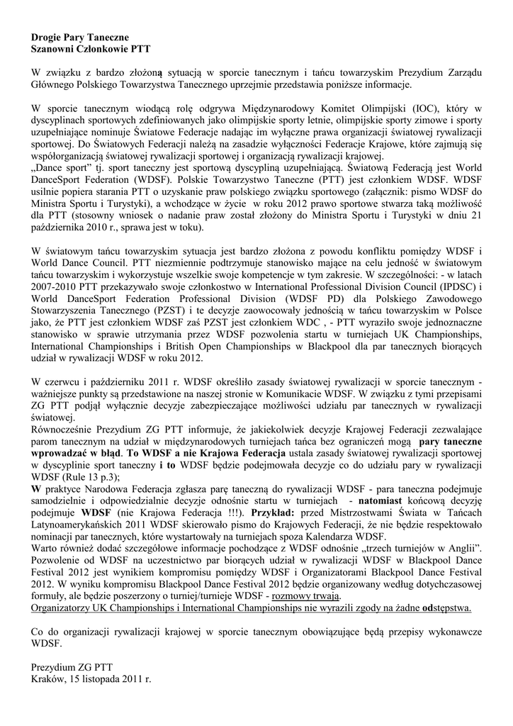 Drogie Pary Taneczne Szanowni Członkowie PTT W związku z bardzo złożoną sytuacją w sporcie tanecznym i tańcu towarzyskim Prezydium Zarządu Głównego Polskiego Towarzystwa Tanecznego uprzejmie przedstawia poniższe informacje. W sporcie tanecznym wiodącą rolę odgrywa Międzynarodowy Komitet Olimpijski (IOC), który w dyscyplinach sportowych zdefiniowanych jako olimpijskie sporty letnie, olimpijskie sporty zimowe i sporty uzupełniające nominuje Światowe Federacje nadając im wyłączne prawa organizacji światowej rywalizacji sportowej. Do Światowych Federacji należą na zasadzie wyłączności Federacje Krajowe, które zajmują się współorganizacją światowej rywalizacji sportowej i organizacją rywalizacji krajowej. „Dance sport” tj. sport taneczny jest sportową dyscypliną uzupełniającą. Światową Federacją jest World DanceSport Federation (WDSF). Polskie Towarzystwo Taneczne (PTT) jest członkiem WDSF. WDSF usilnie popiera starania PTT o uzyskanie praw polskiego związku sportowego (załącznik: pismo WDSF do Ministra Sportu i Turystyki), a wchodzące w życie w roku 2012 prawo sportowe stwarza taką możliwość dla PTT (stosowny wniosek o nadanie praw został złożony do Ministra Sportu i Turystyki w dniu 21 października 2010 r., sprawa jest w toku). W światowym tańcu towarzyskim sytuacja jest bardzo złożona z powodu konfliktu pomiędzy WDSF i World Dance Council. PTT niezmiennie podtrzymuje stanowisko mające na celu jedność w światowym tańcu towarzyskim i wykorzystuje wszelkie swoje kompetencje w tym zakresie. W szczególności: - w latach 2007-2010 PTT przekazywało swoje członkostwo w International Professional Division Council (IPDSC) i World DanceSport Federation Professional Division (WDSF PD) dla Polskiego Zawodowego Stowarzyszenia Tanecznego (PZST) i te decyzje zaowocowały jednością w tańcu towarzyskim w Polsce jako, że PTT jest członkiem WDSF zaś PZST jest członkiem WDC , - PTT wyraziło swoje jednoznaczne stanowisko w sprawie utrzymania przez WDSF pozwolenia startu w turniejach UK Championships, International Championships i British Open Championships w Blackpool dla par tanecznych biorących udział w rywalizacji WDSF w roku 2012. W czerwcu i październiku 2011 r. WDSF określiło zasady światowej rywalizacji w sporcie tanecznym ważniejsze punkty są przedstawione na naszej stronie w Komunikacie WDSF. W związku z tymi przepisami ZG PTT podjął wyłącznie decyzje zabezpieczające możliwości udziału par tanecznych w rywalizacji światowej. Równocześnie Prezydium ZG PTT informuje, że jakiekolwiek decyzje Krajowej Federacji zezwalające parom tanecznym na udział w międzynarodowych turniejach tańca bez ograniczeń mogą pary taneczne wprowadzać w błąd. To WDSF a nie Krajowa Federacja ustala zasady światowej rywalizacji sportowej w dyscyplinie sport taneczny i to WDSF będzie podejmowała decyzje co do udziału pary w rywalizacji WDSF (Rule 13 p.3); W praktyce Narodowa Federacja zgłasza parę taneczną do rywalizacji WDSF - para taneczna podejmuje samodzielnie i odpowiedzialnie decyzje odnośnie startu w turniejach - natomiast końcową decyzję podejmuje WDSF (nie Krajowa Federacja !!!). Przykład: przed Mistrzostwami Świata w Tańcach Latynoamerykańskich 2011 WDSF skierowało pismo do Krajowych Federacji, że nie będzie respektowało nominacji par tanecznych, które wystartowały na turniejach spoza Kalendarza WDSF. Warto również dodać szczegółowe informacje pochodzące z WDSF odnośnie „trzech turniejów w Anglii”. Pozwolenie od WDSF na uczestnictwo par biorących udział w rywalizacji WDSF w Blackpool Dance Festival 2012 jest wynikiem kompromisu pomiędzy WDSF i Organizatorami Blackpool Dance Festival 2012. W wyniku kompromisu Blackpool Dance Festival 2012 będzie organizowany według dotychczasowej formuły, ale będzie poszerzony o turniej/turnieje WDSF - rozmowy trwają. Organizatorzy UK Championships i International Championships nie wyrazili zgody na żadne odstępstwa. Co do organizacji rywalizacji krajowej w sporcie tanecznym obowiązujące będą przepisy wykonawcze WDSF. Prezydium ZG PTT Kraków, 15 listopada 2011 r.