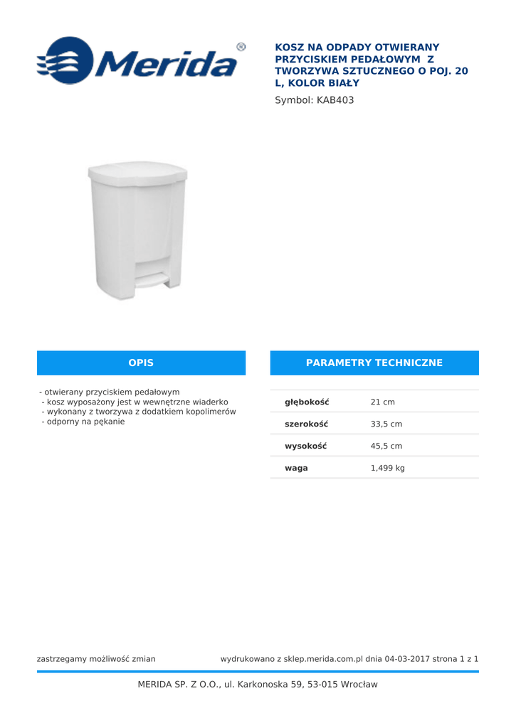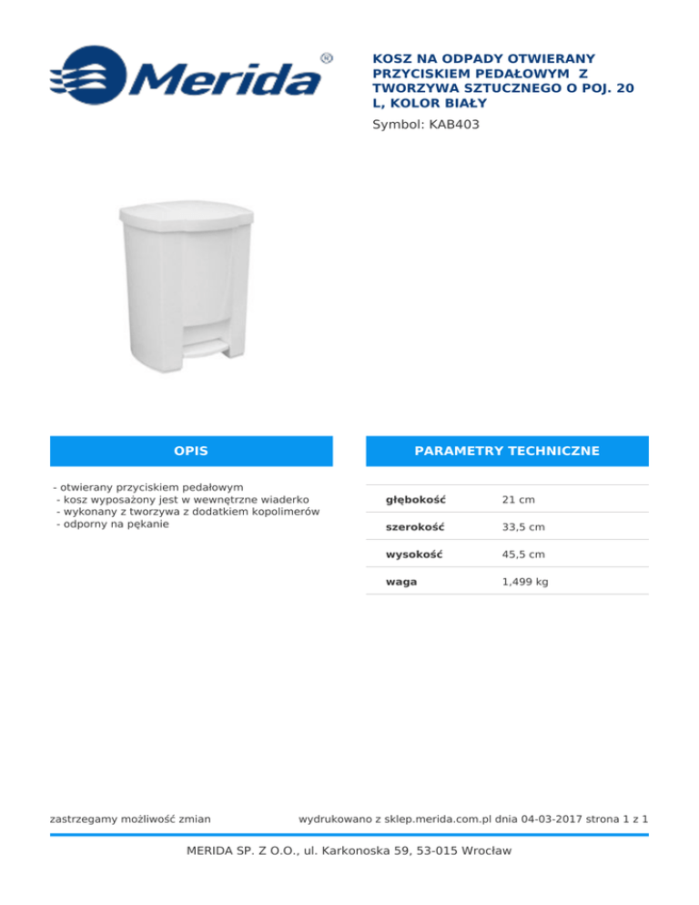 KOSZ NA ODPADY OTWIERANY PRZYCISKIEM PEDAŁOWYM Z TWORZYWA SZTUCZNEGO O POJ. 20 L, KOLOR BIAŁY Symbol: KAB403 OPIS PARAMETRY TECHNICZNE - otwierany przyciskiem pedałowym - kosz wyposażony jest w wewnętrzne wiaderko - wykonany z tworzywa z dodatkiem kopolimerów - odporny na pękanie zastrzegamy możliwość zmian głębokość 21 cm szerokość 33,5 cm wysokość 45,5 cm waga 1,499 kg wydrukowano z sklep.merida.com.pl dnia 04-03-2017 strona 1 z 1 MERIDA SP. Z O.O., ul. Karkonoska 59, 53-015 Wrocław
